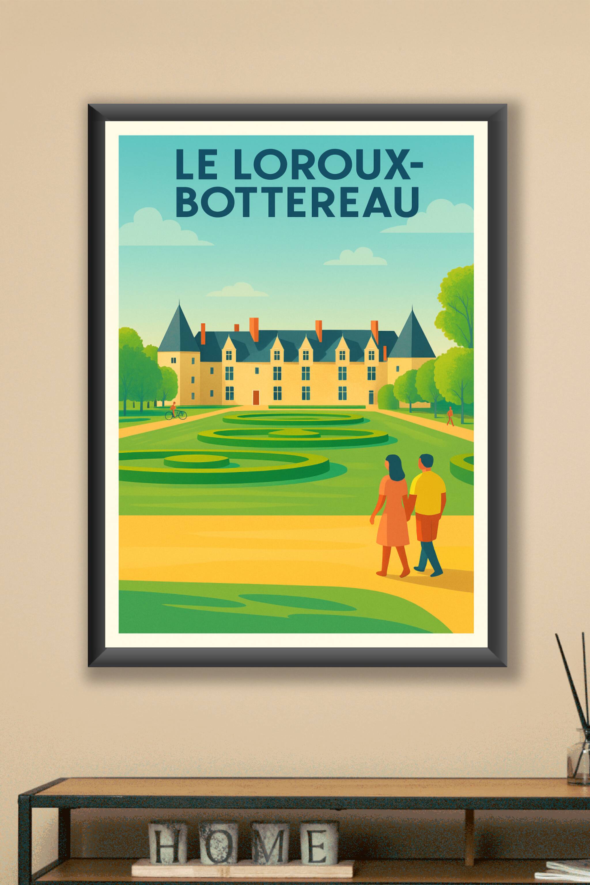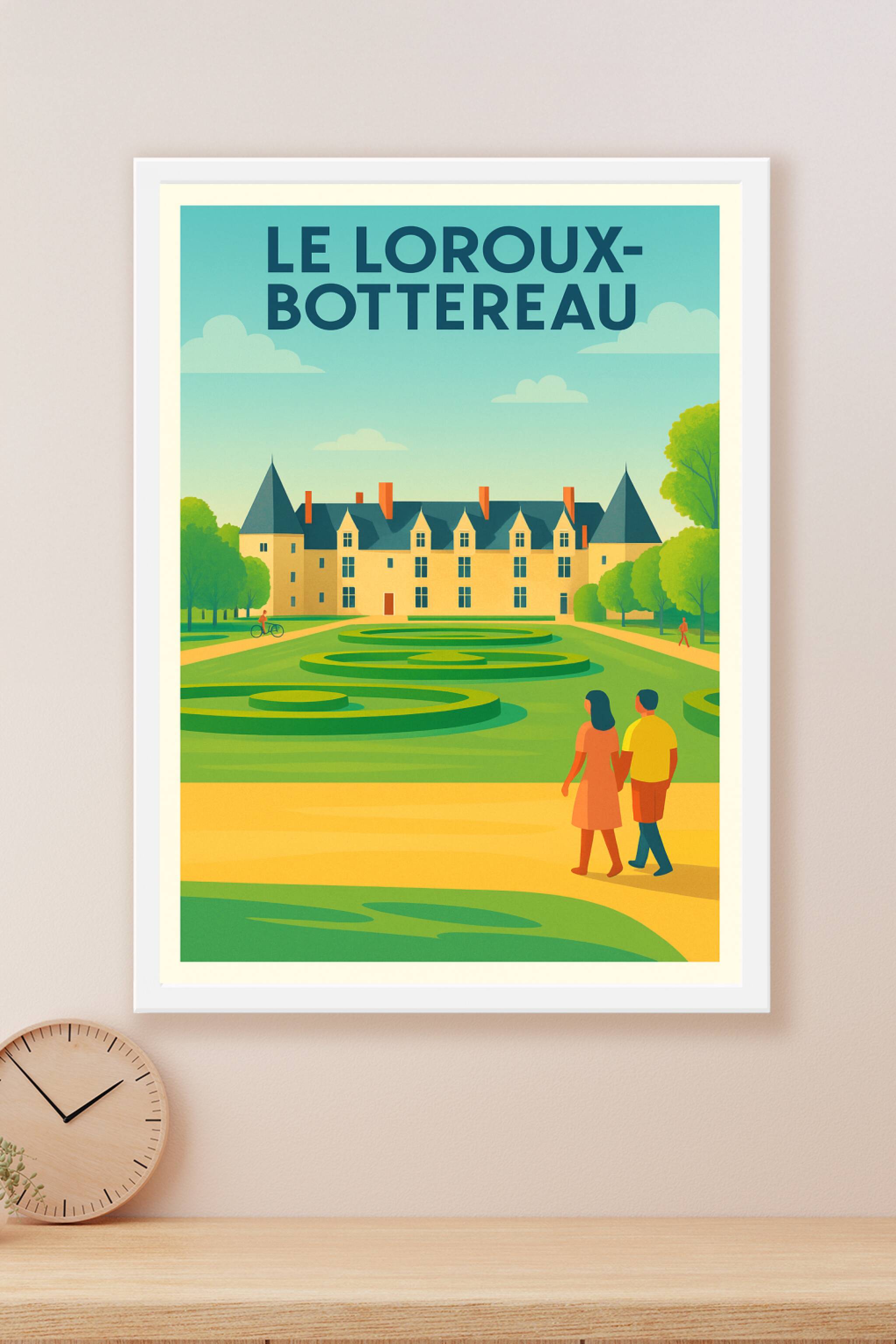 Découvrez l'élégance intemporelle du Loroux-Bottereau avec cette affiche illustrée représentant son prestigieux château entouré de somptueux jardin...