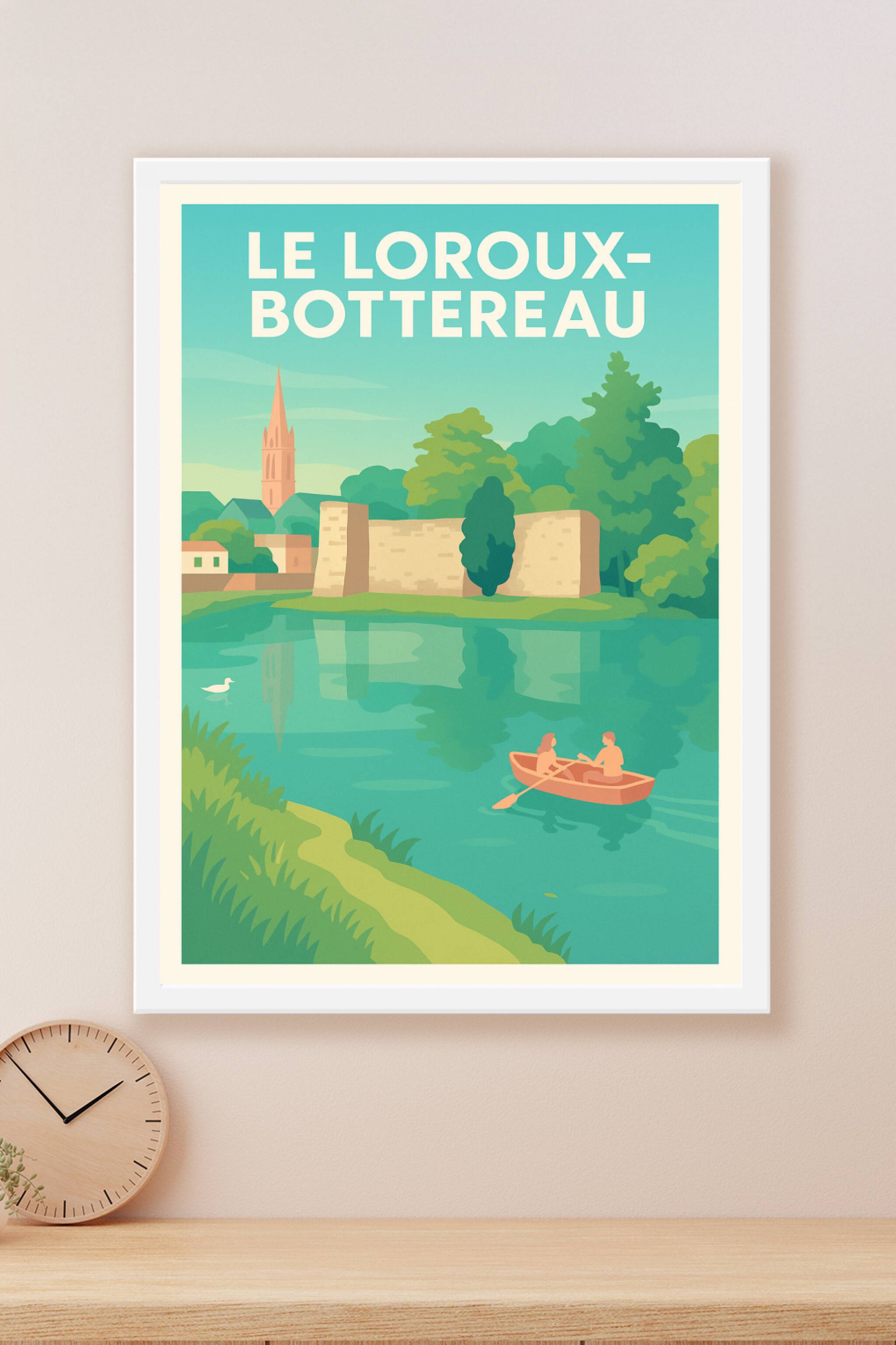 Découvrez la douceur de vivre du Loroux-Bottereau avec ce poster illustré mettant en scène un couple en barque sur une rivière paisible, entourée d...