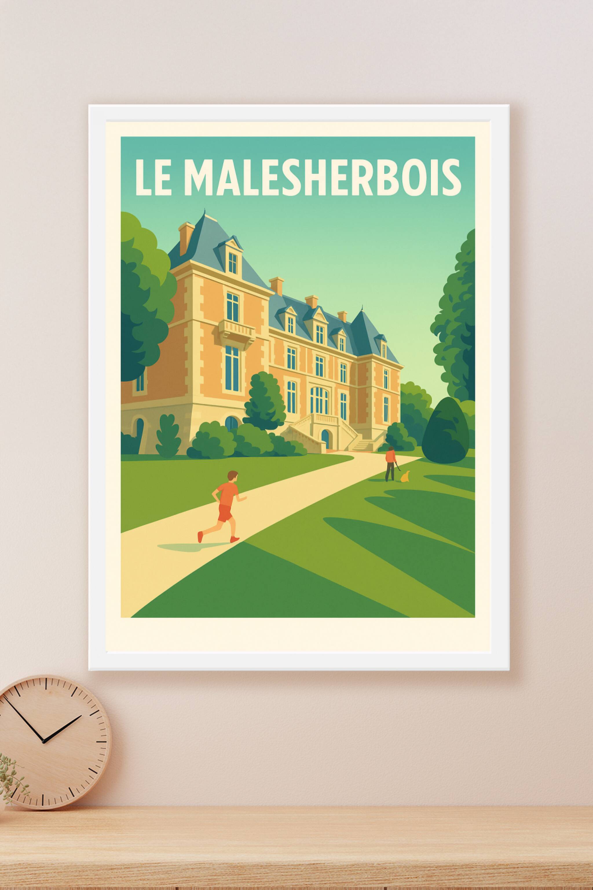 Découvrez le charme intemporel de Le Malesherbois à travers cette affiche illustrée qui met en scène un élégant manoir entouré de verdure et d'acti...