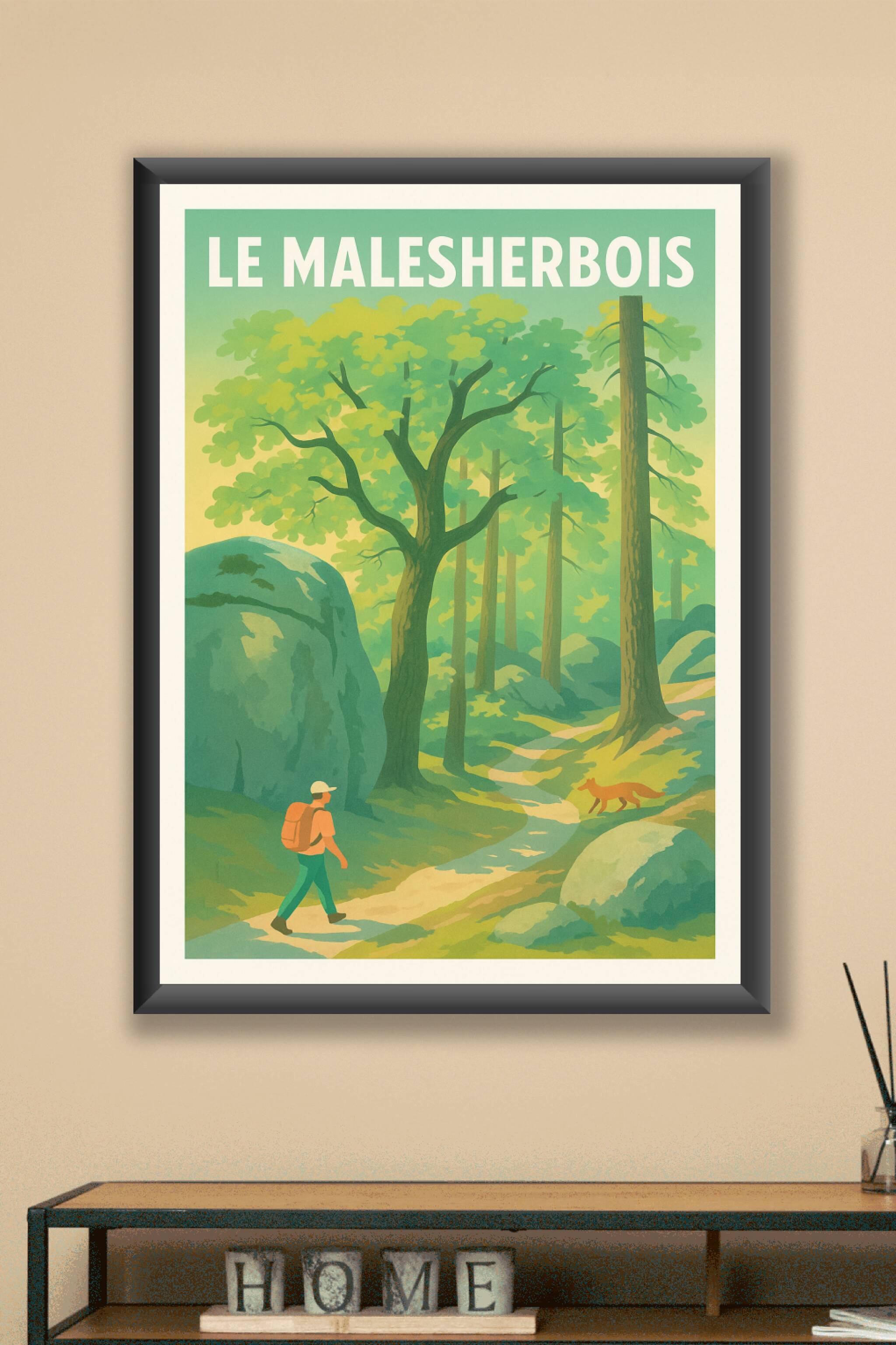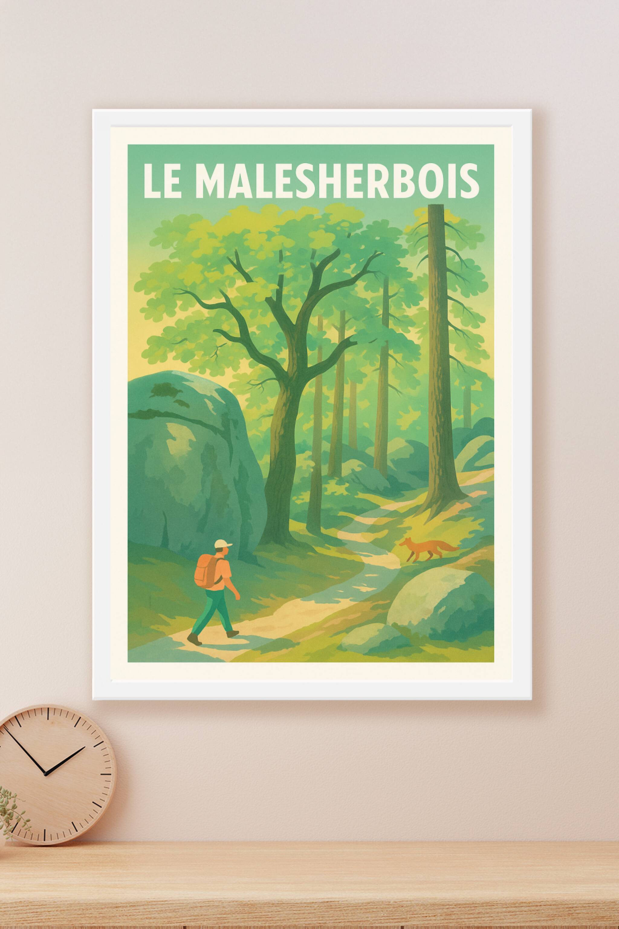 Découvrez la sérénité et la beauté naturelle du Malesherbois avec cette affiche illustrée qui capture une promenade en forêt baignée de lumière dou...