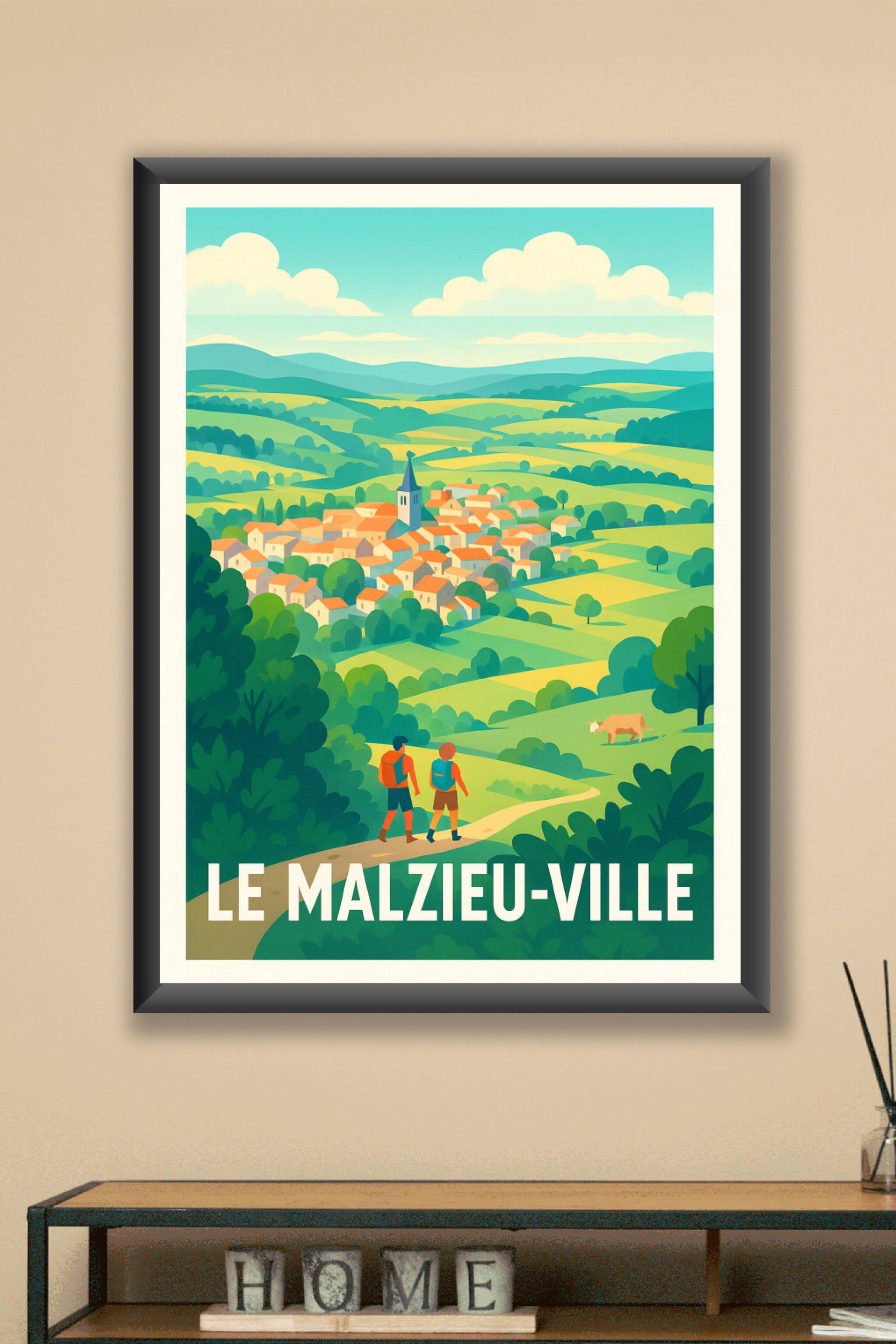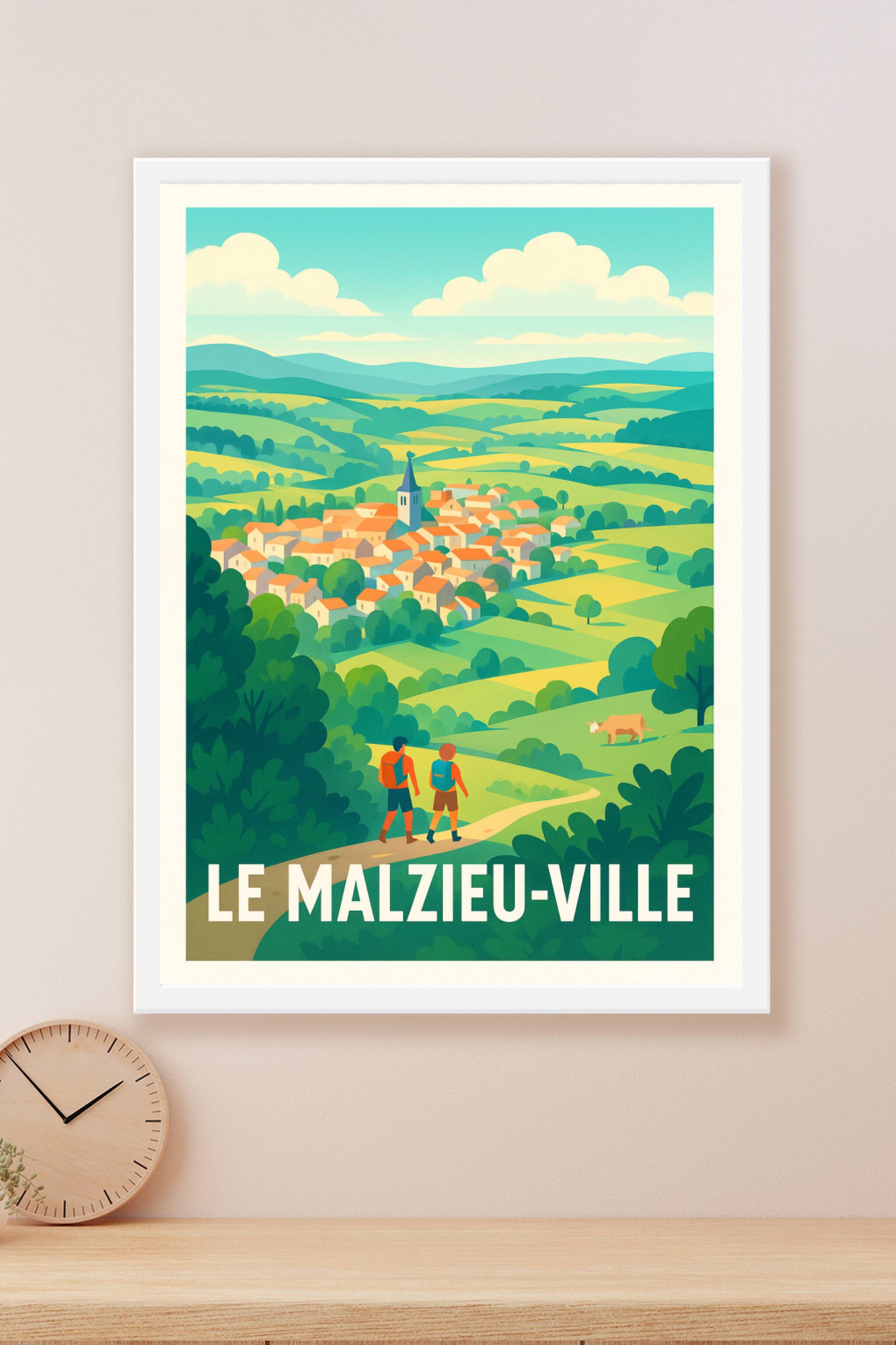Découvrez le charme bucolique de Le Malzieu-Ville avec cette affiche illustrée, qui capture la sérénité et la beauté de ce petit village niché au m...