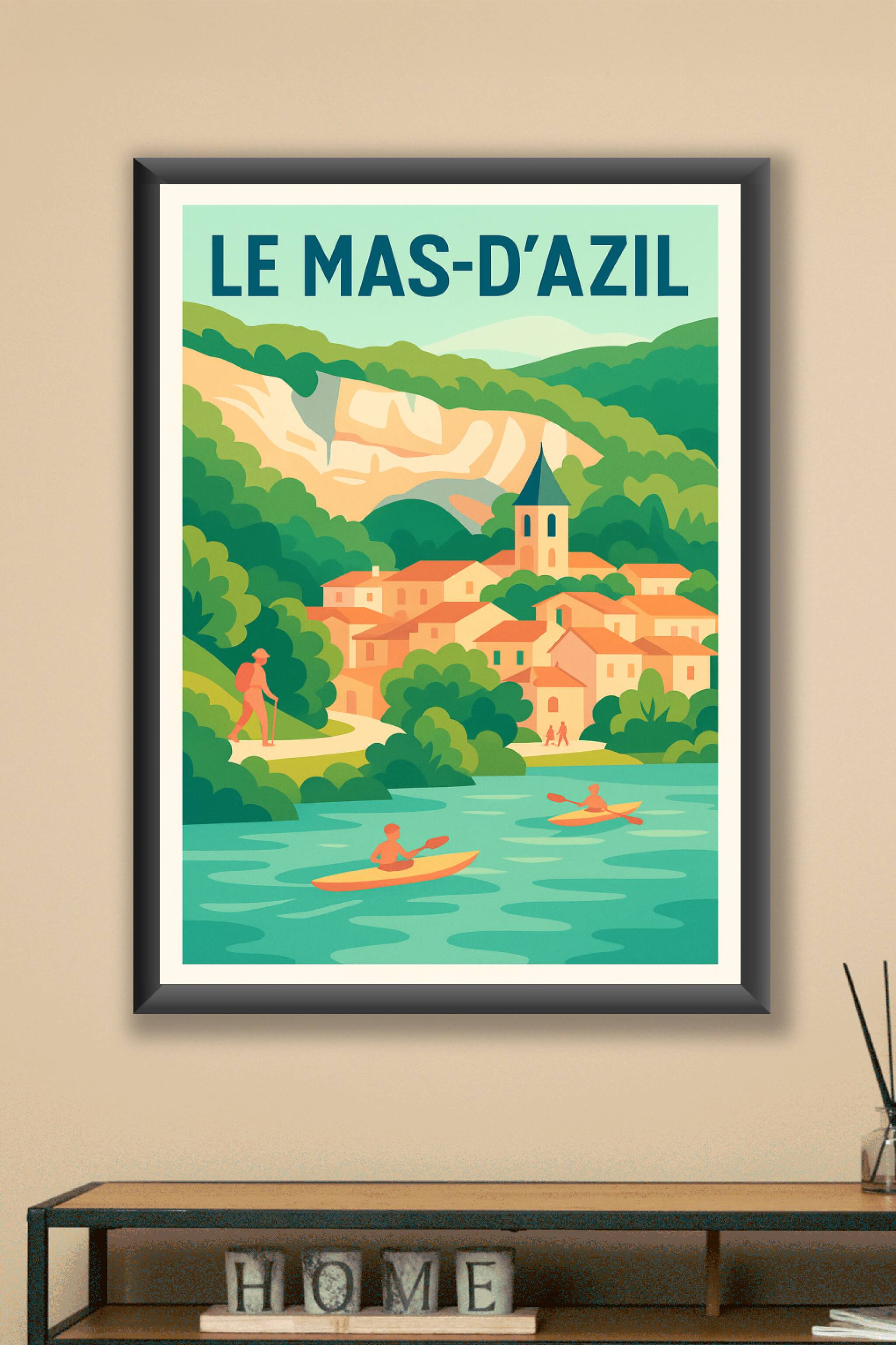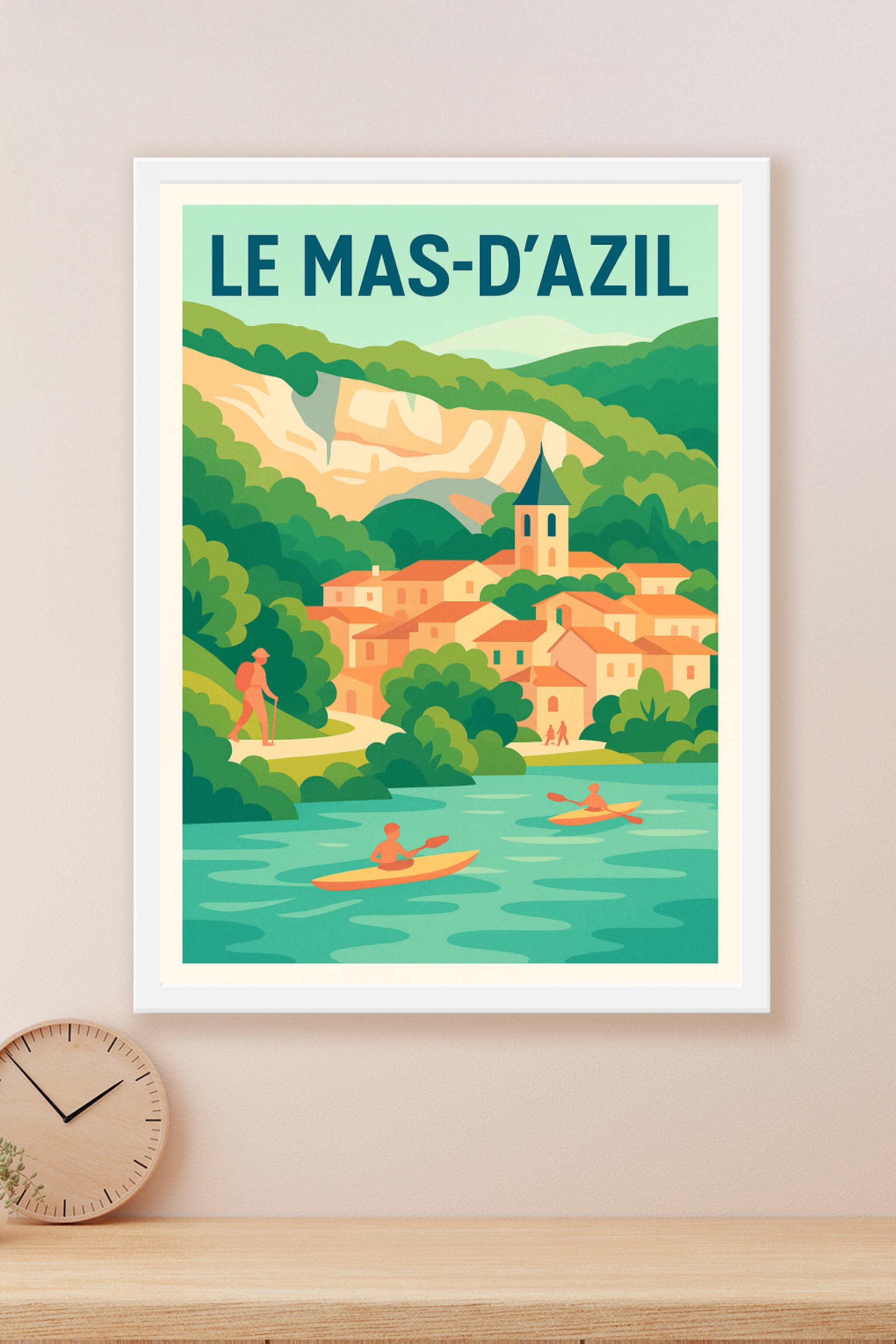 Découvrez le charme authentique du Mas-d'Azil avec cette affiche illustrée qui met en avant son village pittoresque niché dans un écrin de verdure ...