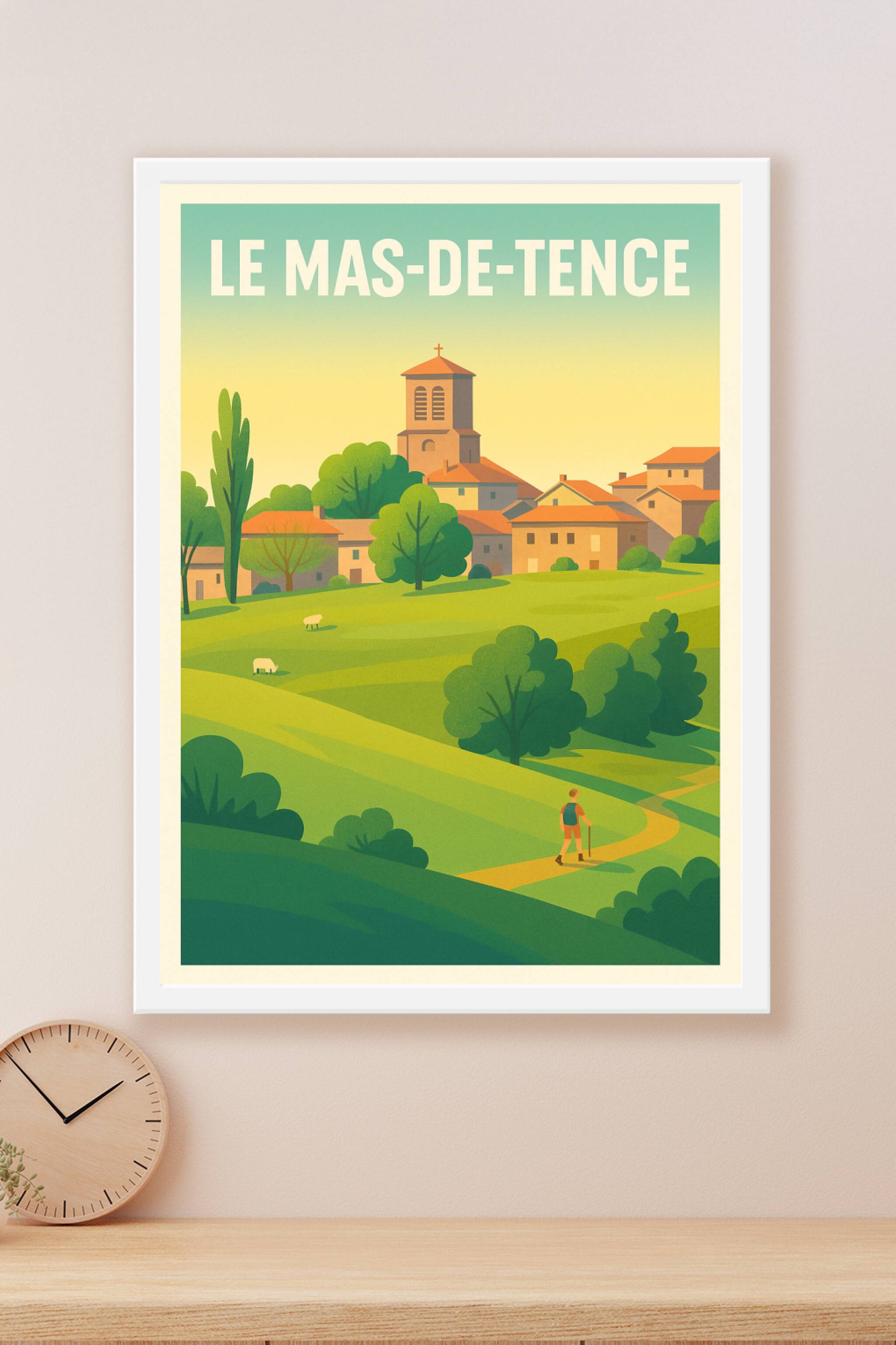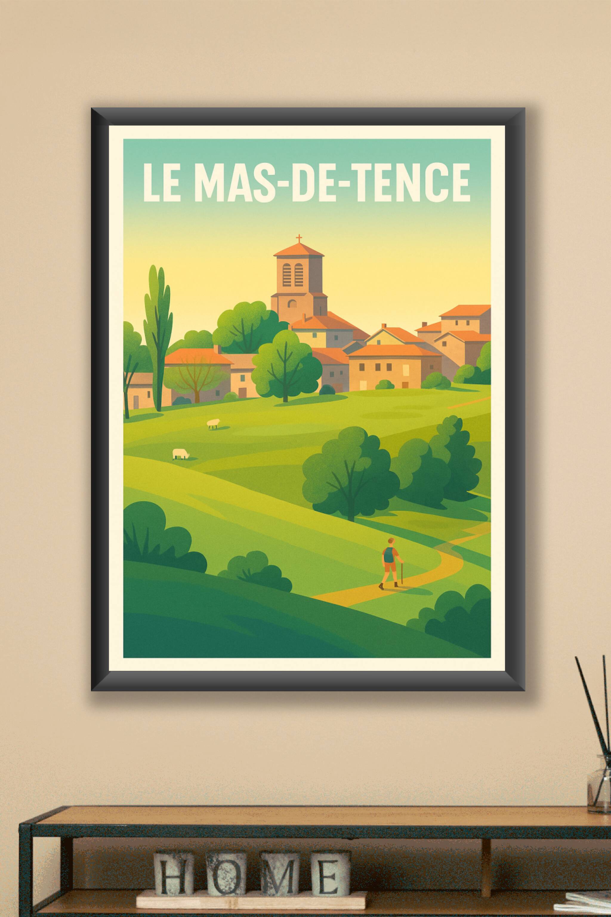 Découvrez la sérénité champêtre du Mas-de-Tence avec cette affiche au style vintage et couleurs douces, illustrant un village paisible niché au cœu...