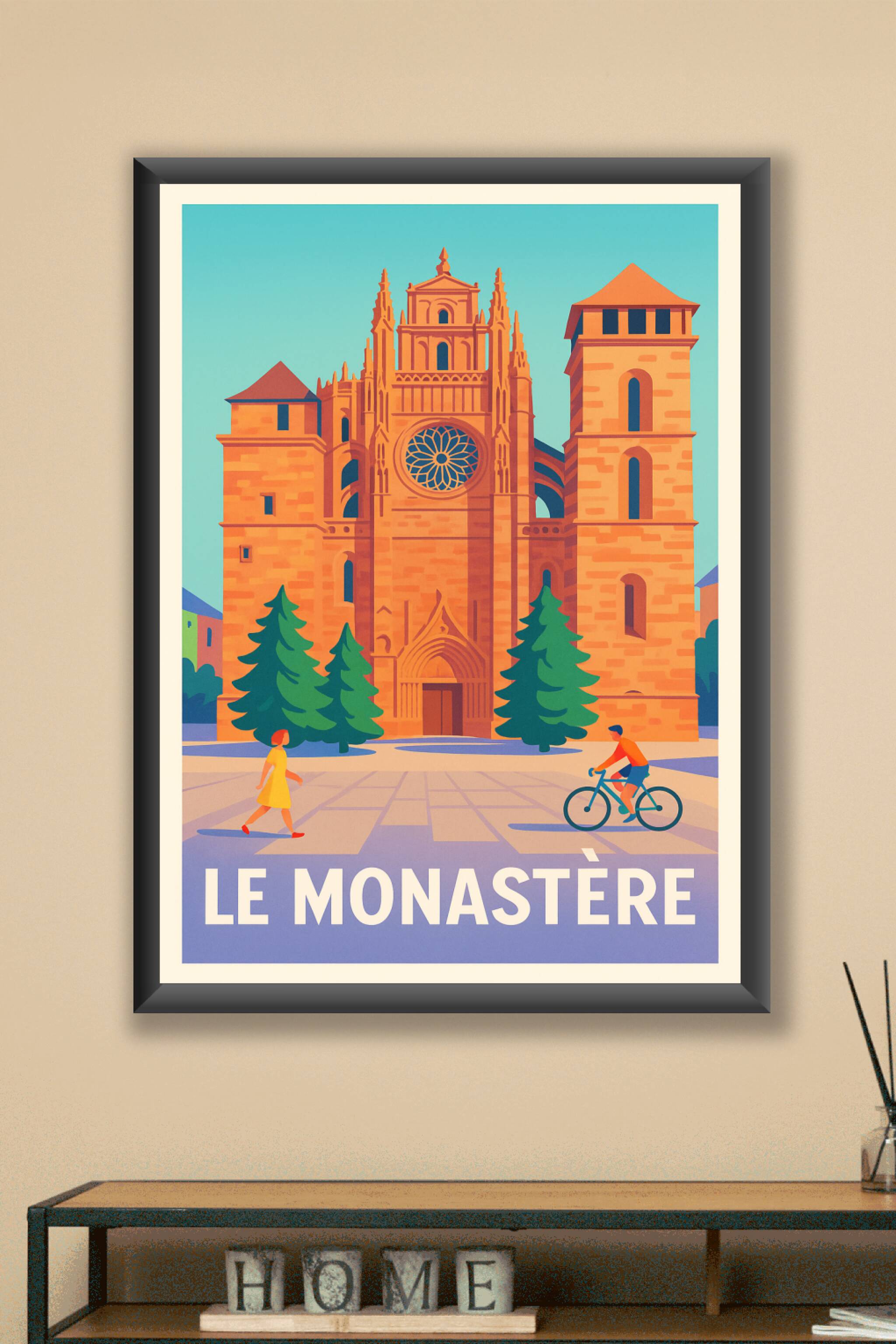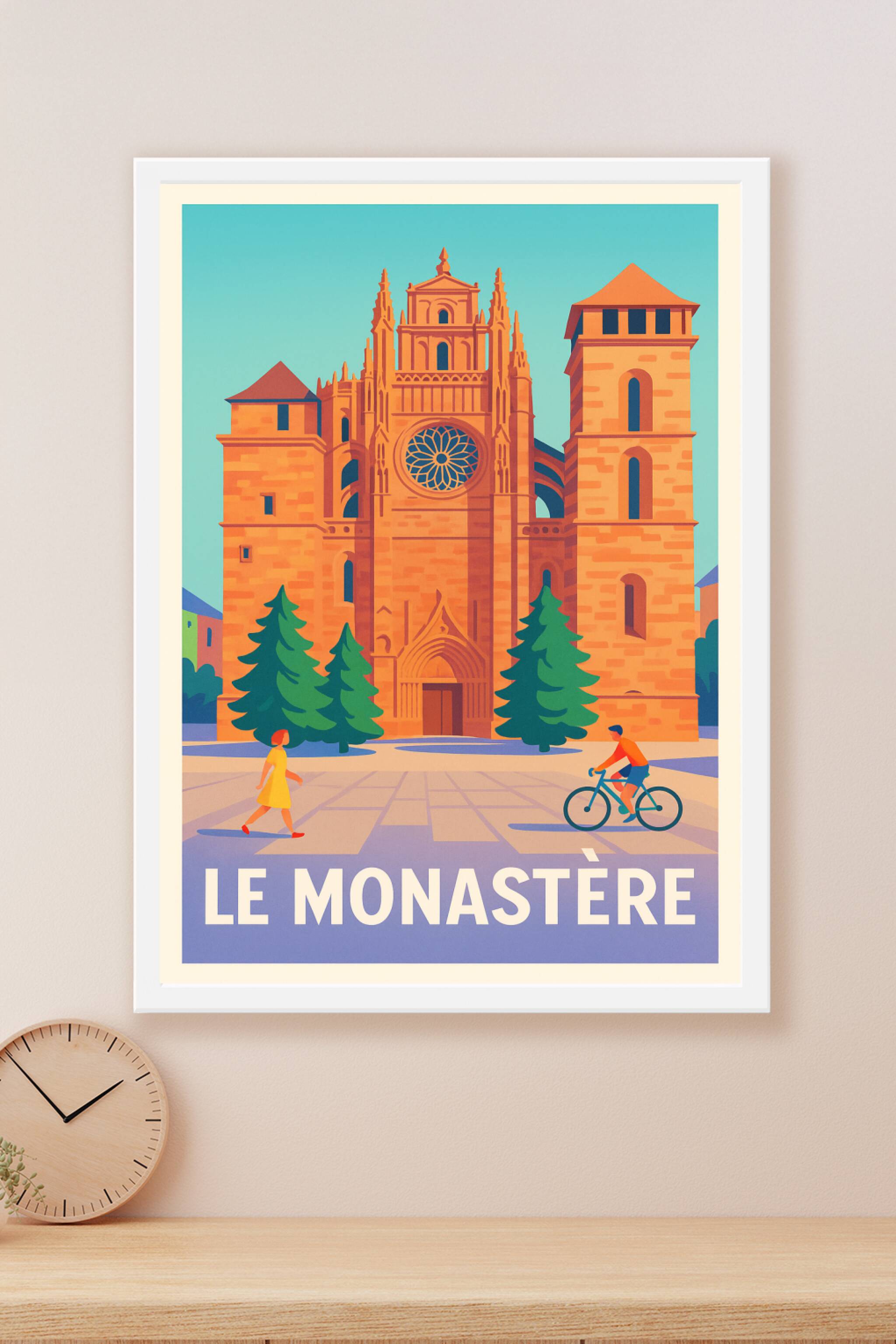 Découvrez le charme vibrant du Monastère à travers cette affiche illustrée aux couleurs chaudes et lumineuses. La majestueuse architecture de ce mo...