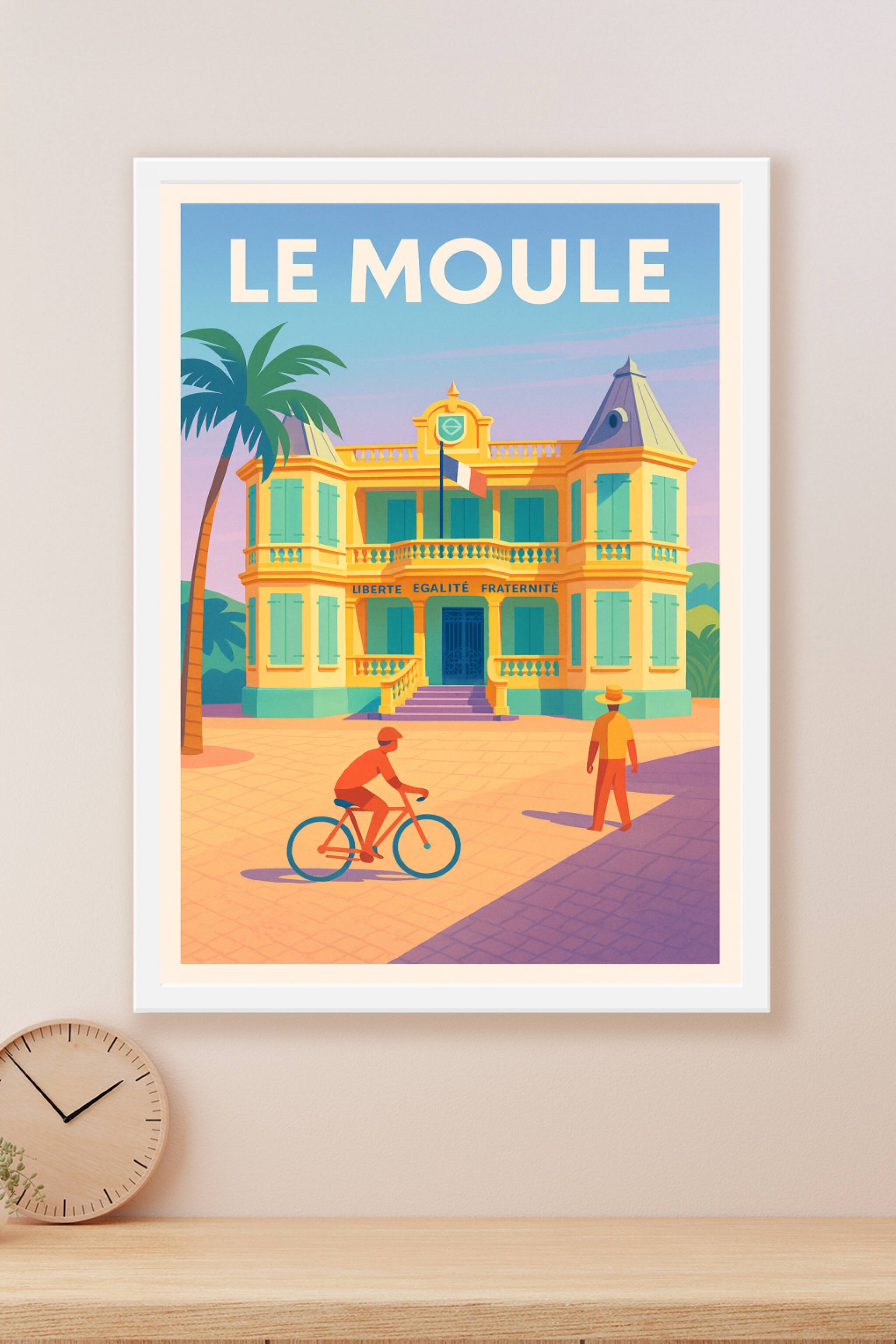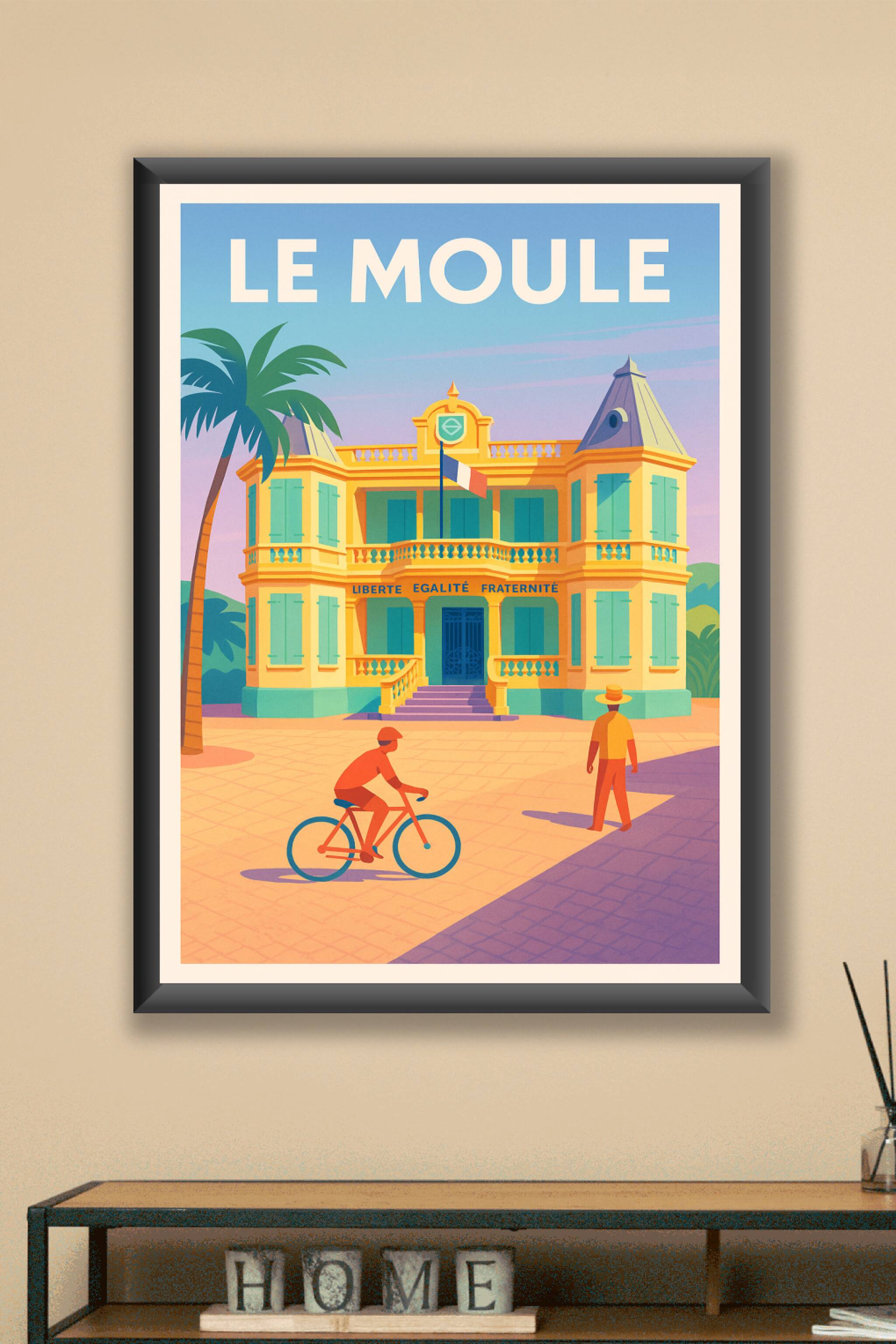 Découvrez Le Moule sous un jour ensoleillé avec ce poster vibrant qui célèbre l'architecture coloniale et l'atmosphère détendue de cette ville. L'a...