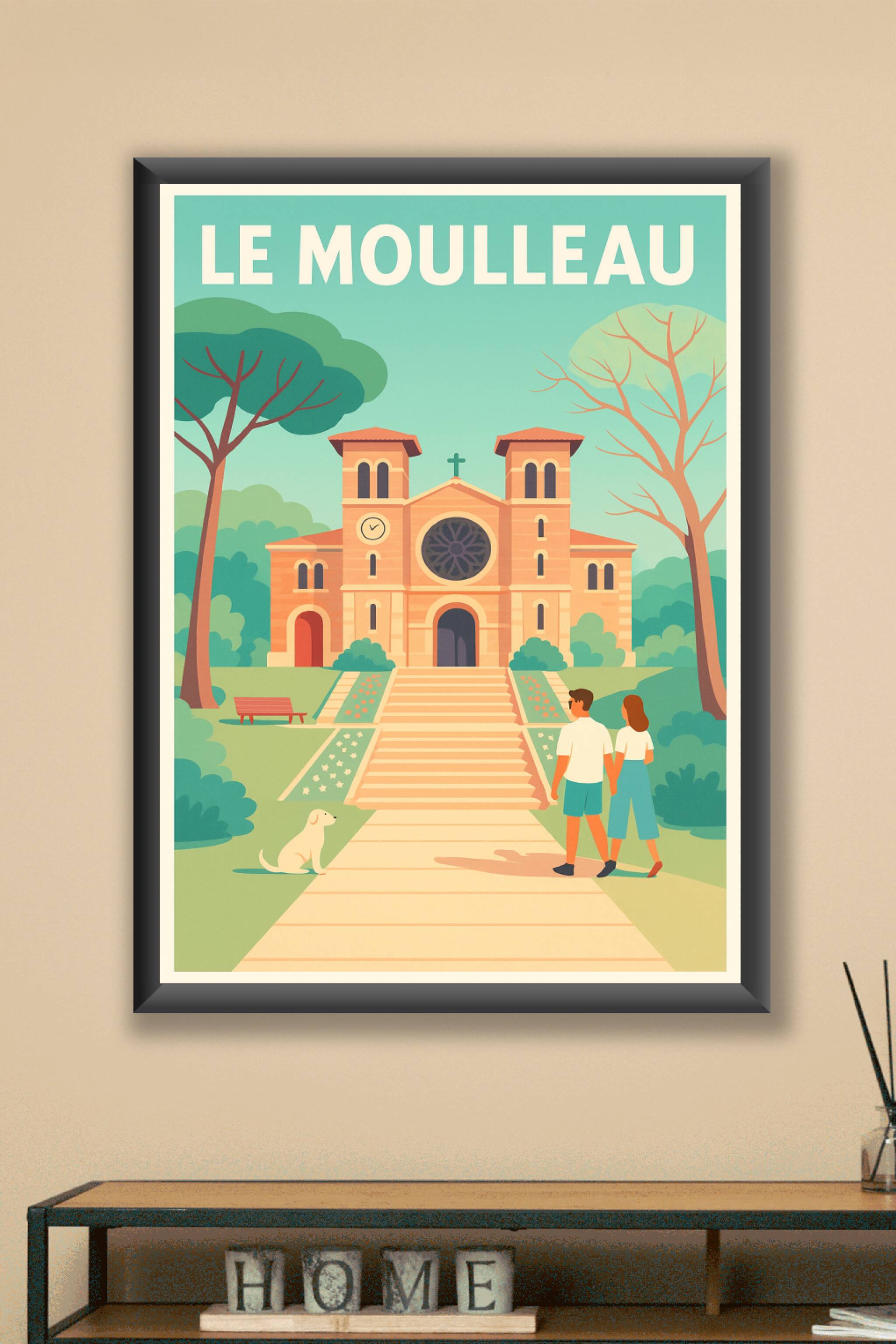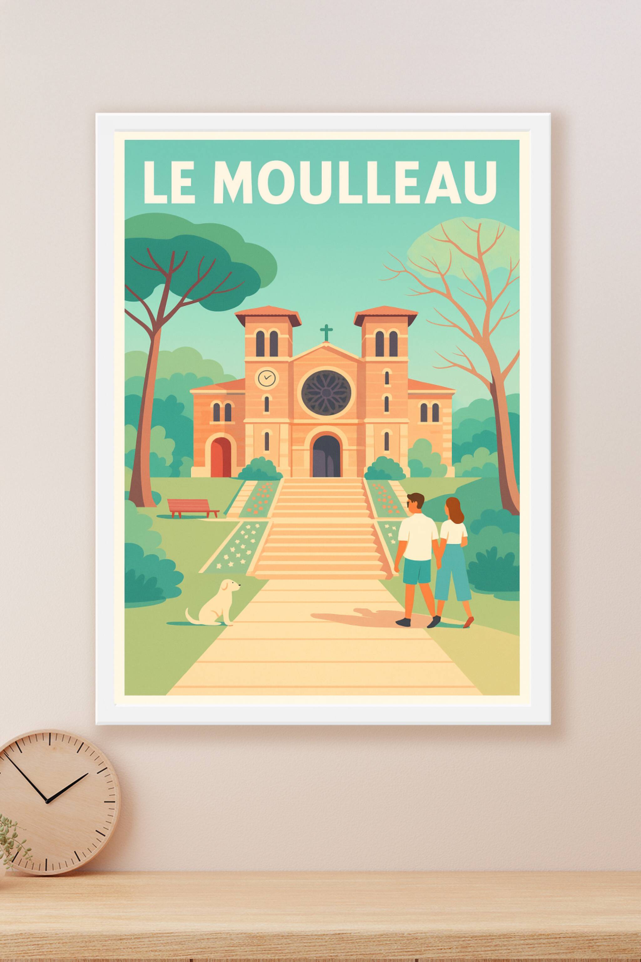 Découvrez la beauté paisible du Moulleau à travers cette affiche illustrée mettant en scène son église emblématique et ses espaces verdoyants. Cett...