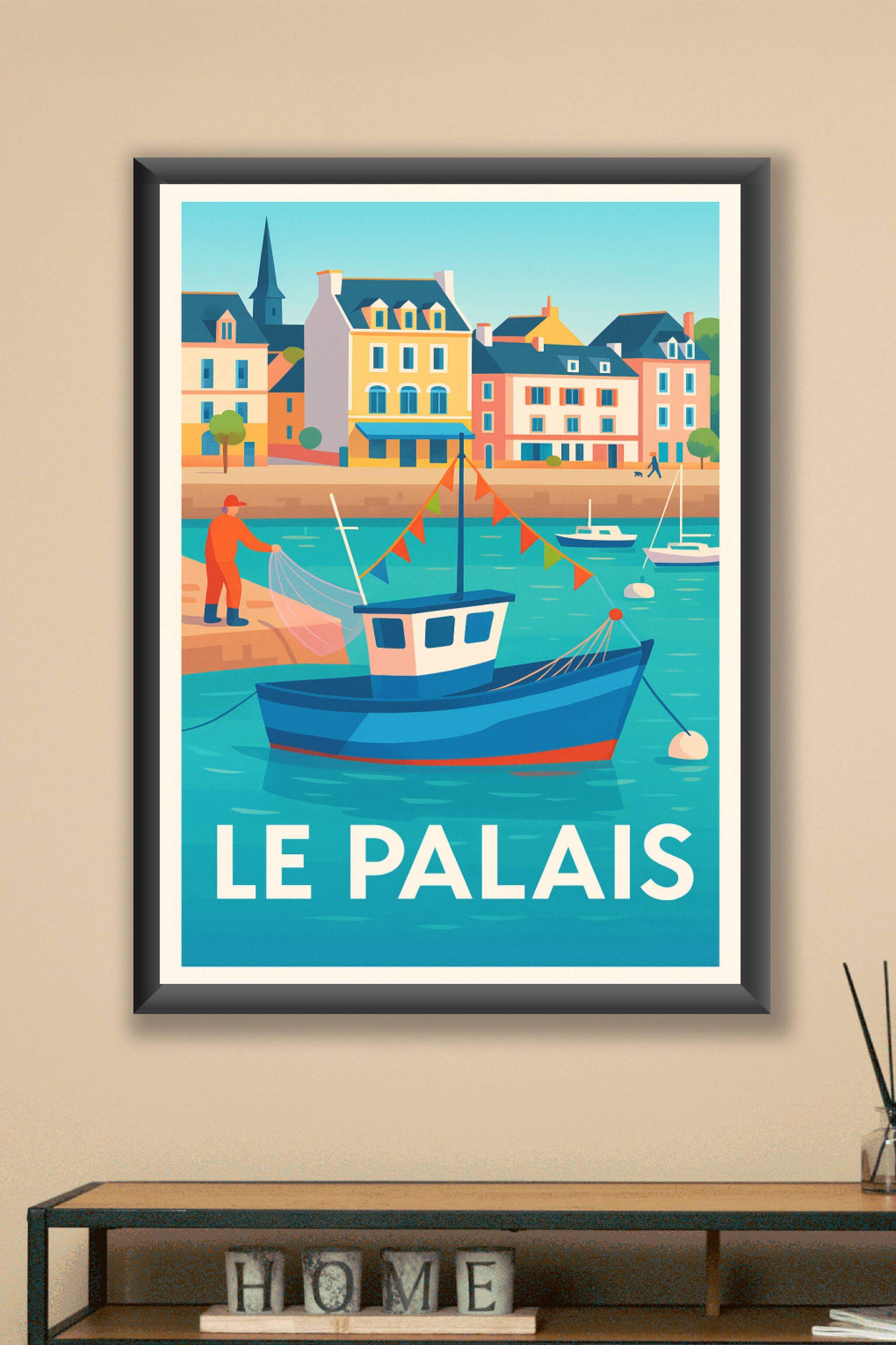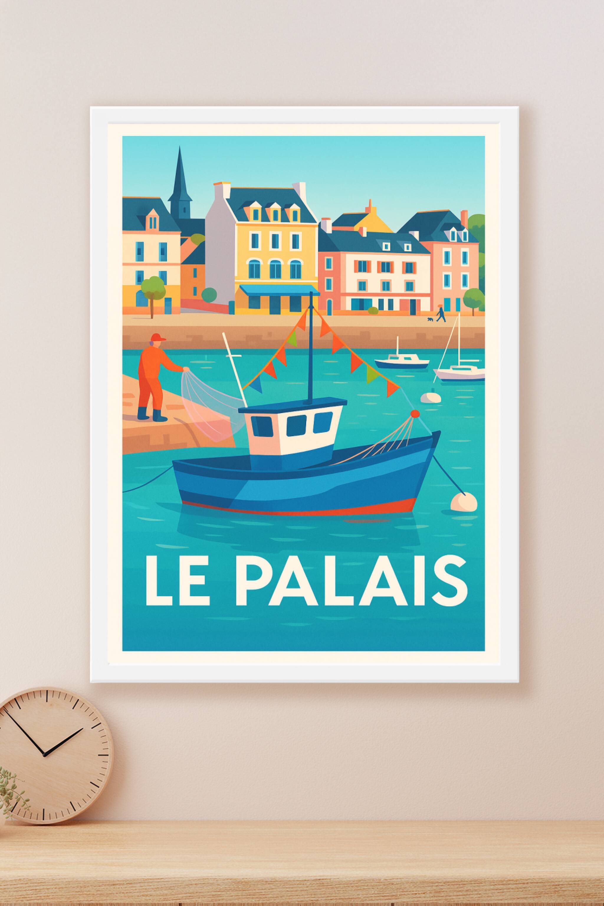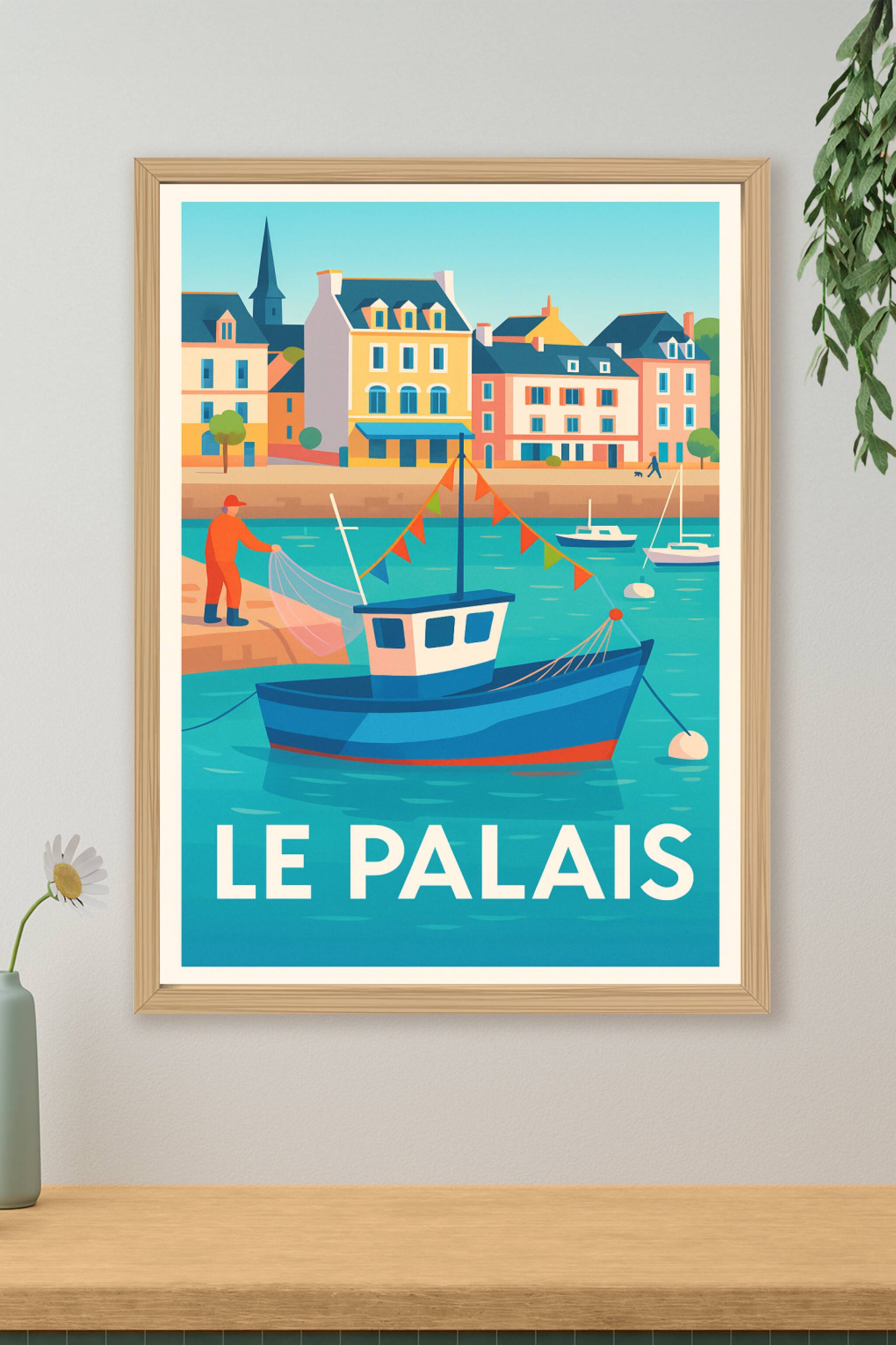 Découvrez l'atmosphère charmante et vivante du port de Le Palais avec cette affiche illustrée aux tons vibrants et lumineux. Le poster met en scène...
