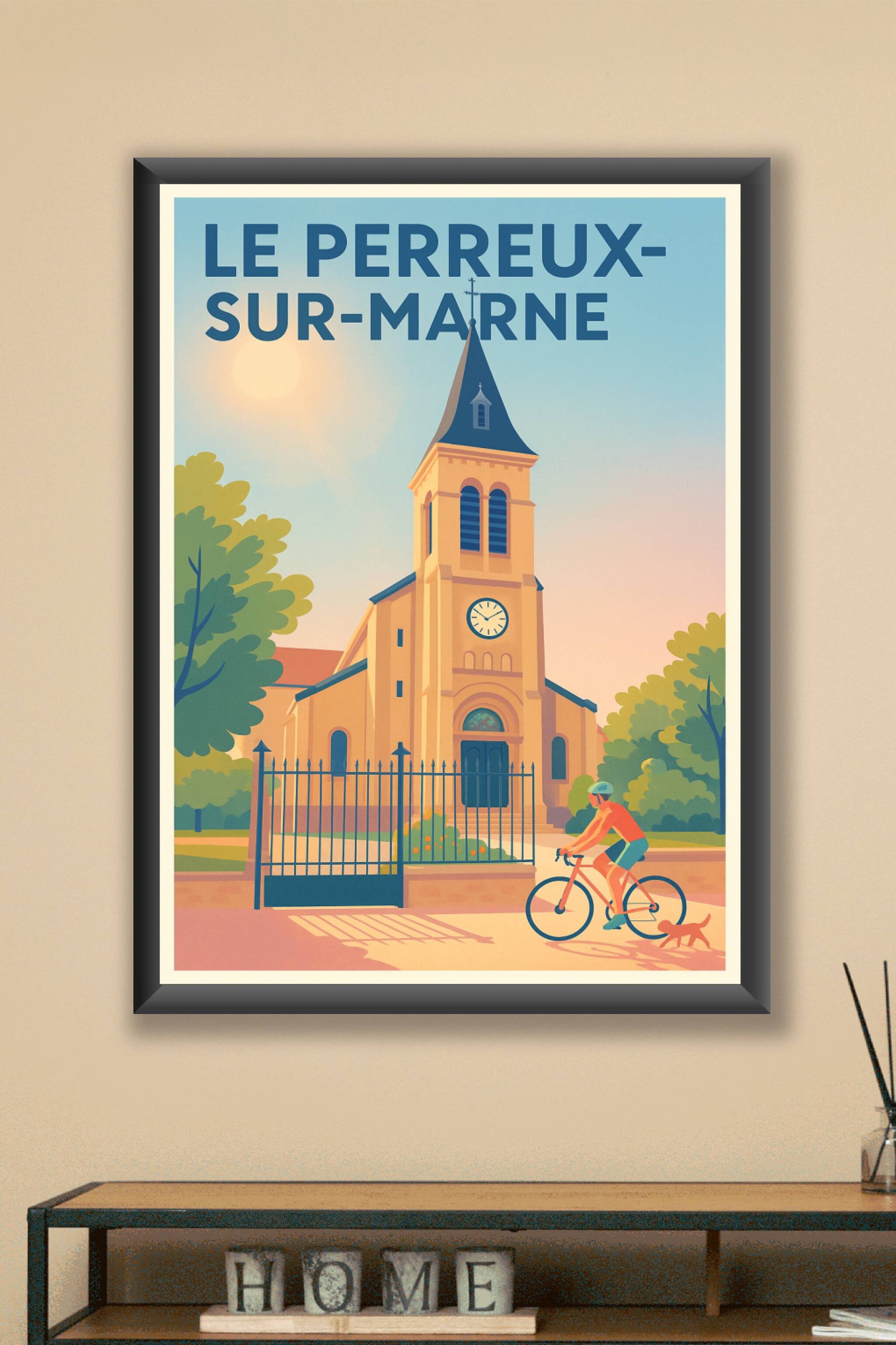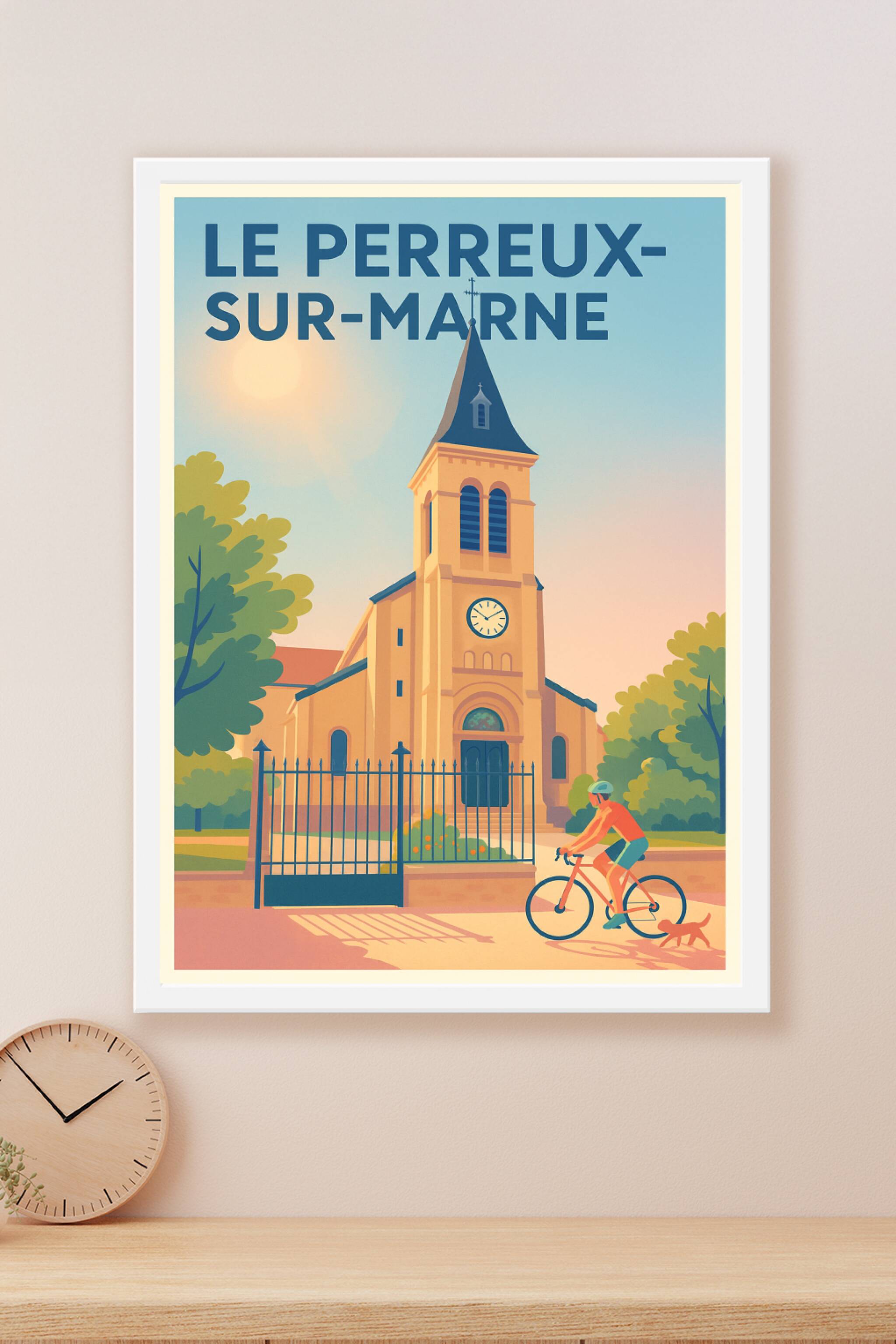 Découvrez Le Perreux-sur-Marne à travers cette affiche illustrée au style vintage, mettant en avant l’une de ses charmantes églises baignée par la douce lumière du soleil couchant. L’ambiance paisible et conviviale est renforcée par la présence d’un cycliste accompagnée de son chien, symbolisant le rythme de vie détendu de cette jolie ville. Ce poster est imprimé en tirage "Fine Art" sur un papier 305g coton de haute qualité, garantissant une reproduction fidèle et une longévité exceptionnelle des couleurs. Disponible en formats A1 à A4, avec ou sans cadre, cette affiche est le choix idéal pour apporter une touche d’authenticité et de charme à votre décoration intérieure. Fabriquée avec soin en France, elle constitue également un cadeau parfait pour les amoureux de Le Perreux-sur-Marne et de ses paysages apaisants.