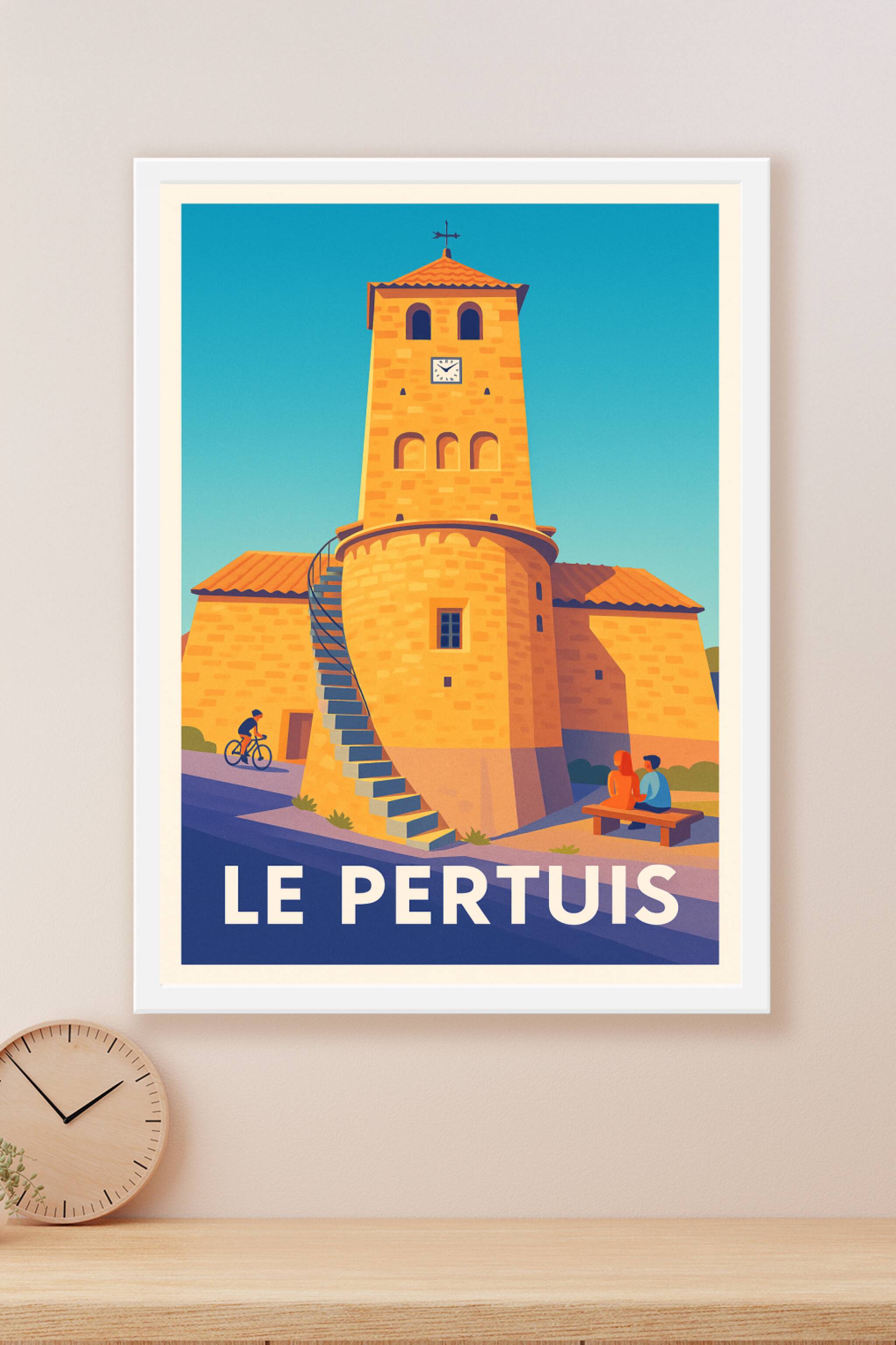 Découvrez le charme authentique de Le Pertuis avec cette affiche illustrée qui met en scène son emblématique tour horloge en pierres dorées sous un ciel bleu éclatant. Ce poster, empreint de sérénité et de douceur, est parfait pour apporter une touche historique et conviviale à votre décoration intérieure. Imprimée en tirage "Fine Art" sur papier 305g coton, cette affiche garantit une qualité d'impression exceptionnelle, avec des couleurs vives et une grande finesse de détails. Disponible en formats A1 à A4, avec ou sans cadre, elle s'adapte à tous les espaces, que ce soit pour embellir votre salon, bureau ou chambre. Offrez-vous ou à vos proches ce souvenir élégant et durable de Le Pertuis, 100% fabrication française.