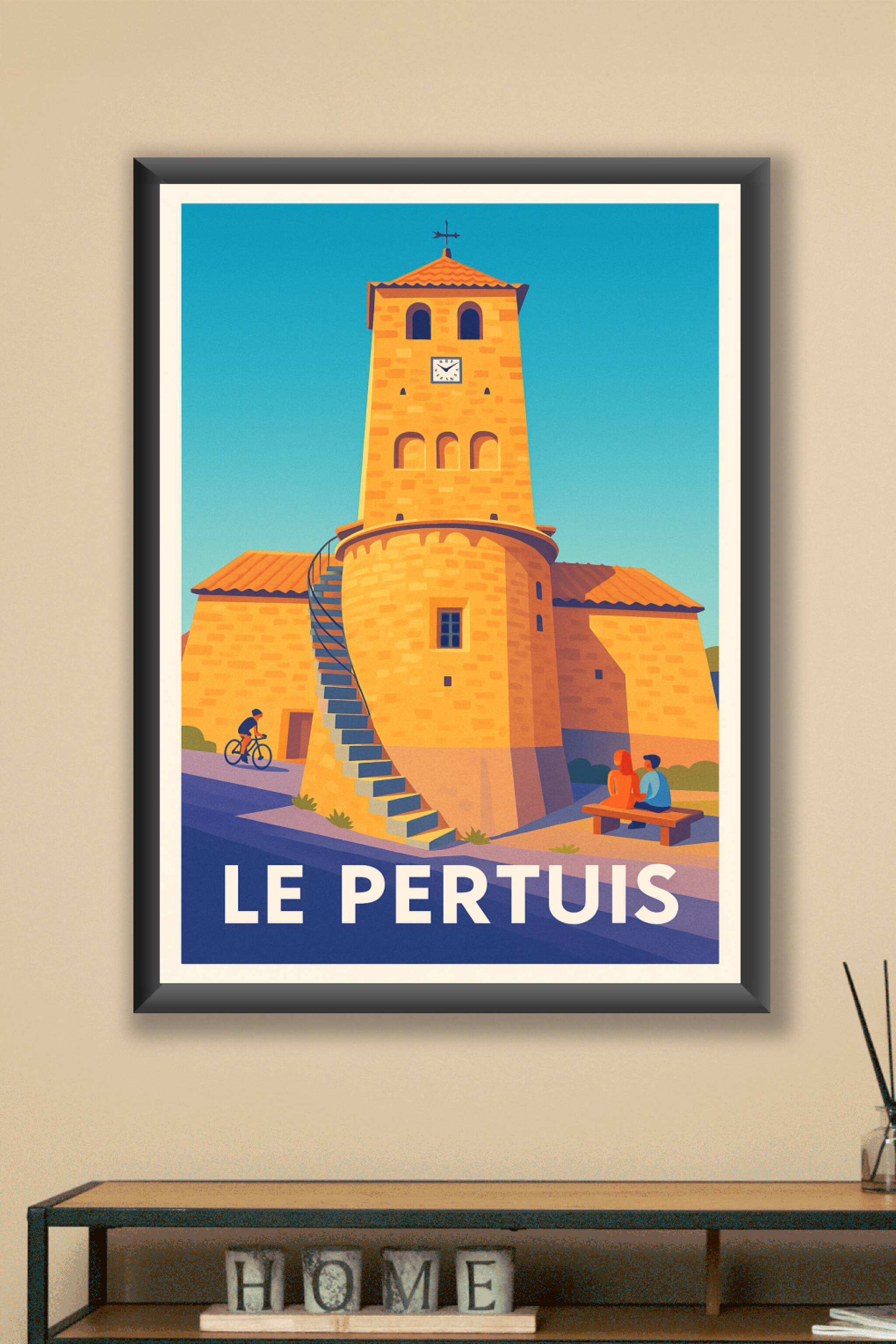 Découvrez le charme authentique de Le Pertuis avec cette affiche illustrée qui met en scène son emblématique tour horloge en pierres dorées sous un...