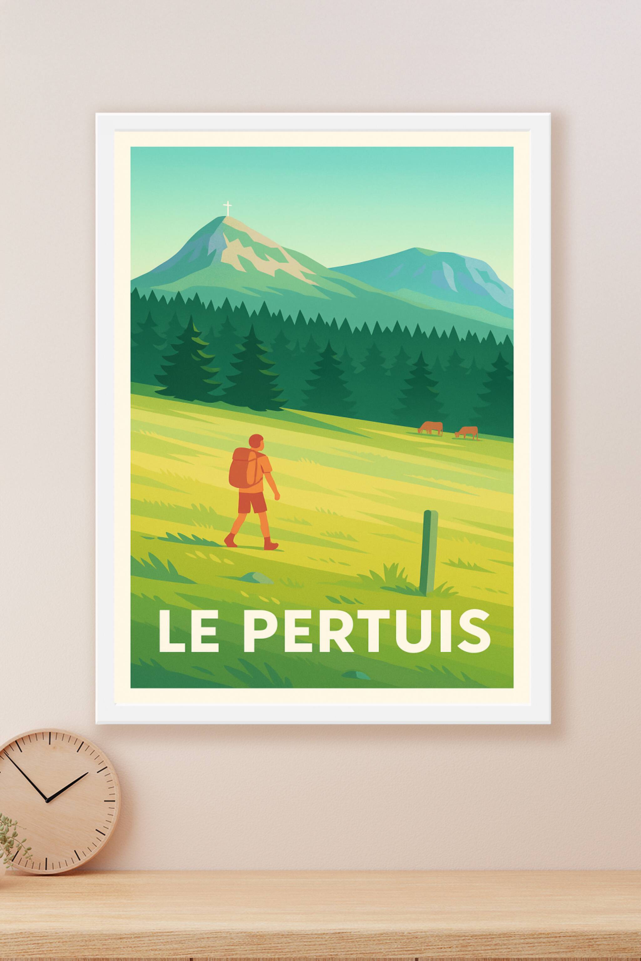 Découvrez la sérénité des paysages du Pertuis avec cette affiche illustrée reprenant les doux reliefs de la montagne et la richesse des forêts envi...