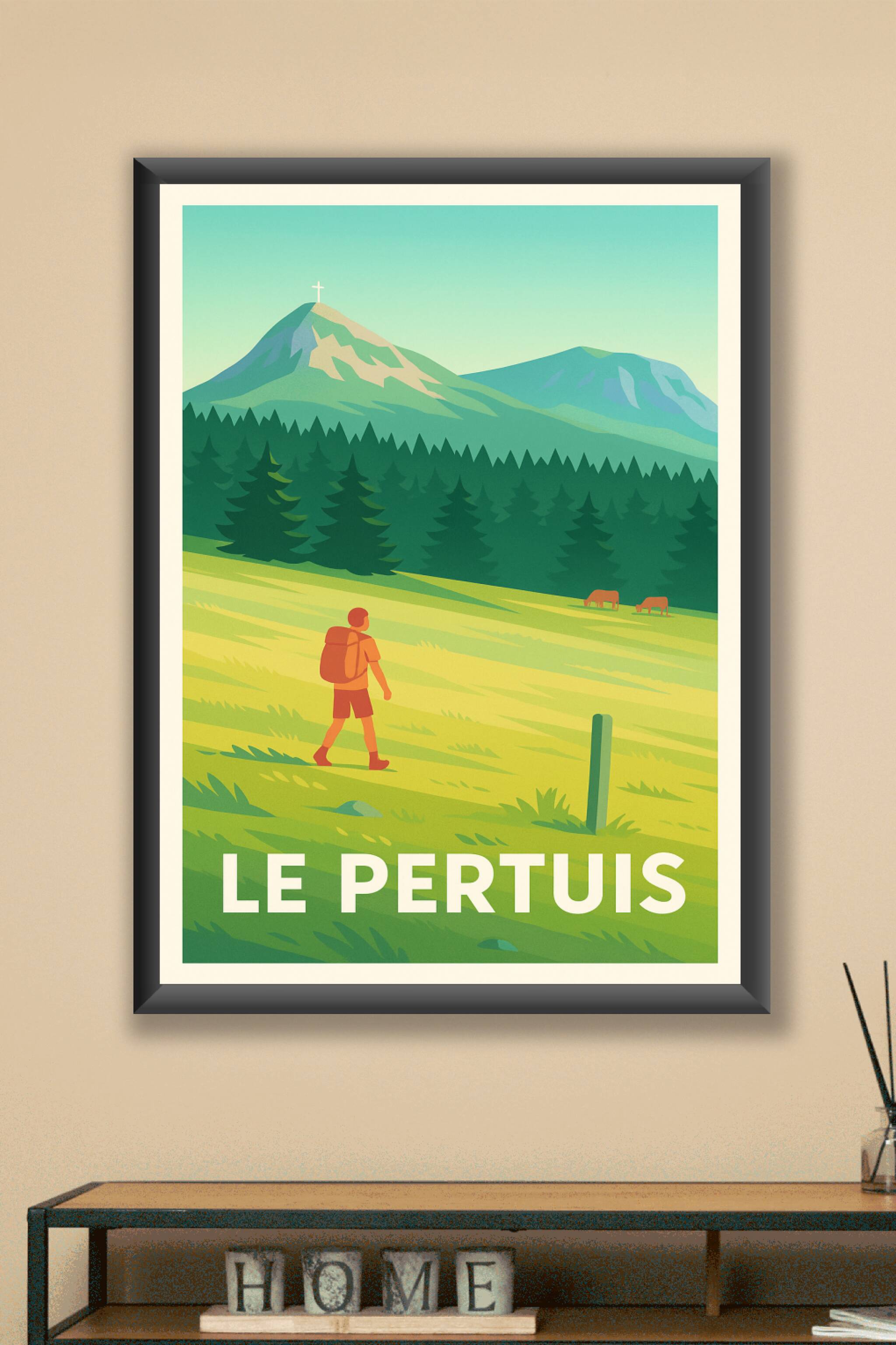 Découvrez la sérénité des paysages du Pertuis avec cette affiche illustrée reprenant les doux reliefs de la montagne et la richesse des forêts environnantes. Le personnage en randonnée vous invite à une immersion apaisante dans ce décor naturel, parfait pour les amateurs de nature et de grands espaces.Ce poster est imprimé en tirage "Fine Art" sur un papier 305g coton, garantissant une qualité d'impression exceptionnelle et durable. Disponible en formats A1 à A4, avec ou sans cadre, cette affiche apportera une touche de fraîcheur et d'évasion à votre intérieur. Offrez-vous ou offrez à vos proches ce souvenir imprimé avec soin, 100% fabriqué en France, pour embellir toute pièce avec un accent sur la beauté naturelle du Pertuis.