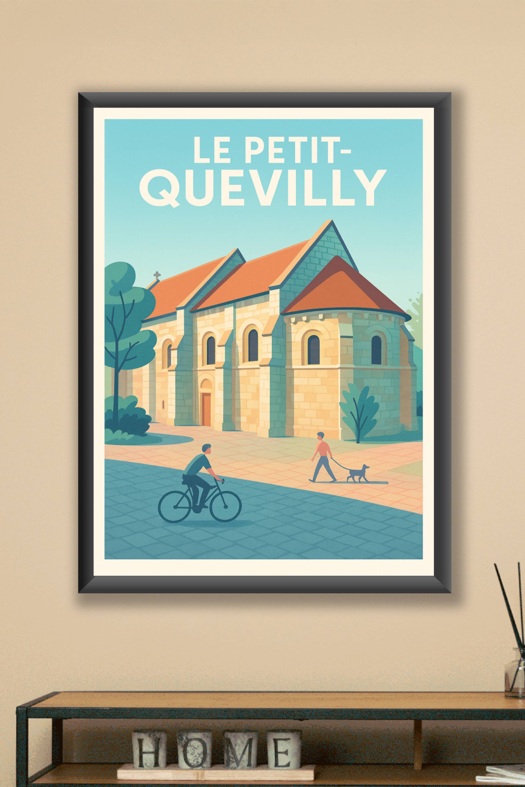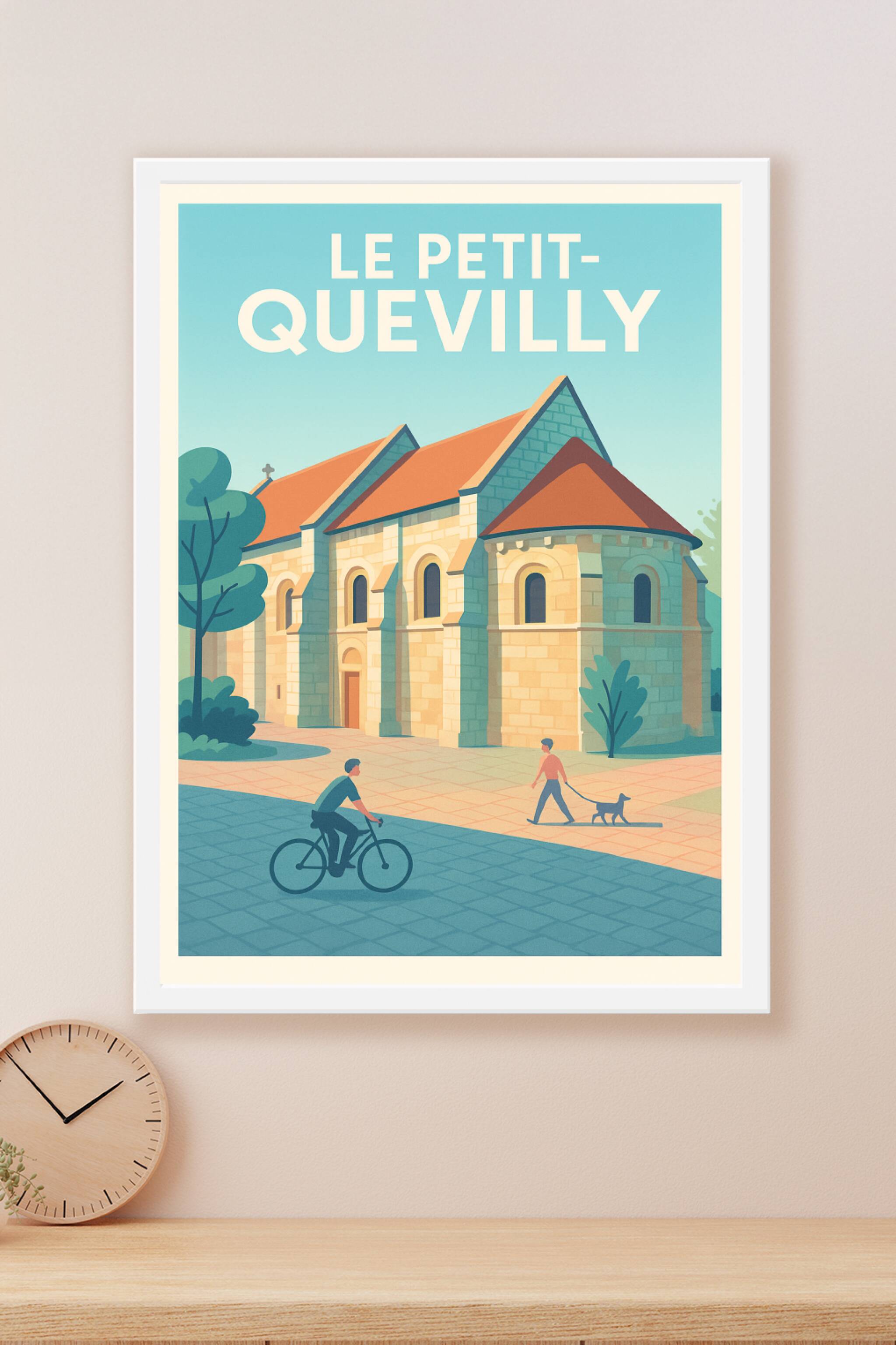 Découvrez le charme apaisant de Le Petit-Quevilly à travers cette affiche illustrée d'une bâtisse historique baignée de lumière. Ce poster, au styl...