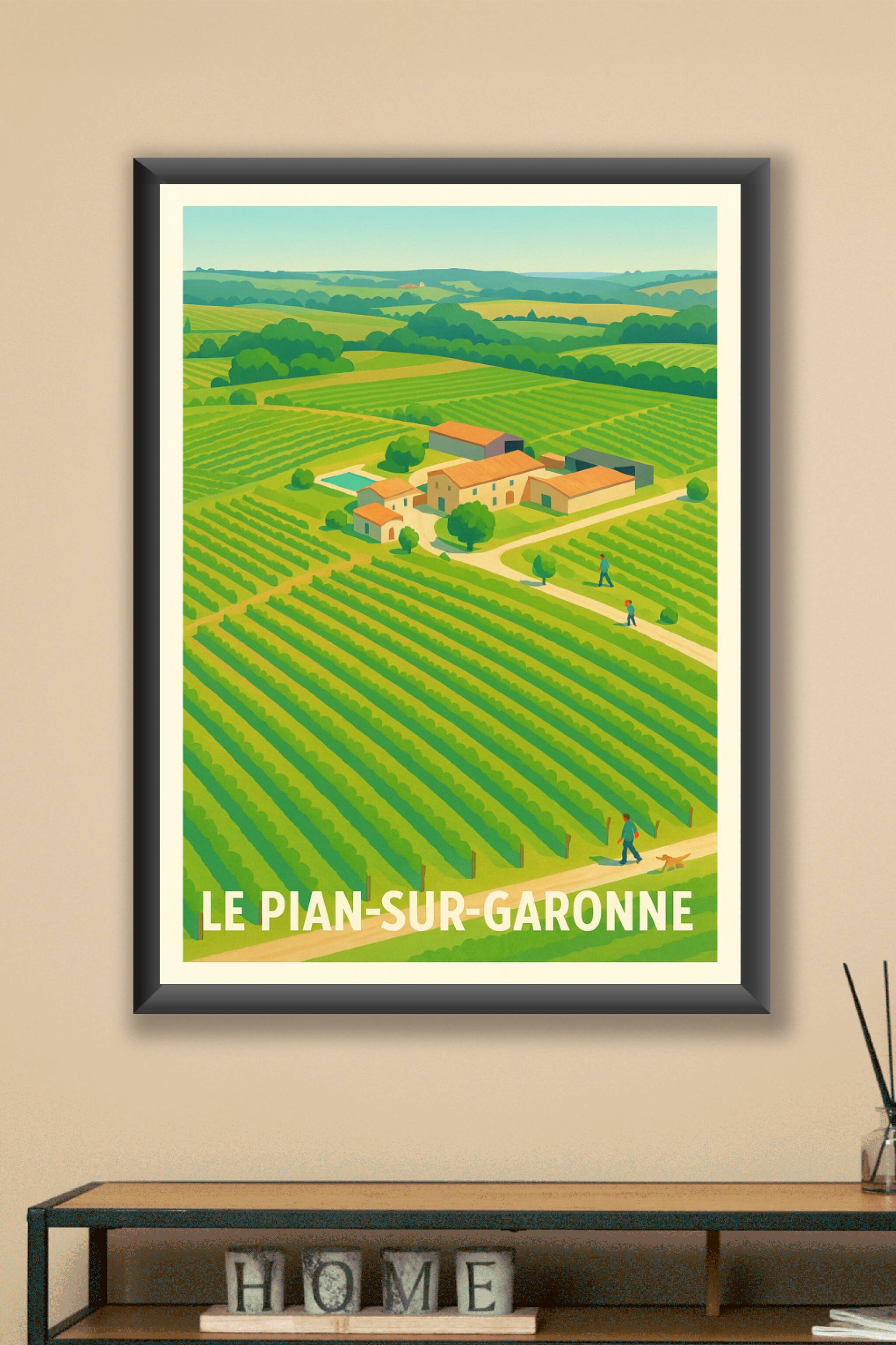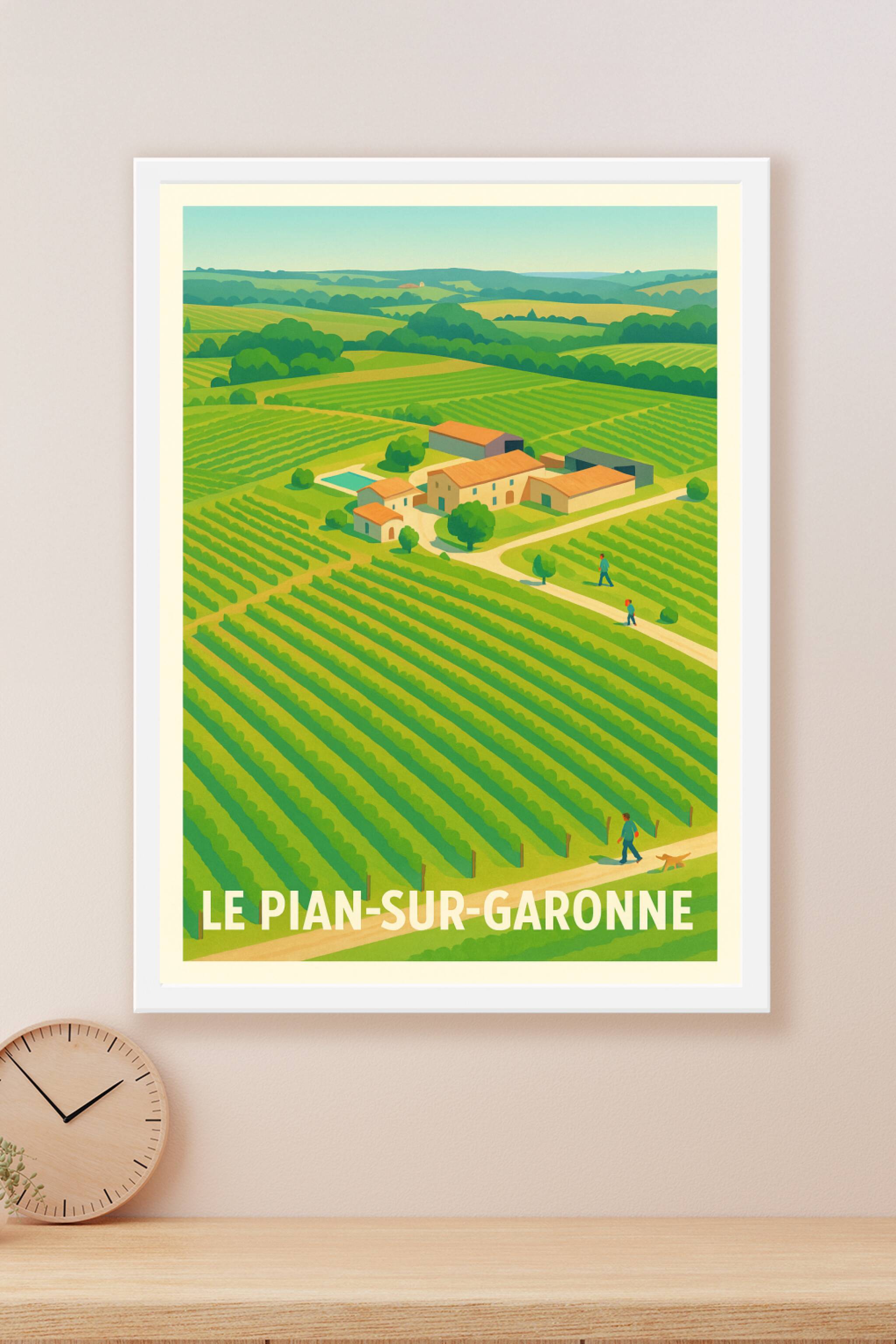 Découvrez la sérénité des paysages viticoles de Le Pian-sur-Garonne avec cette affiche au style illustratif épuré et lumineux. Ce poster invite à l...