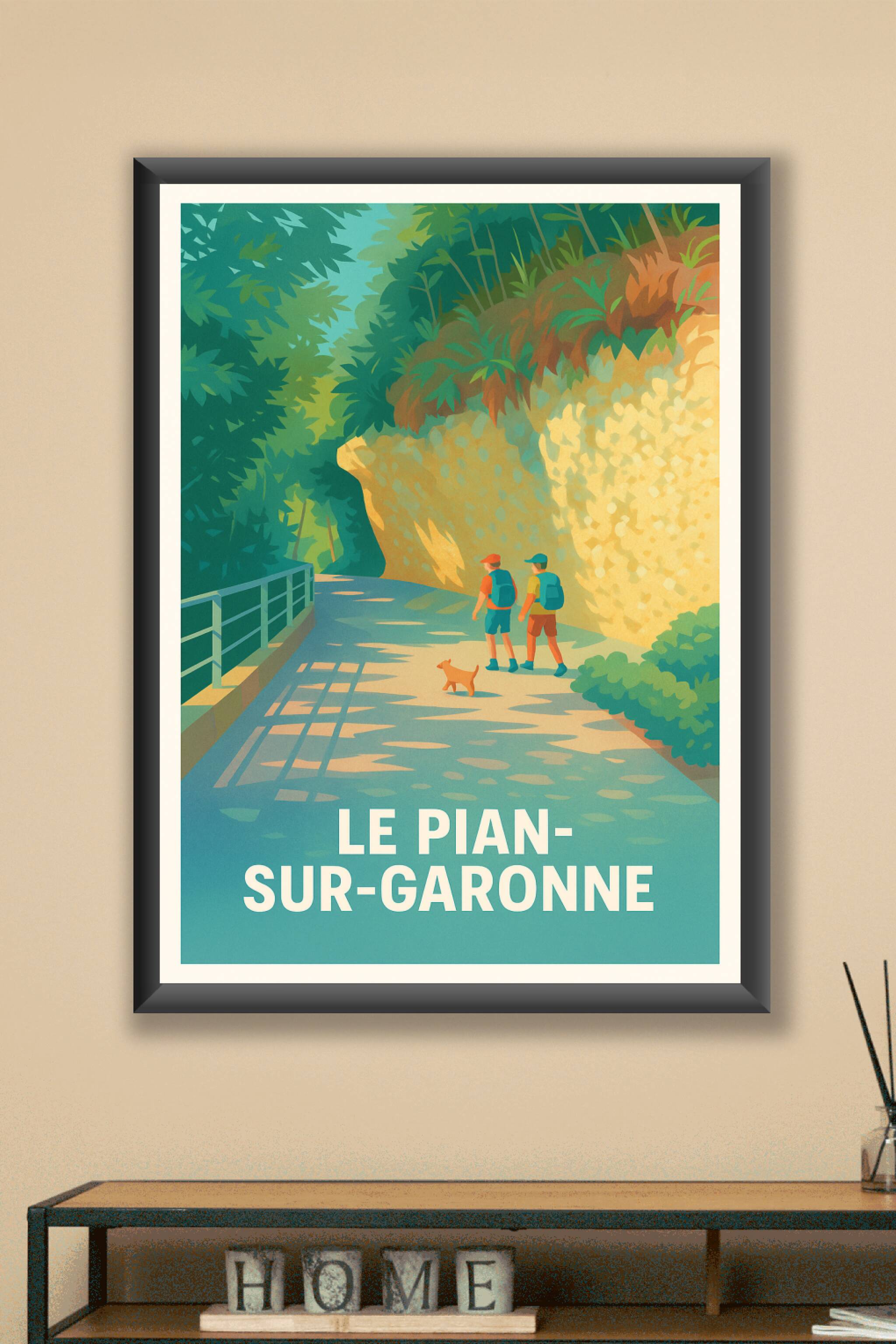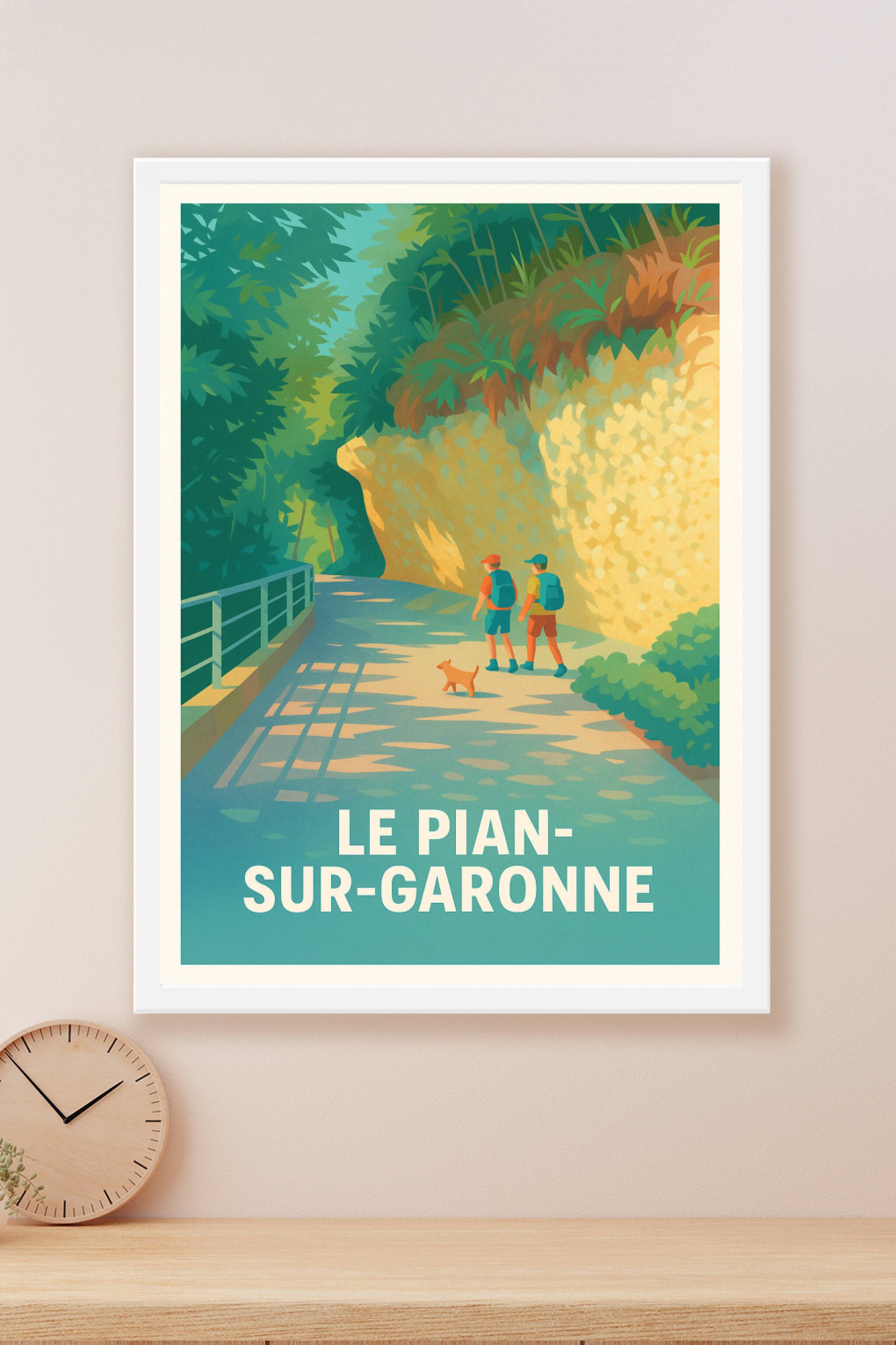 Découvrez l'ambiance paisible et verdoyante de Le Pian-sur-Garonne avec cette superbe affiche illustrée représentant une promenade ensoleillée entr...