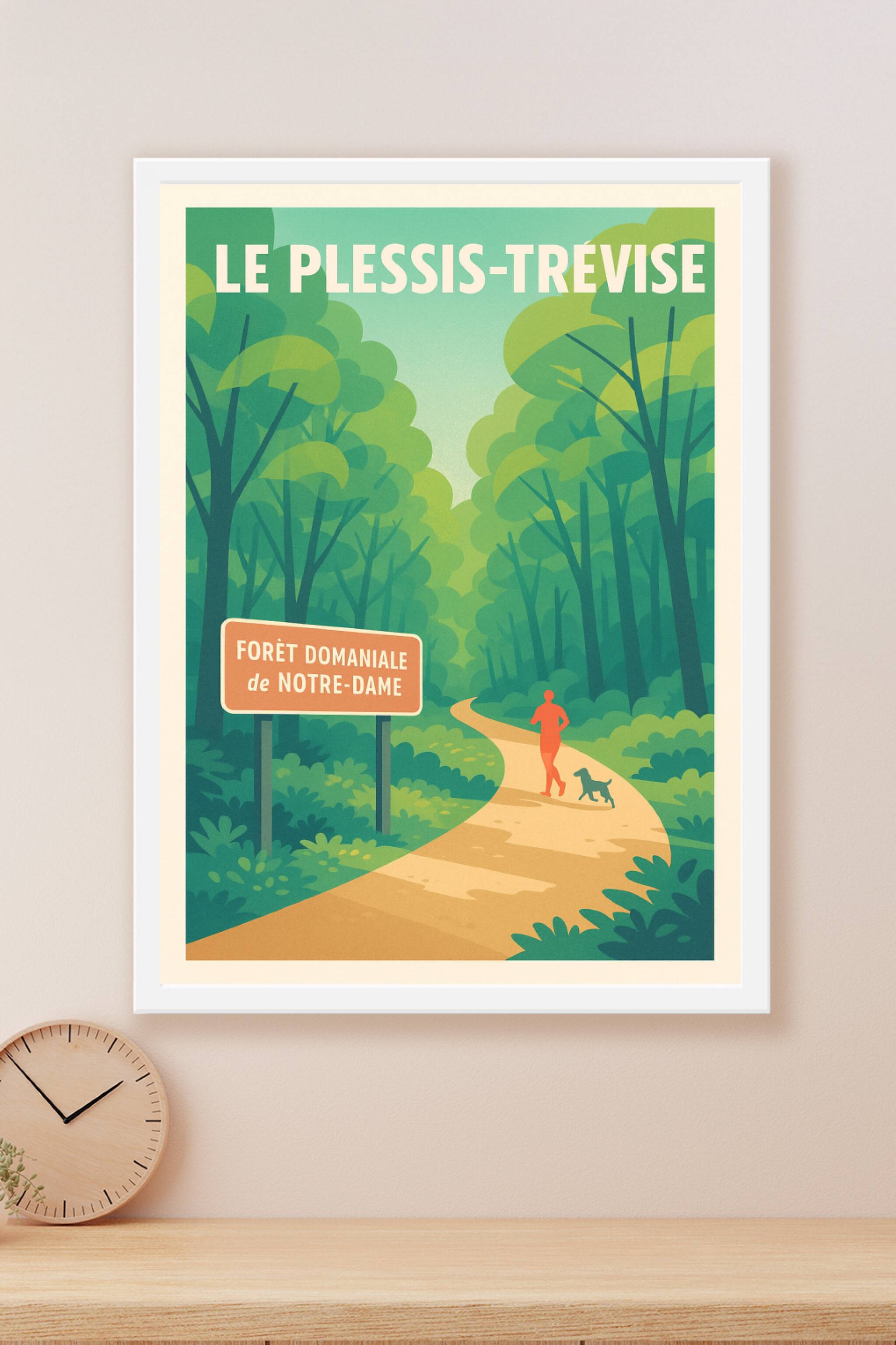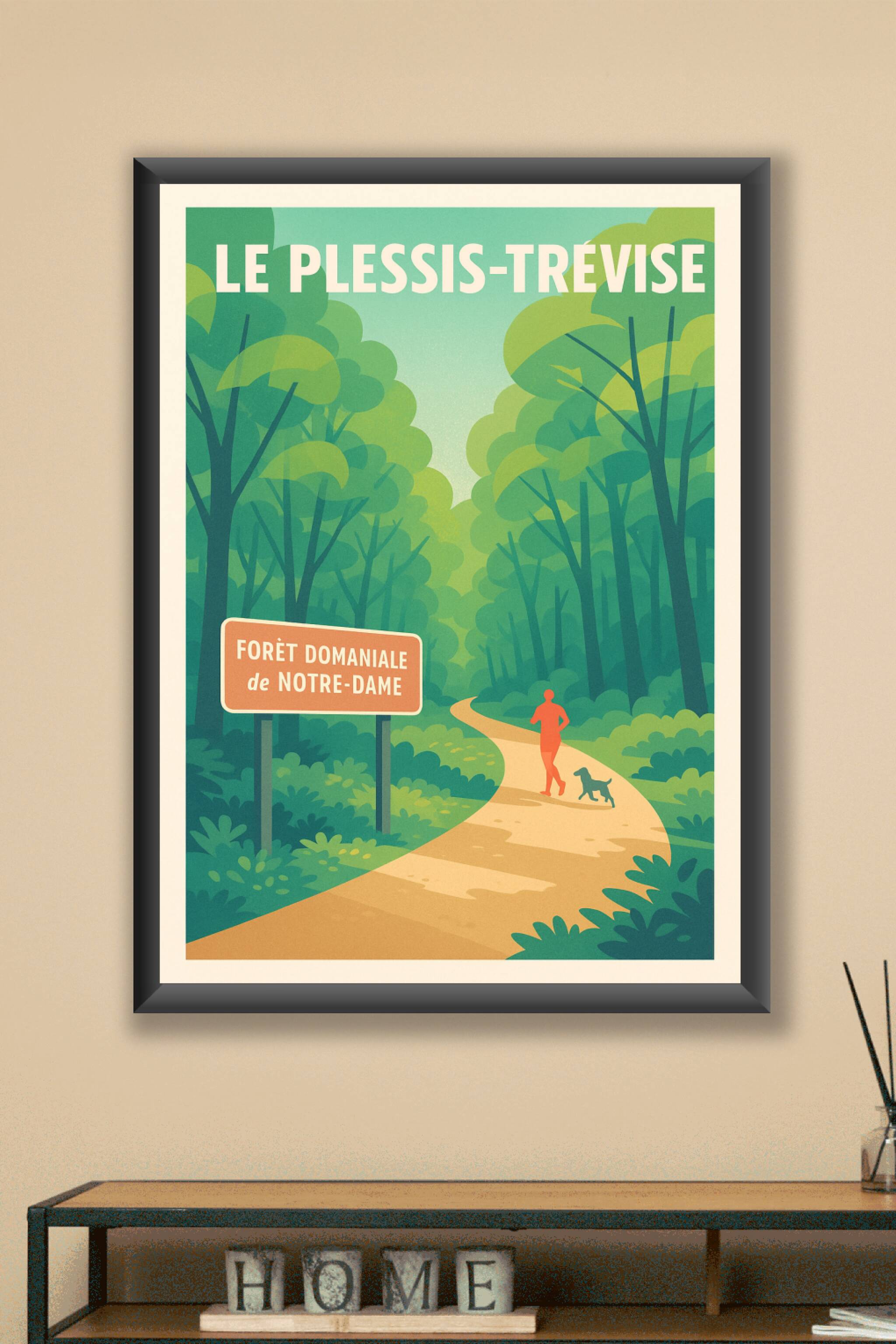 Découvrez l'esprit naturel et apaisant de Le Plessis-Trévise avec cette affiche illustrée représentant la Forêt domaniale de Notre-Dame. La scène i...