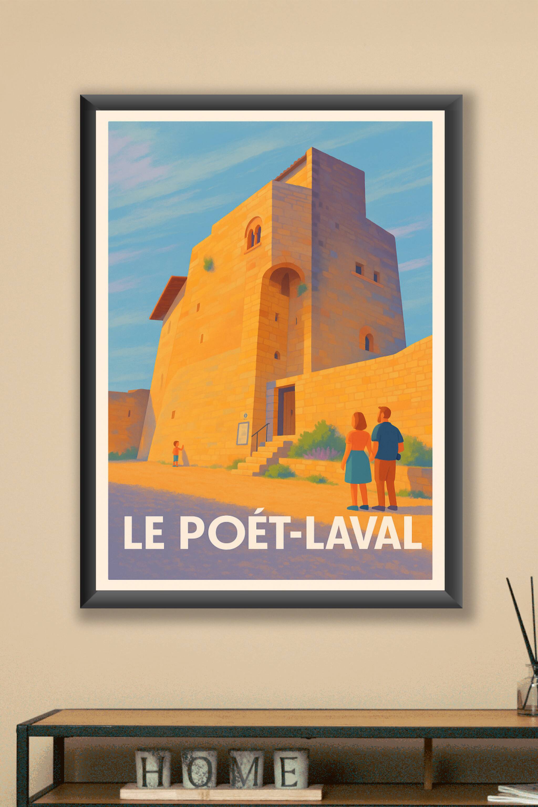 Redécouvrez le charme authentique du village médiéval de Le Poët-Laval à travers cette affiche illustrée aux tons chaleureux. La lumière dorée care...