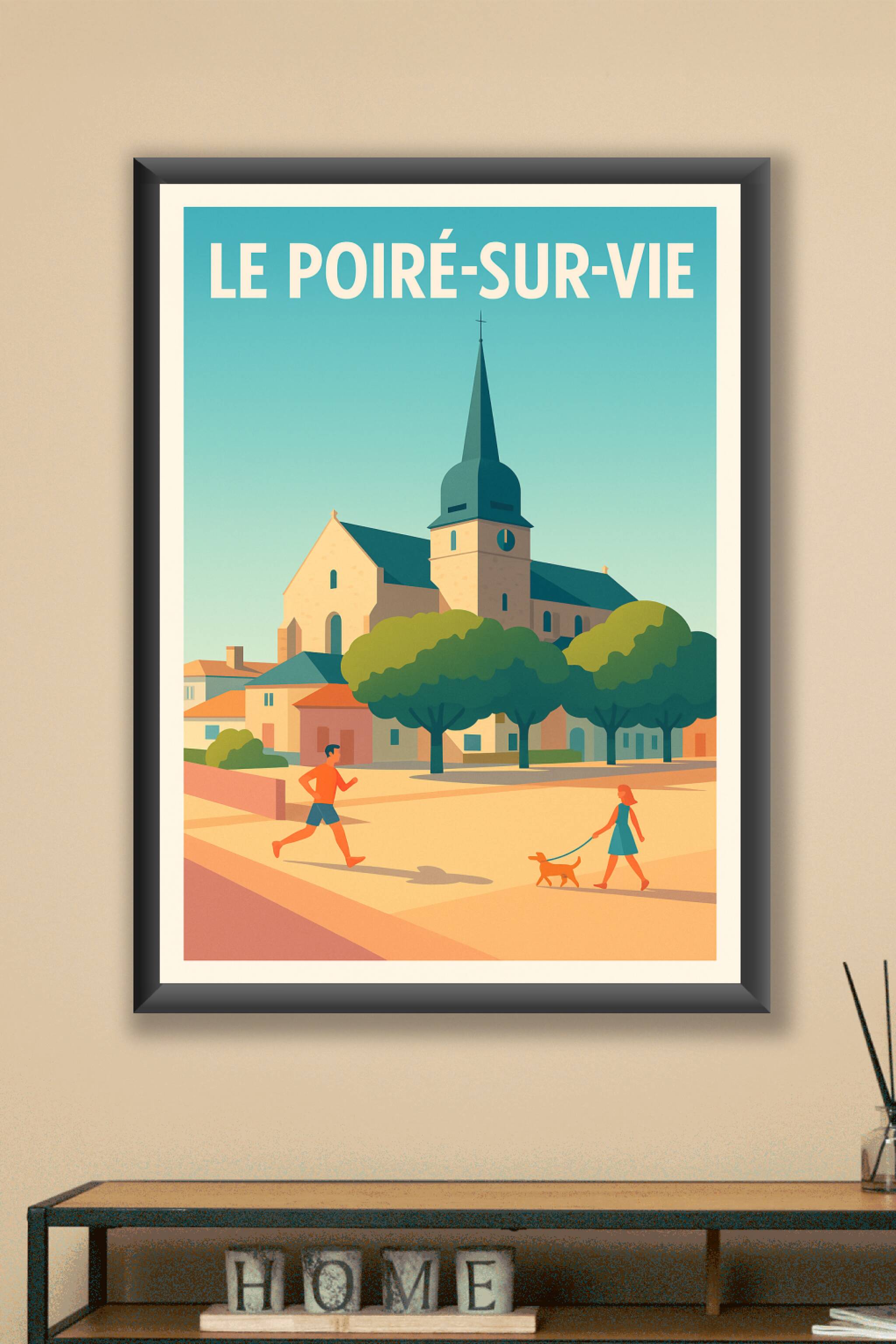 Découvrez l'atmosphère douce et accueillante de Le Poiré-sur-Vie avec cette affiche illustrée au style moderne et minimaliste. L'église emblématiqu...