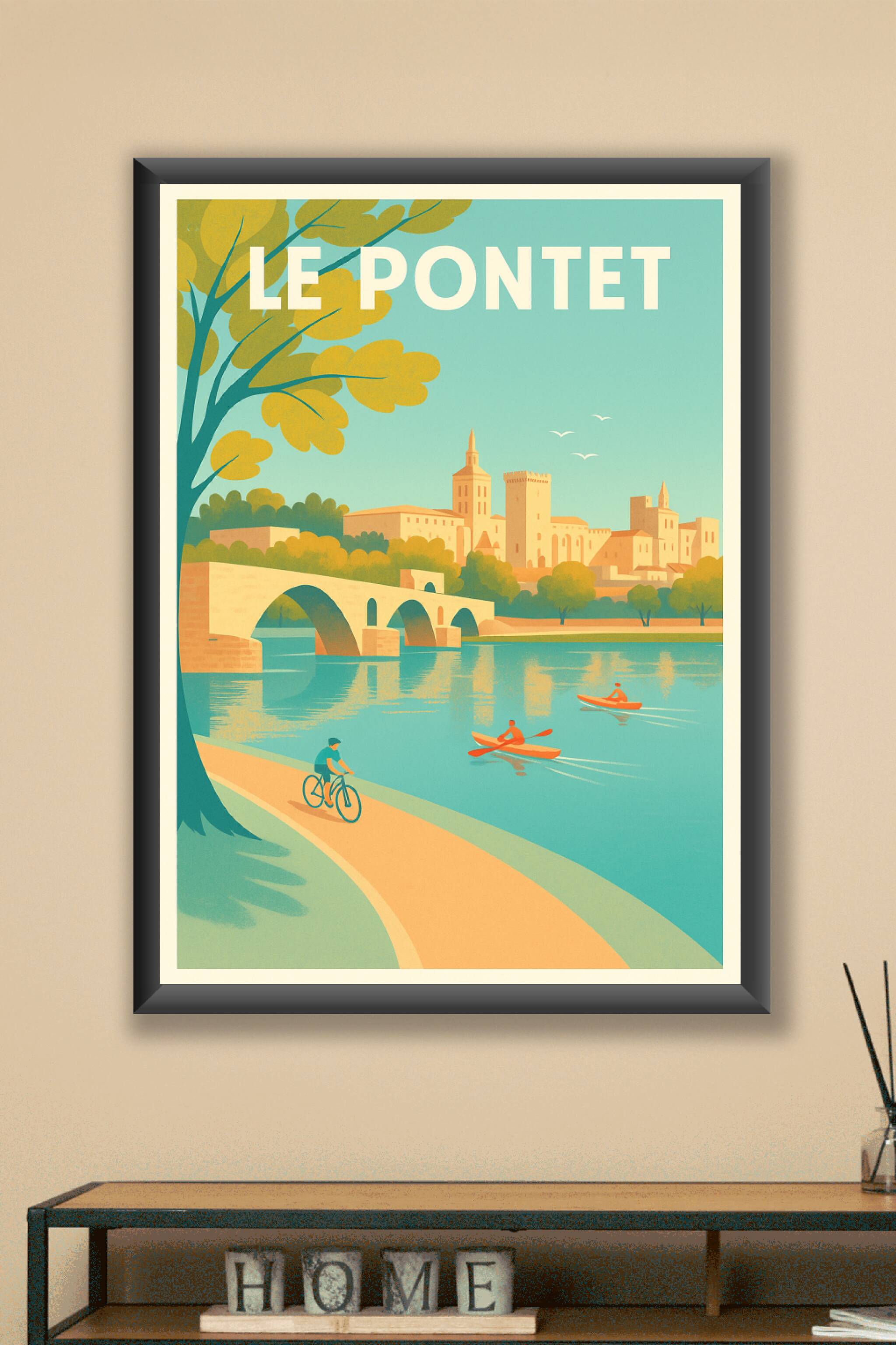 Découvrez la douceur de vivre à Le Pontet avec cette affiche illustrée mettant en scène le pont historique et les activités paisibles au fil de l'e...