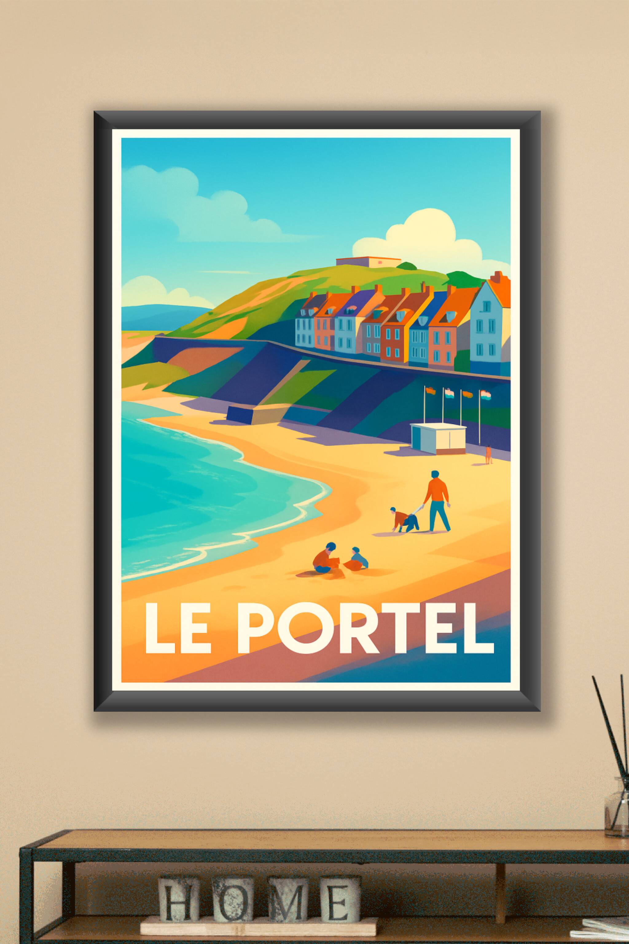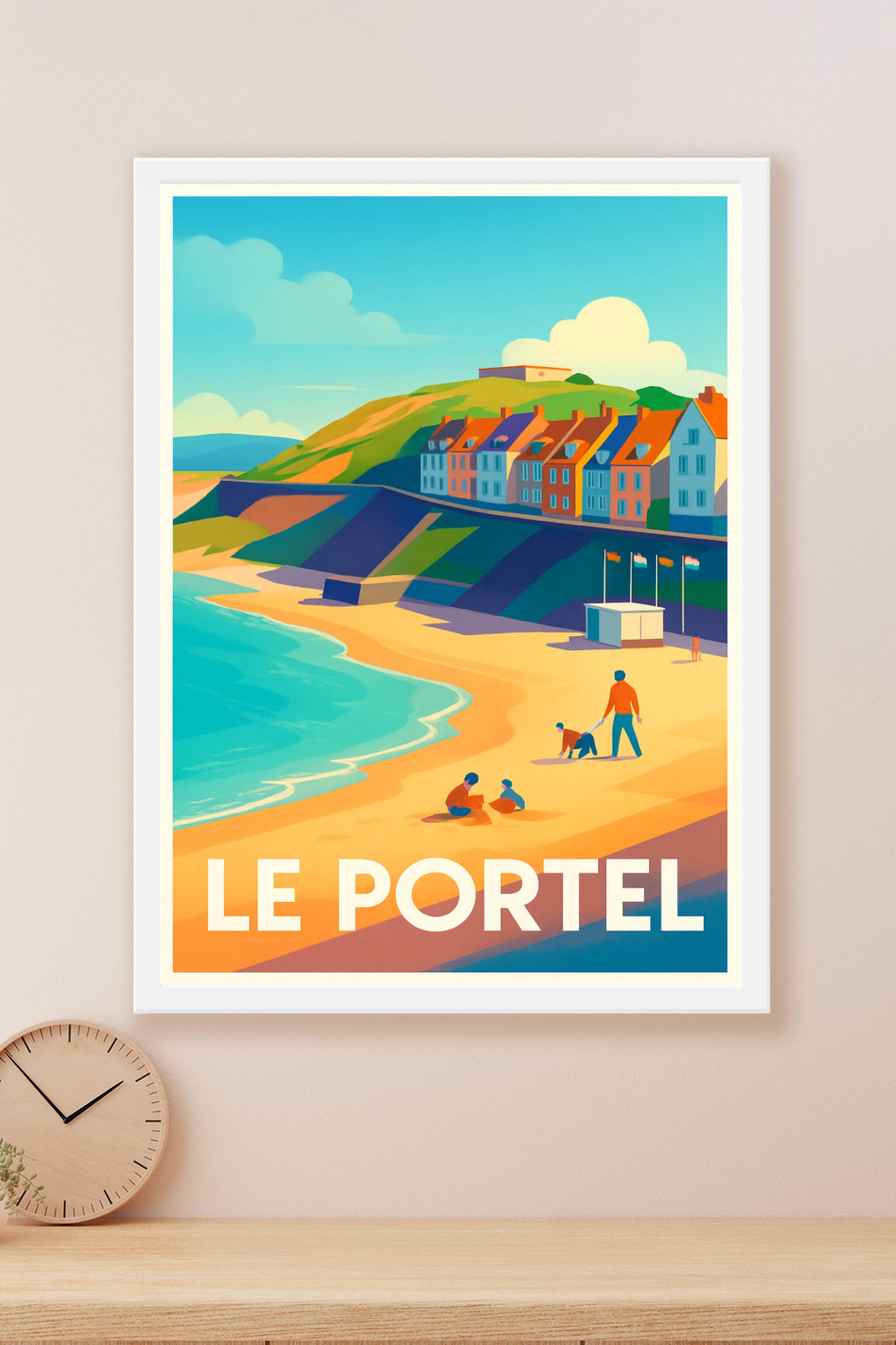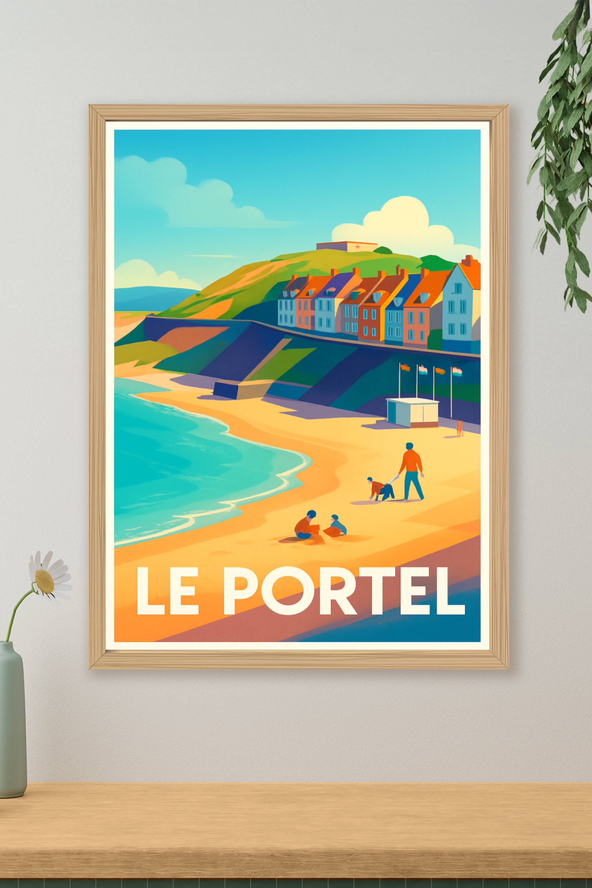 Découvrez la sérénité balnéaire du Portel avec cette affiche illustrée, capturant la douceur des plages et le charme coloré des maisons côtières so...