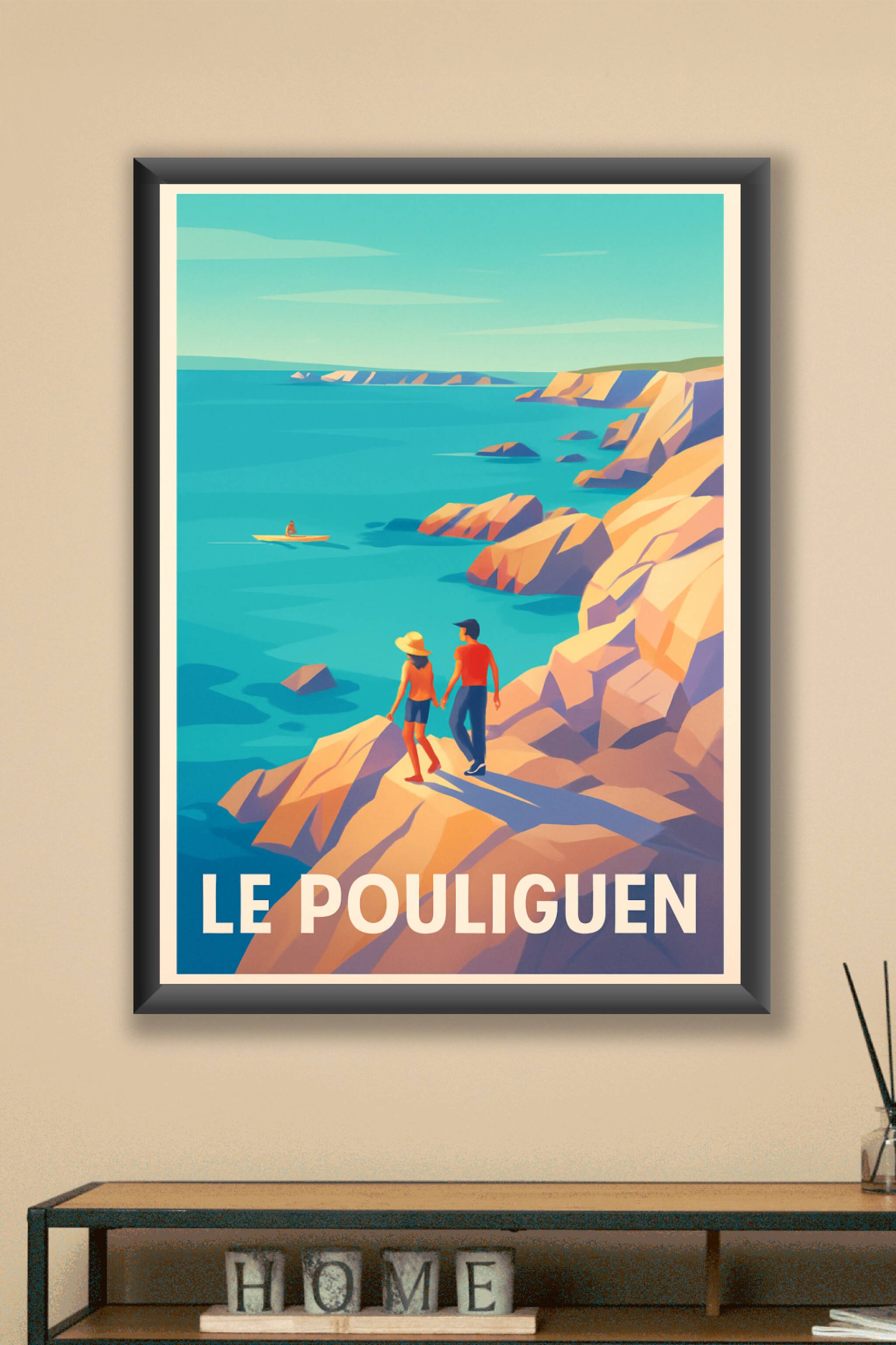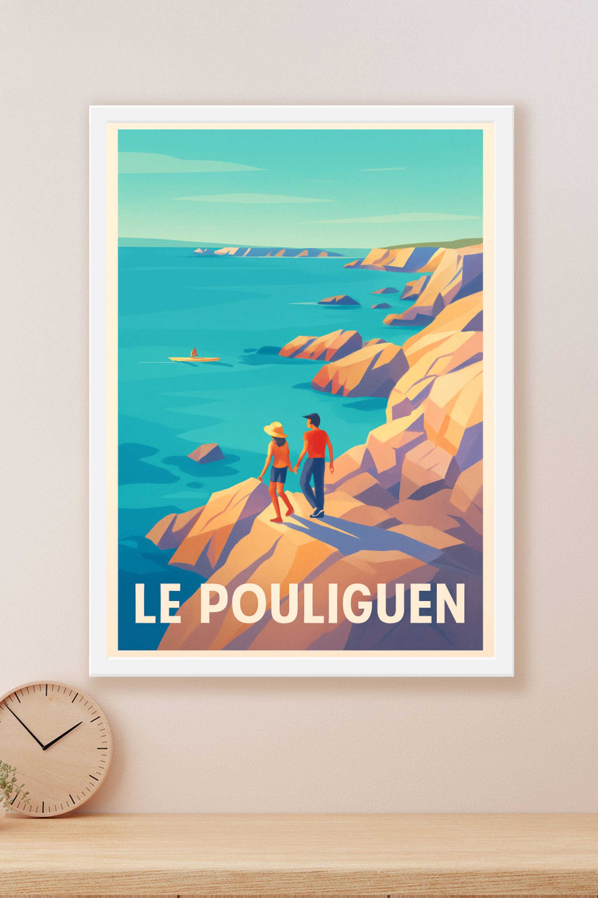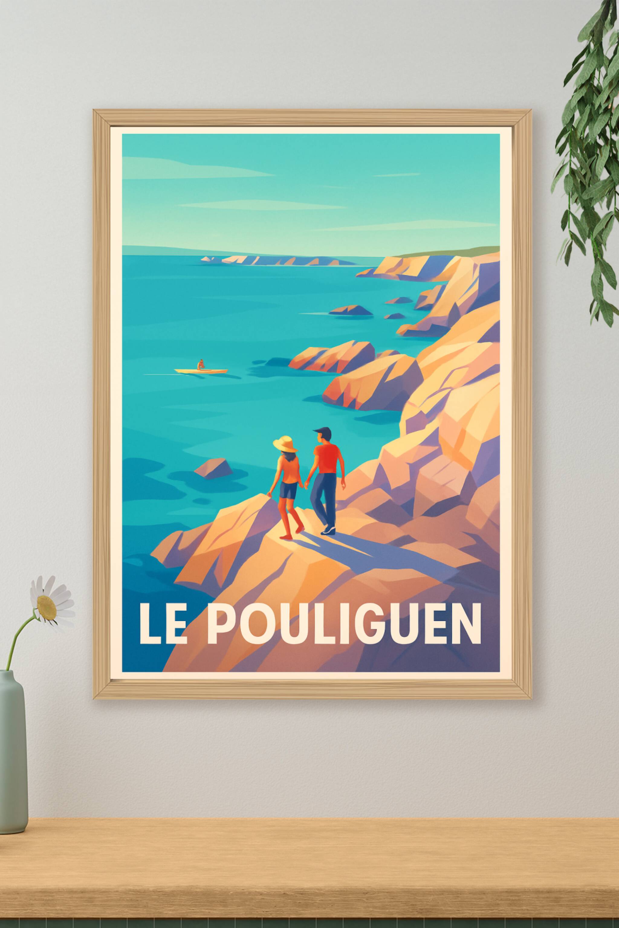 Découvrez la beauté authentique de la côte bretonne avec cette affiche représentant un couple se promenant sur les rochers de Le Pouliguen, face à ...