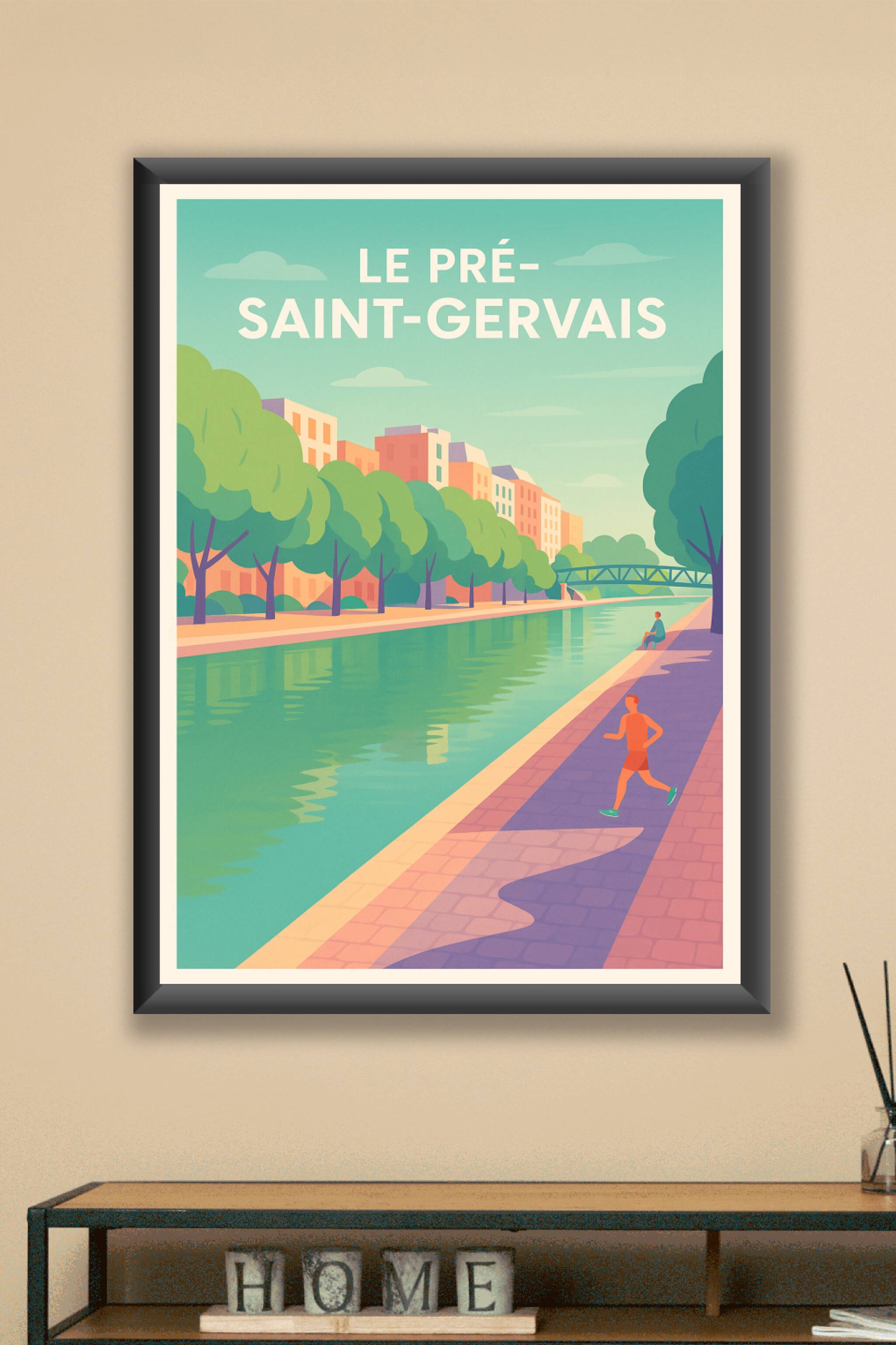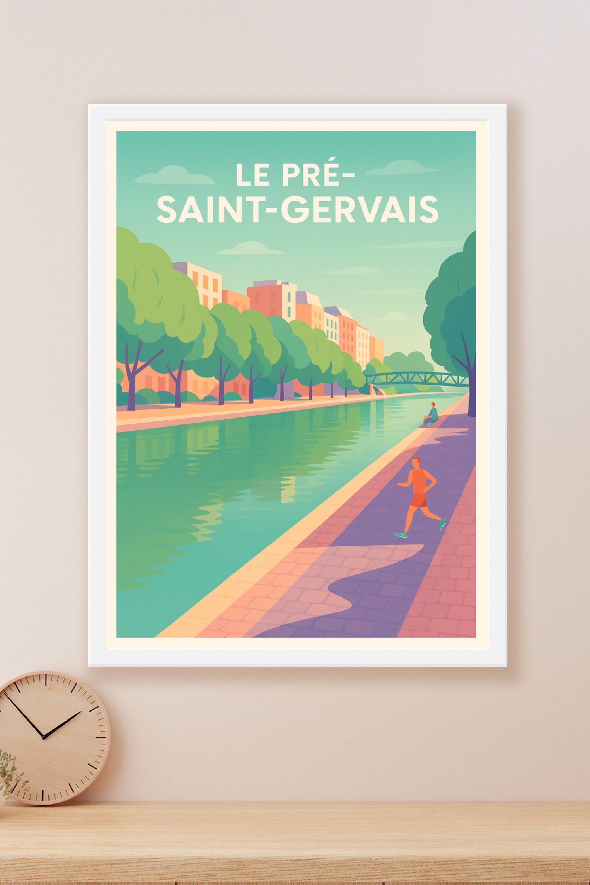 Découvrez l'ambiance paisible et colorée du Pré-Saint-Gervais avec cette affiche illustrée dans un style doux et rétro. Cette scène au bord du cana...