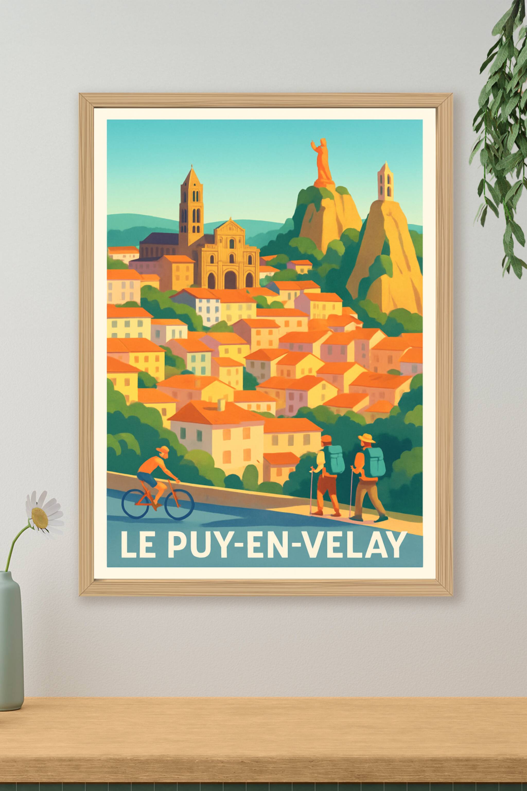 Découvrez Le Puy-en-Velay à travers cette magnifique affiche illustrée d'une scène colorée mettant en avant ses célèbres monuments et son architect...