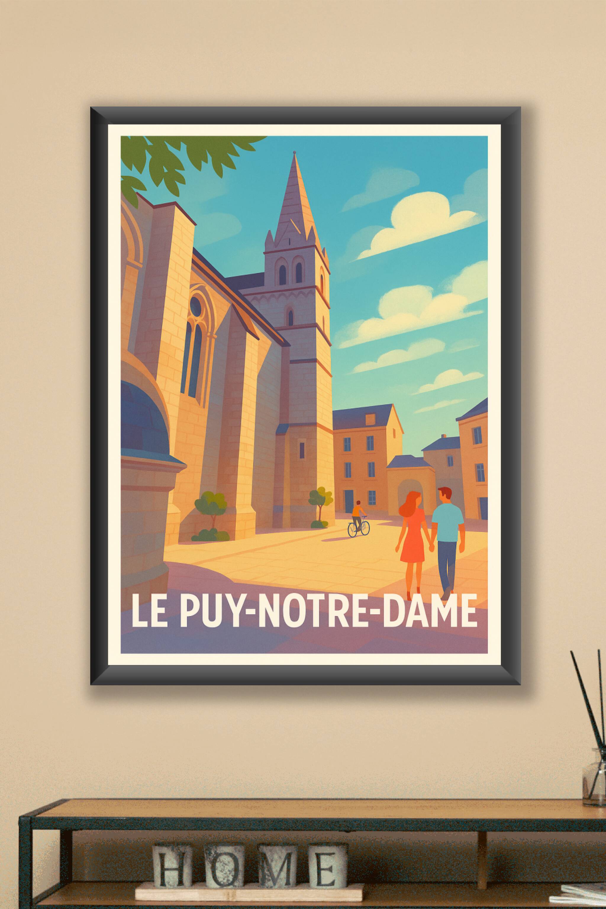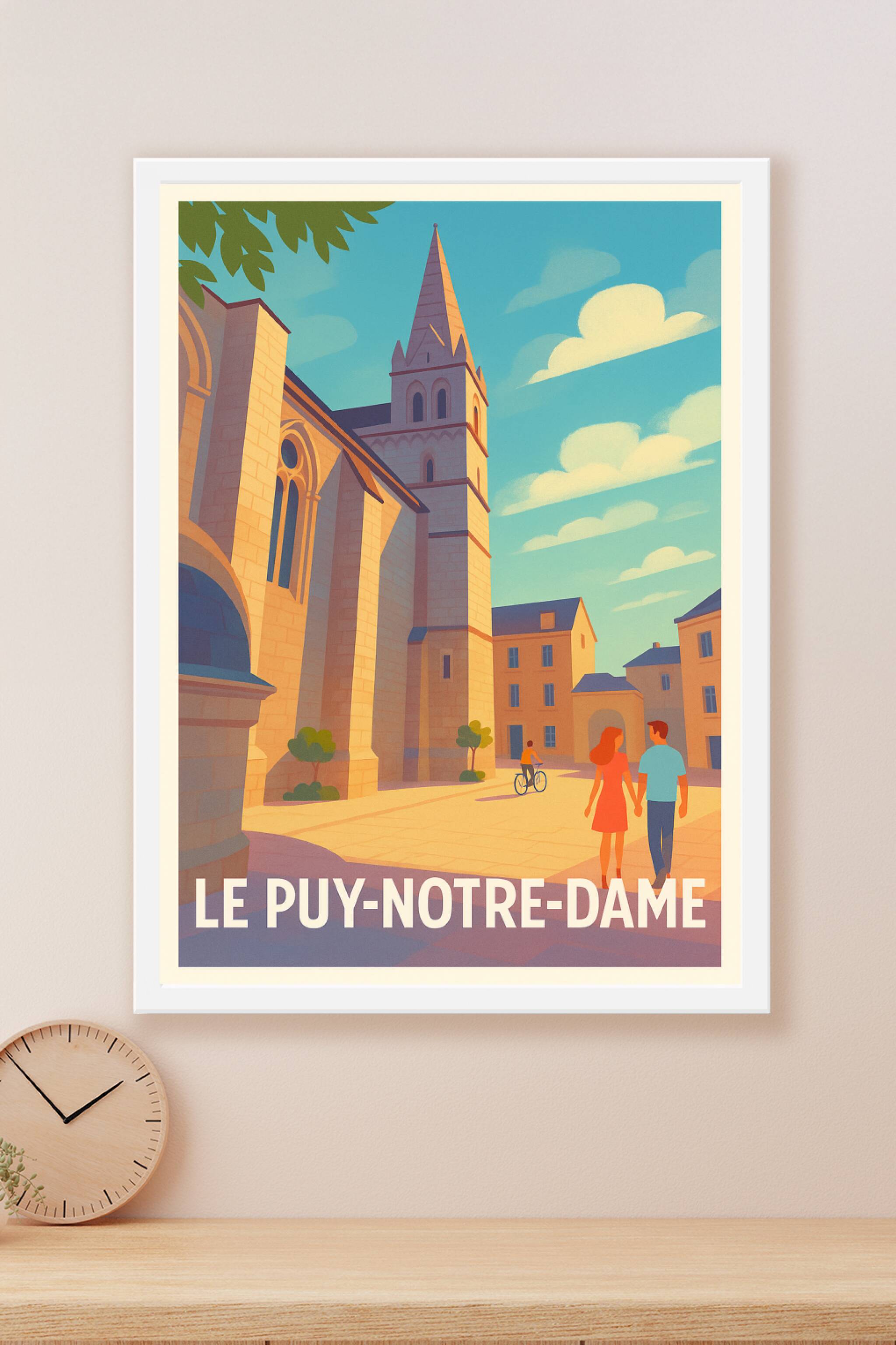 Découvrez le charme intemporel de Le Puy-Notre-Dame avec cette affiche illustrée mettant en lumière son architecture emblématique baignée d'une dou...