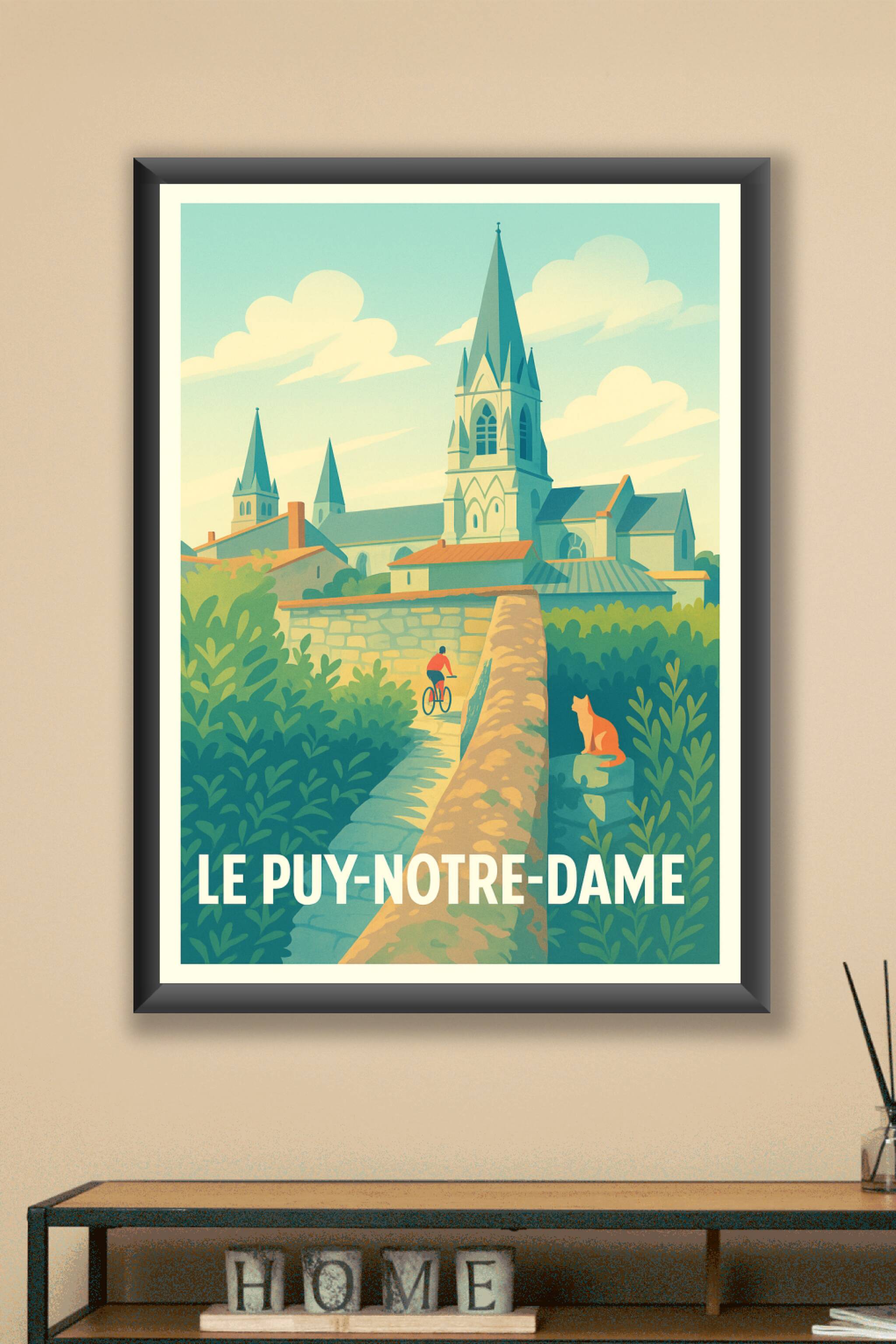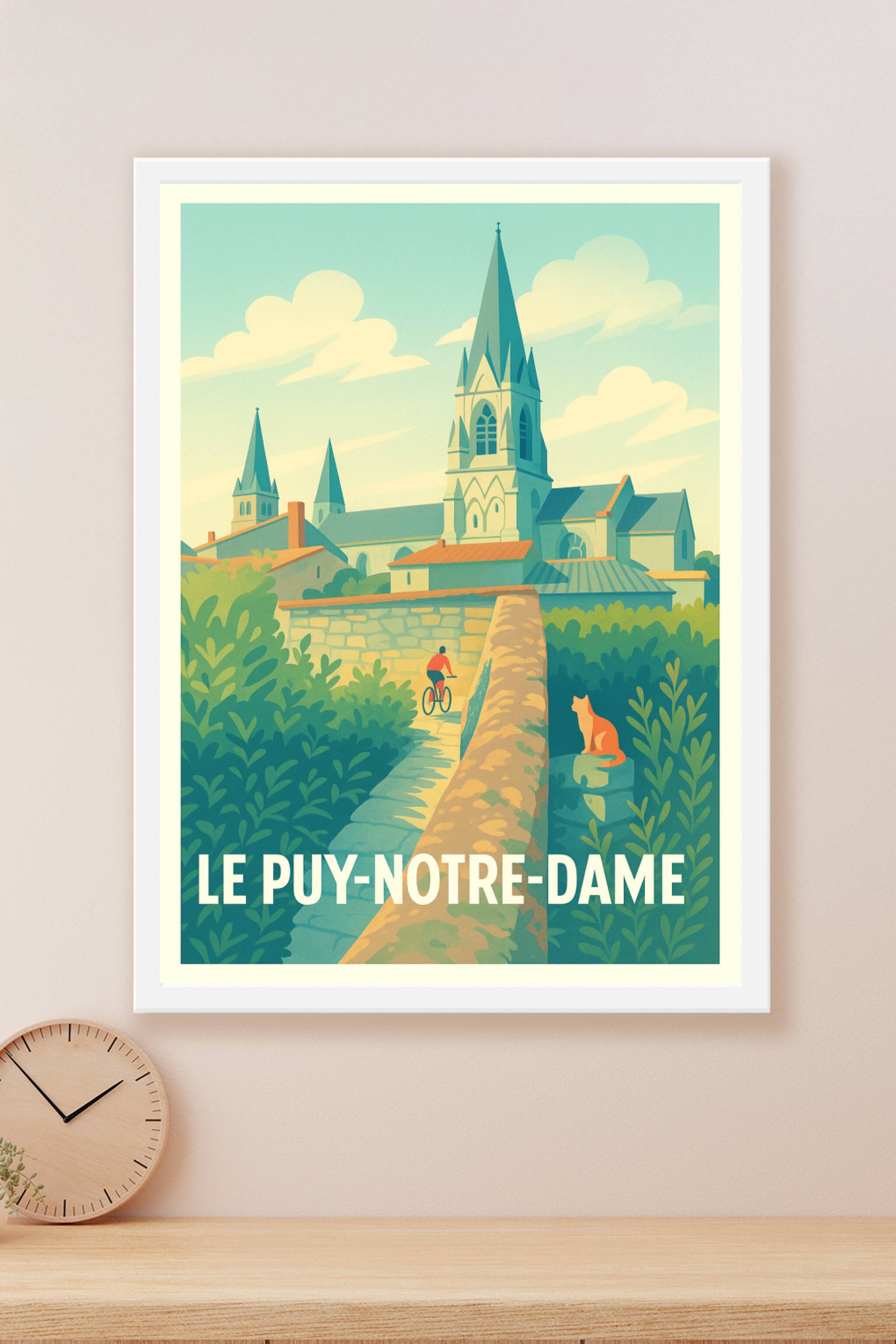Découvrez l'ambiance paisible et pittoresque de Le Puy-Notre-Dame avec cette affiche illustrée au style vintage doux et chaleureux. Ce poster met e...