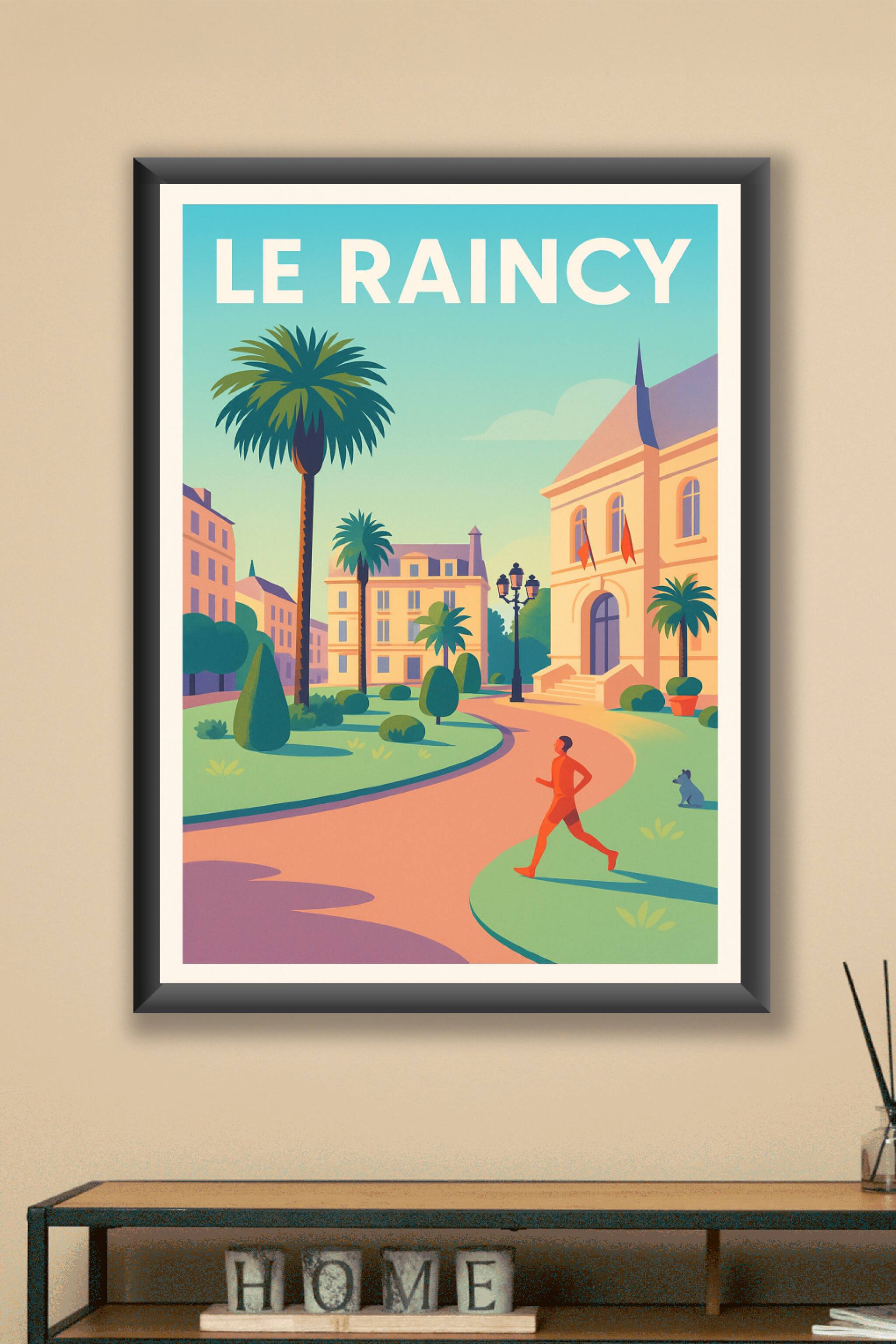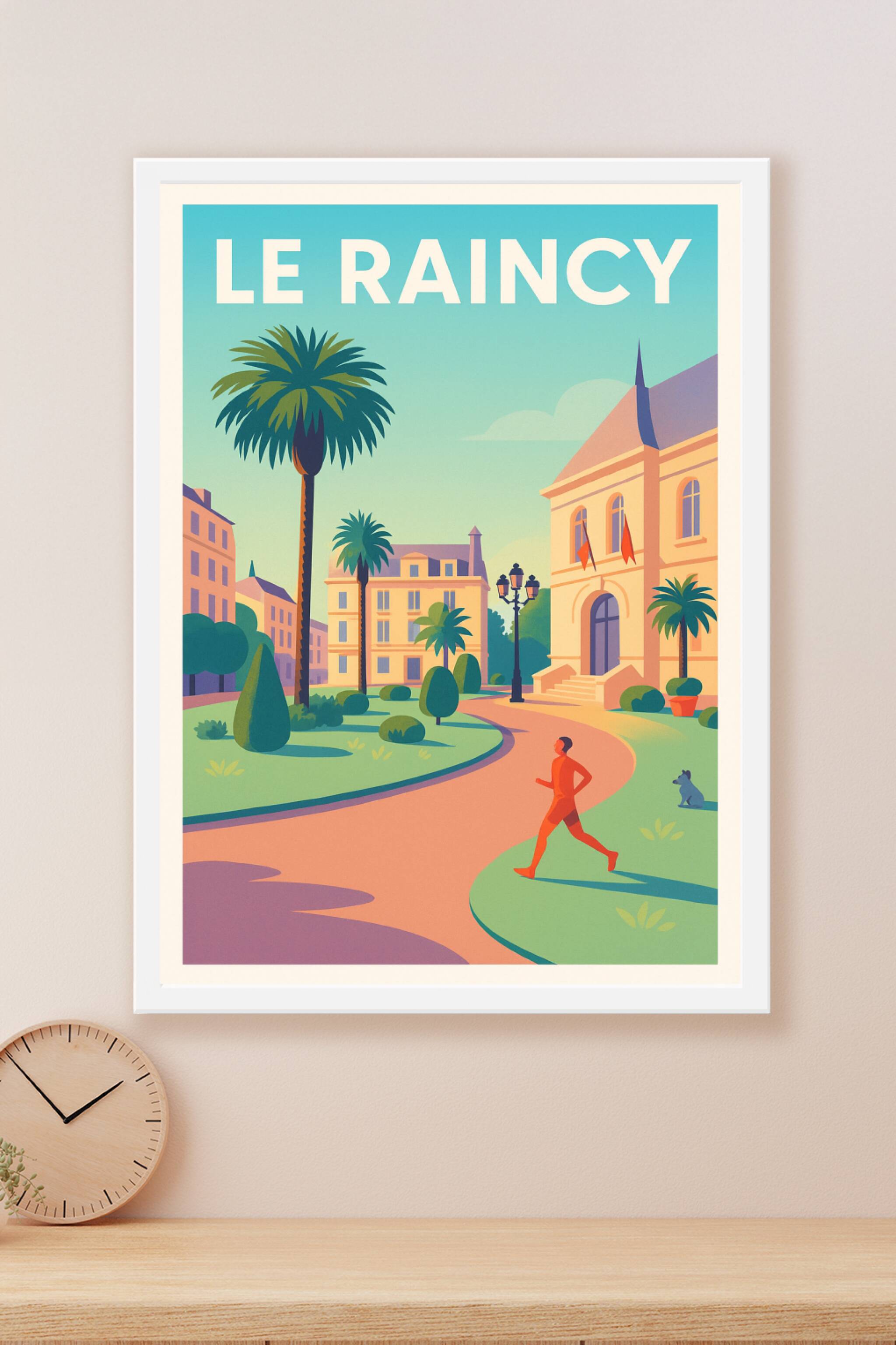 Découvrez l'ambiance paisible et lumineuse de Le Raincy avec cette affiche au style moderne et coloré. Cette illustration met en scène un parc urba...