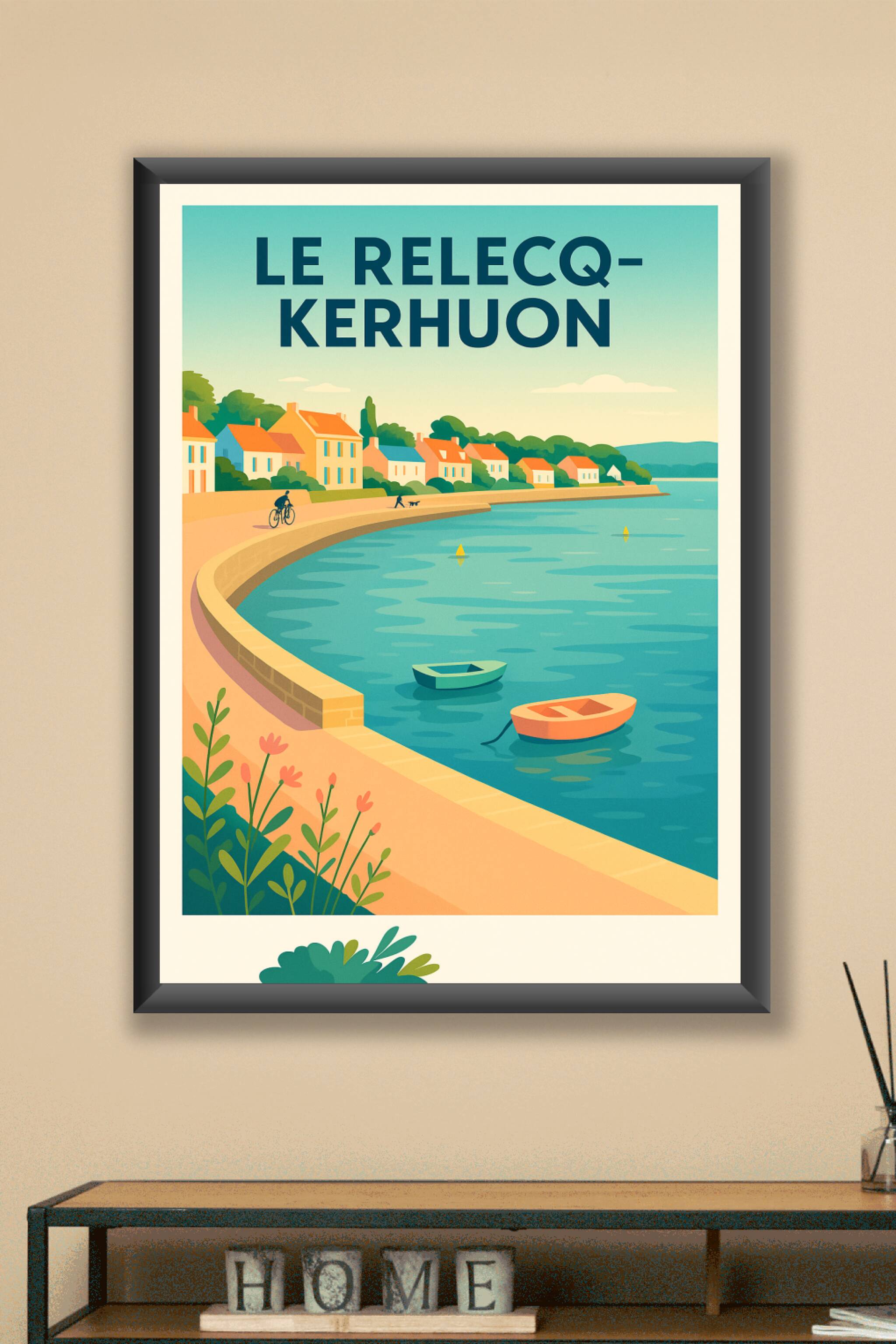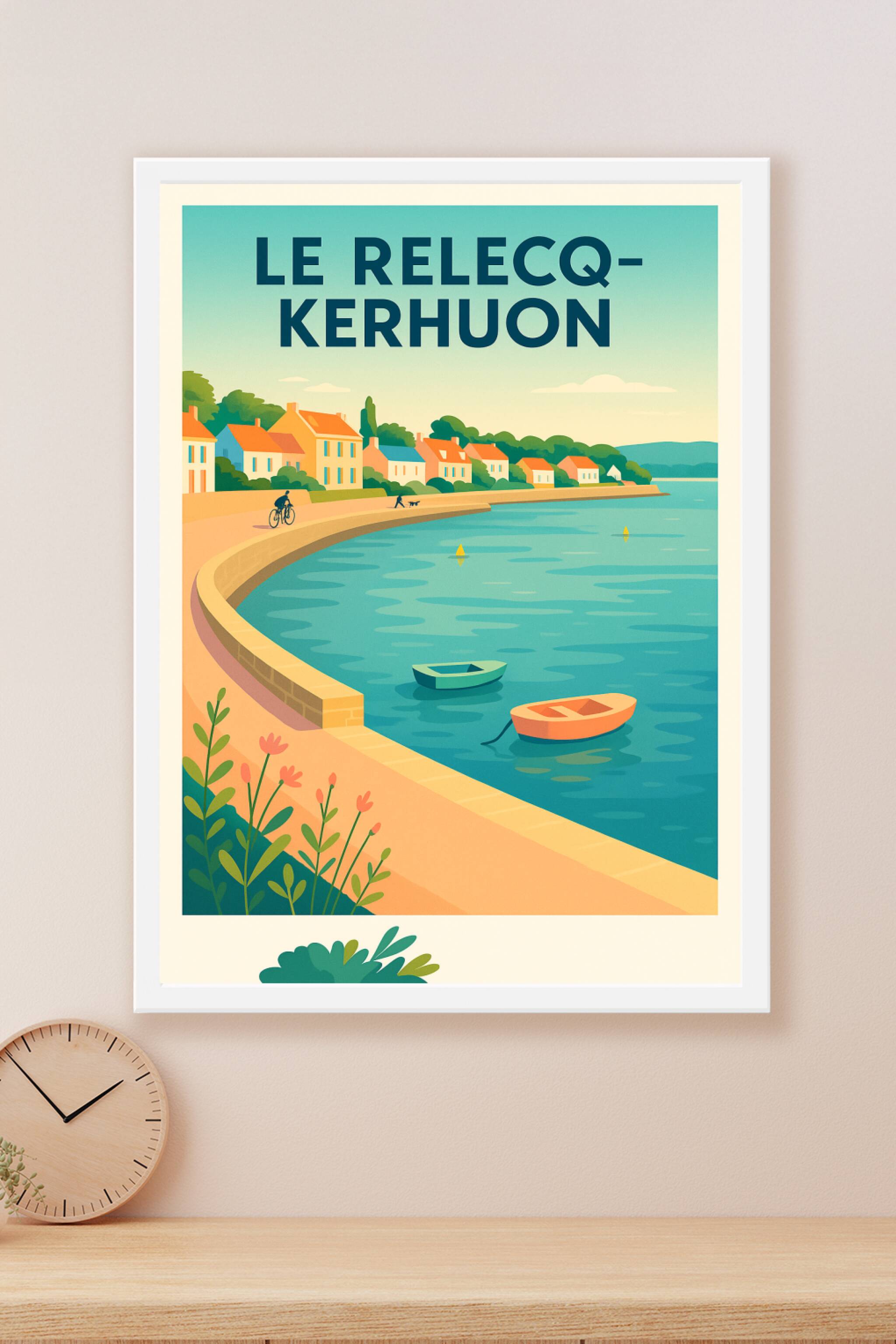 Découvrez la douce quiétude de la côte bretonne à travers cette affiche illustrée représentant Le Relecq-Kerhuon, ses maisons colorées et sa promen...