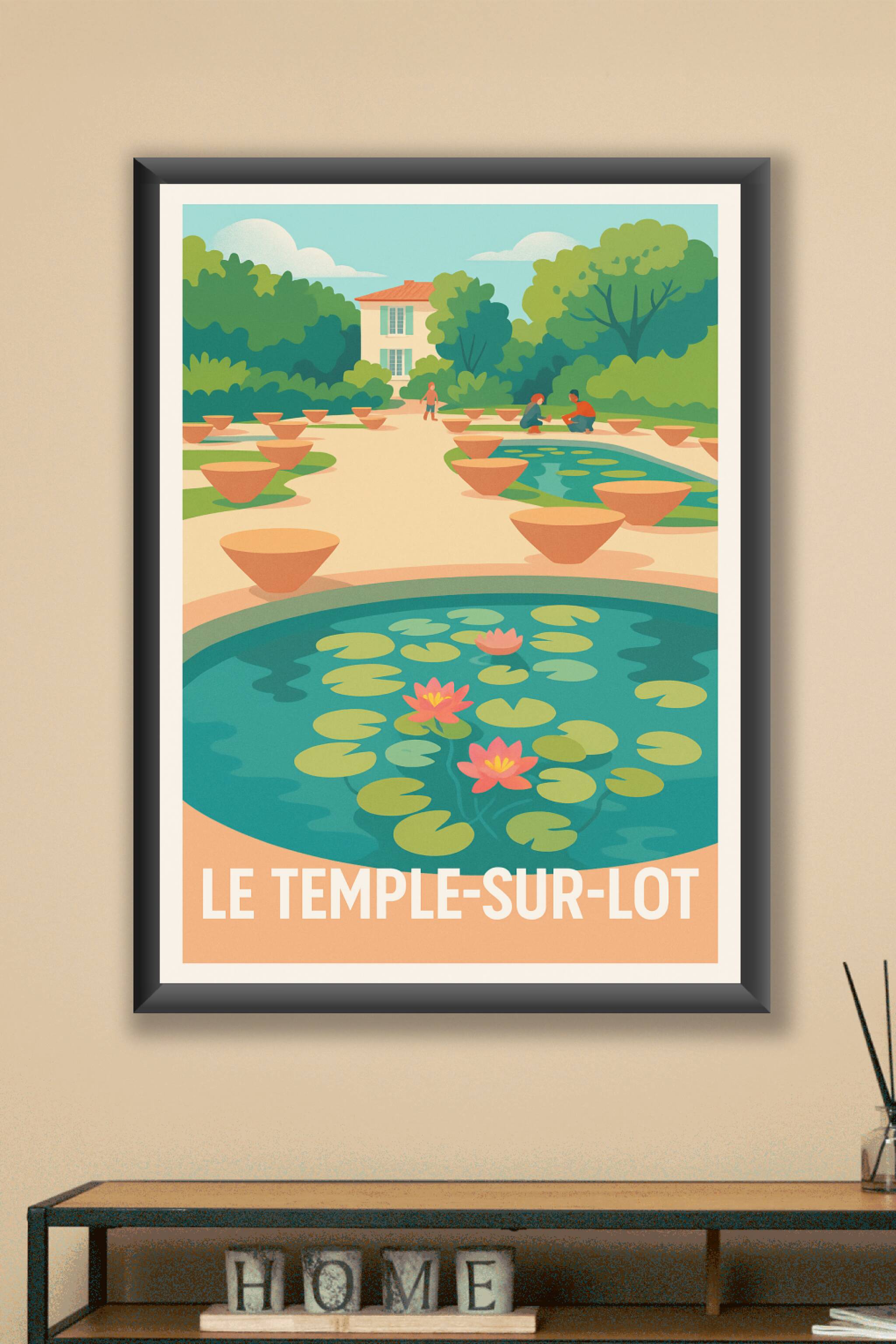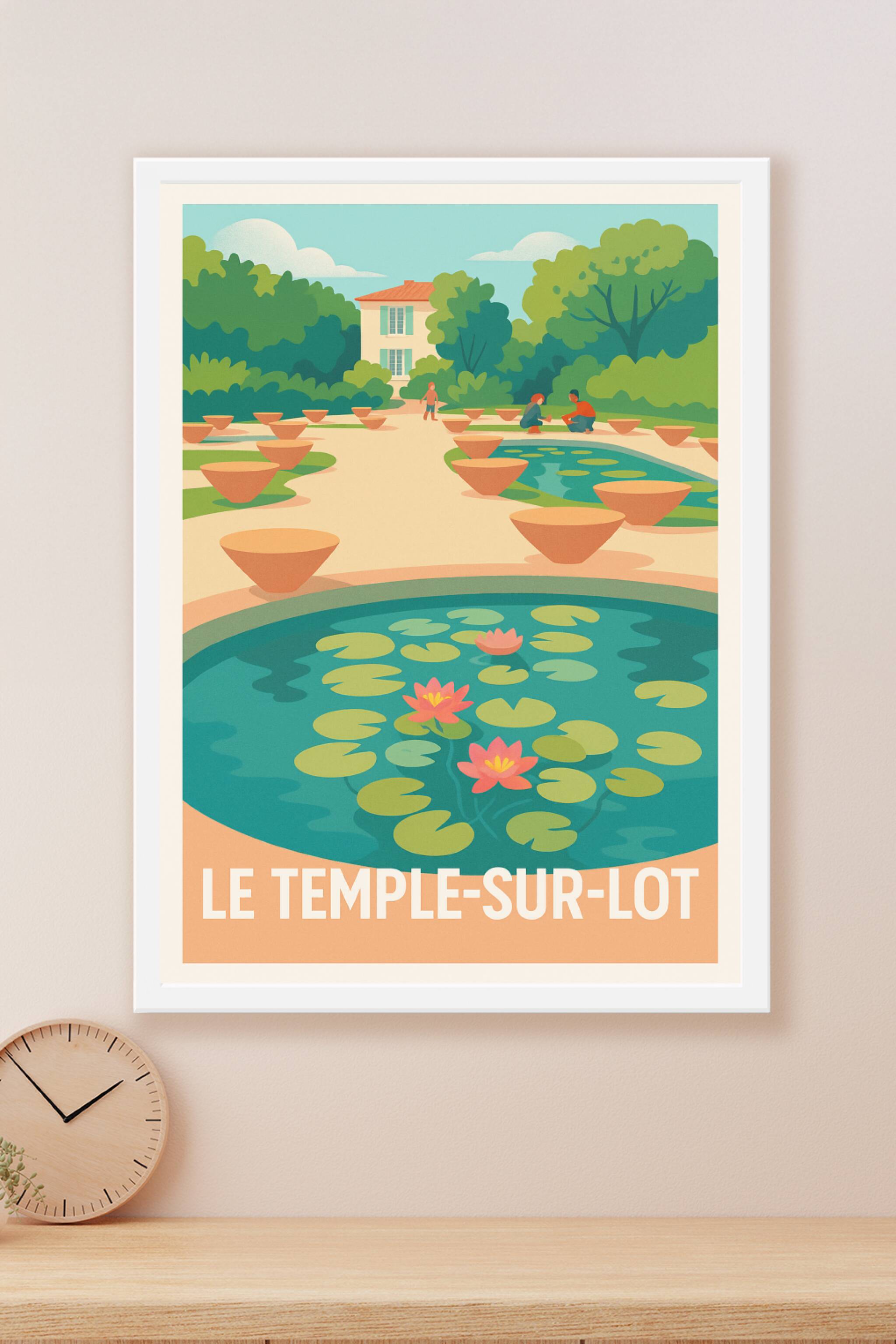 Découvrez Le Temple-sur-Lot à travers cette affiche au style vintage épuré, mettant en avant la sérénité d’un jardin paisible aux bassins de nymphé...