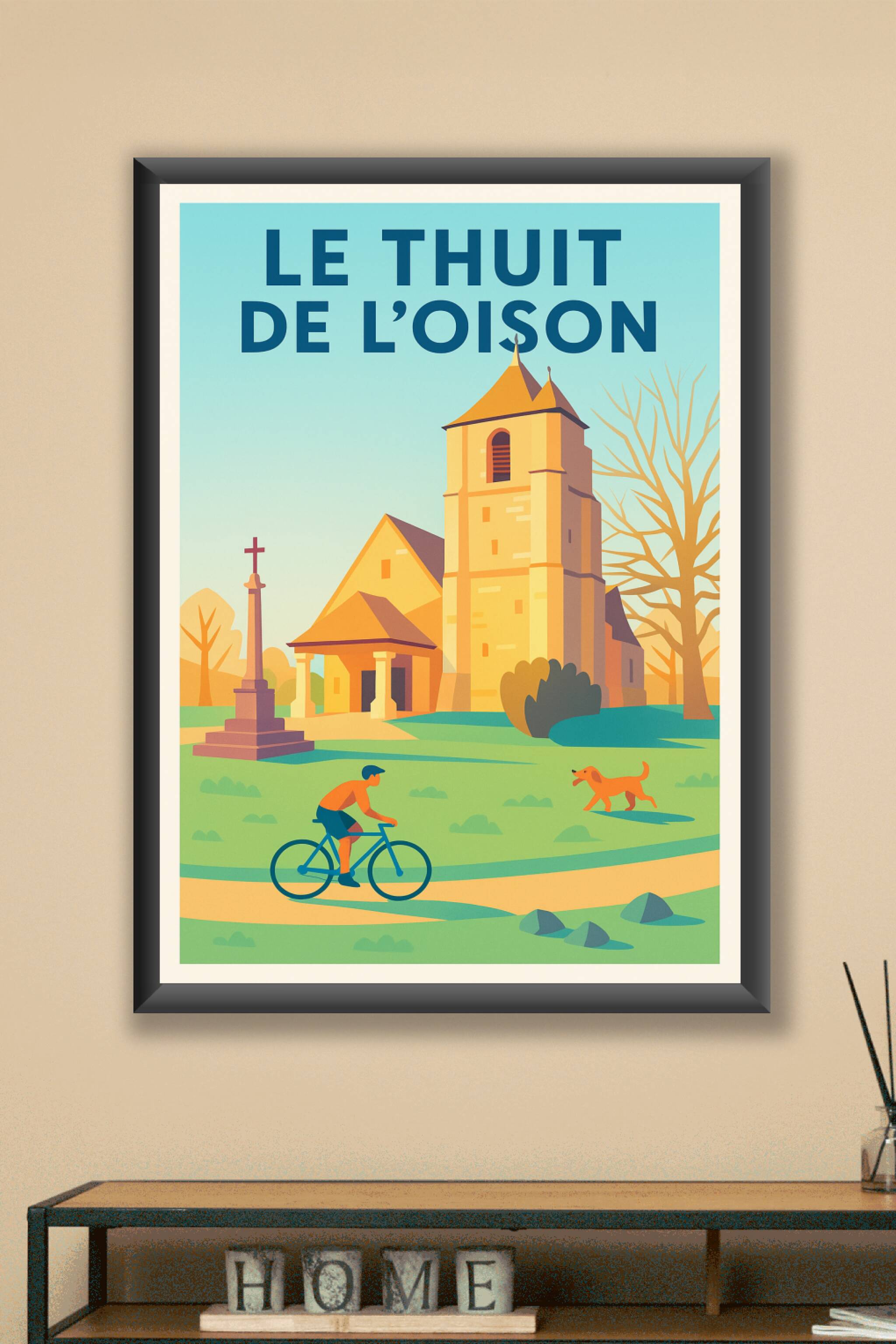 Découvrez l'ambiance sereine et authentique du Thuit de l'Oison avec cette affiche au style rétro et lumineux. Illustrant une scène conviviale où cycliste et chien profitent d'un cadre champêtre dominé par une église ancienne, ce poster invite au calme et à la douceur de vivre normande. Imprimée en tirage "Fine Art" sur un papier 305g coton d'une qualité remarquable, cette affiche sublime les détails et couleurs, pour une décoration élégante et durable. Disponible en formats de A1 à A4, avec ou sans cadre, elle est idéale pour apporter une touche vintage et chaleureuse à votre intérieur ou pour offrir un souvenir plein de charme.