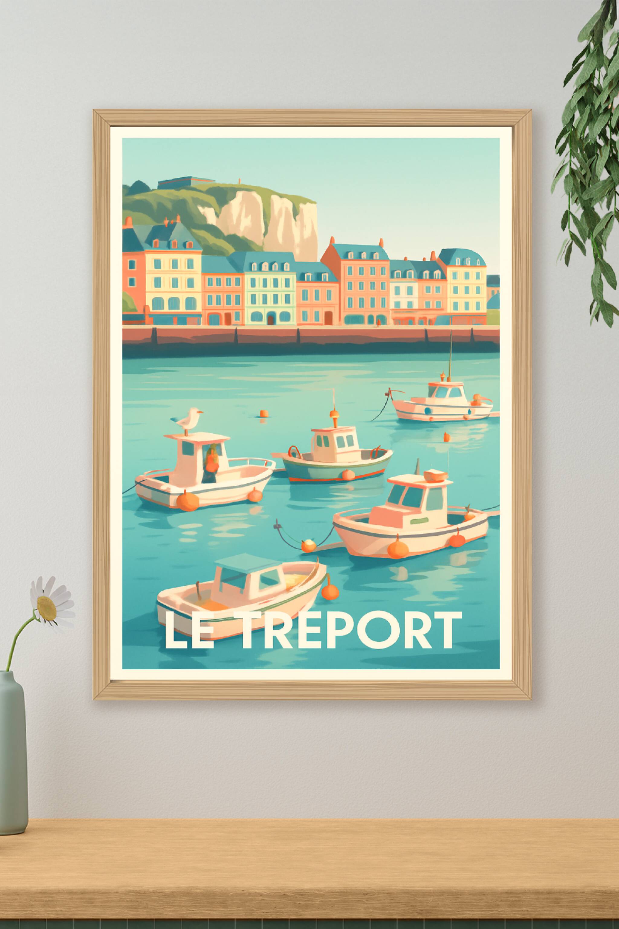 Découvrez la douceur de vivre au bord de la mer avec cette affiche illustrant le port de Le Tréport et ses pittoresques bateaux dans une palette de...