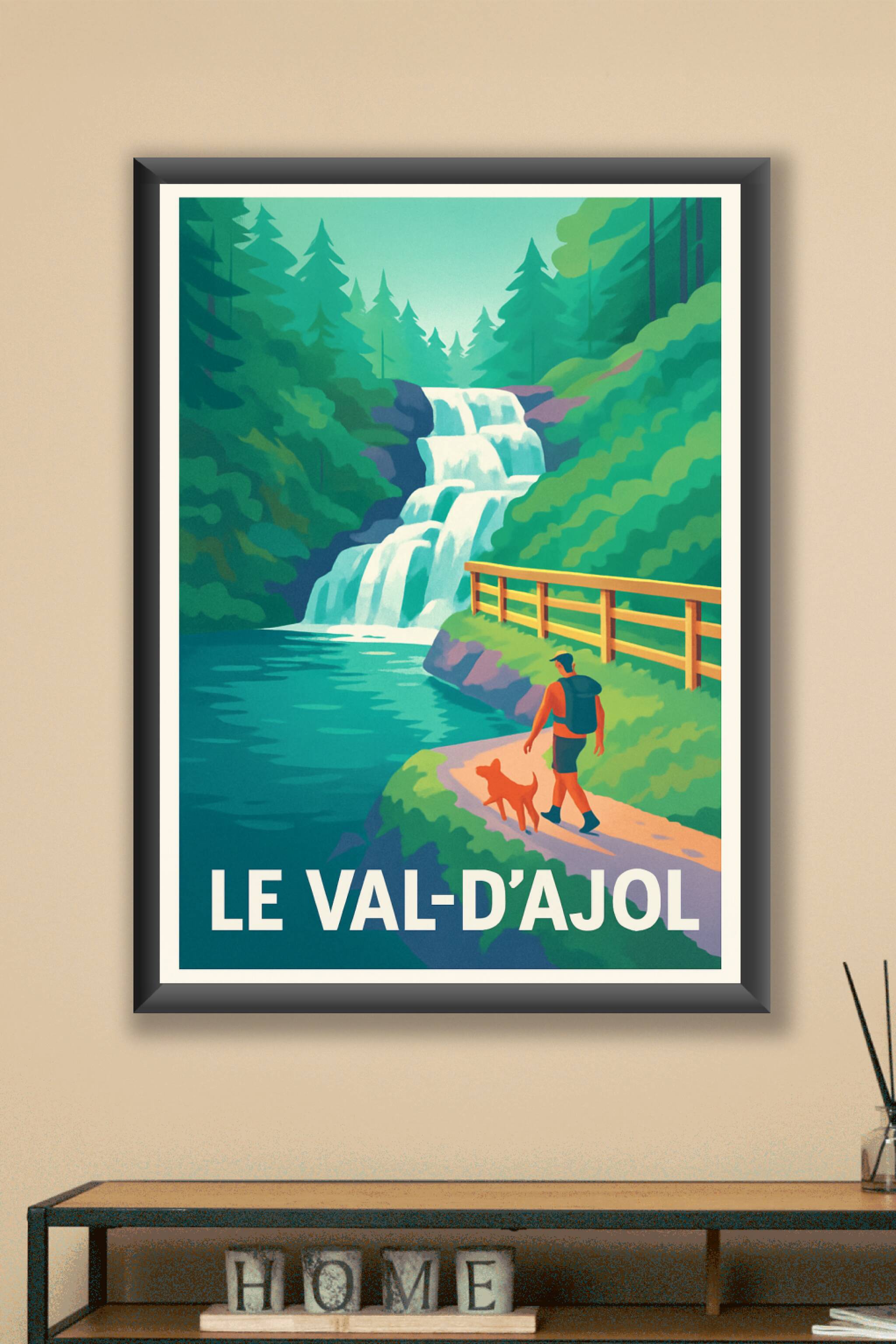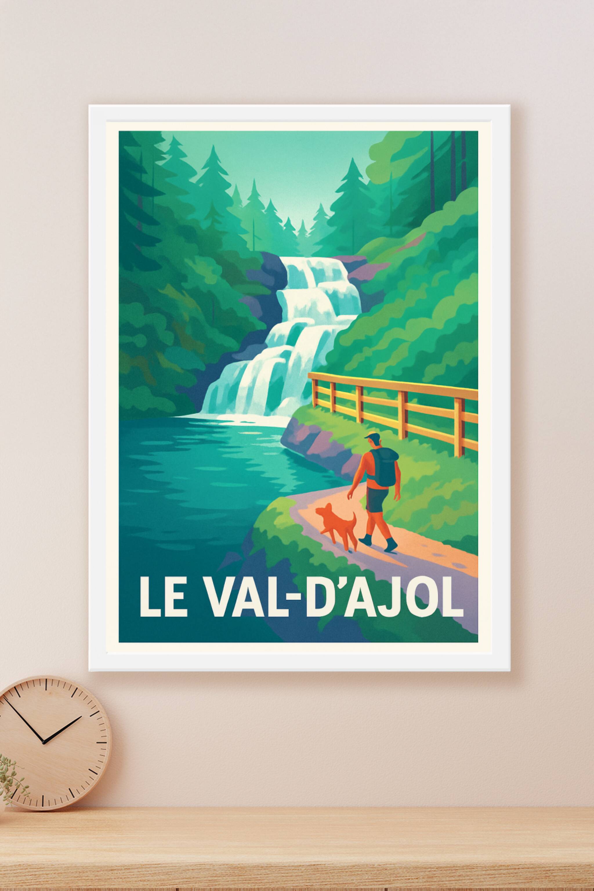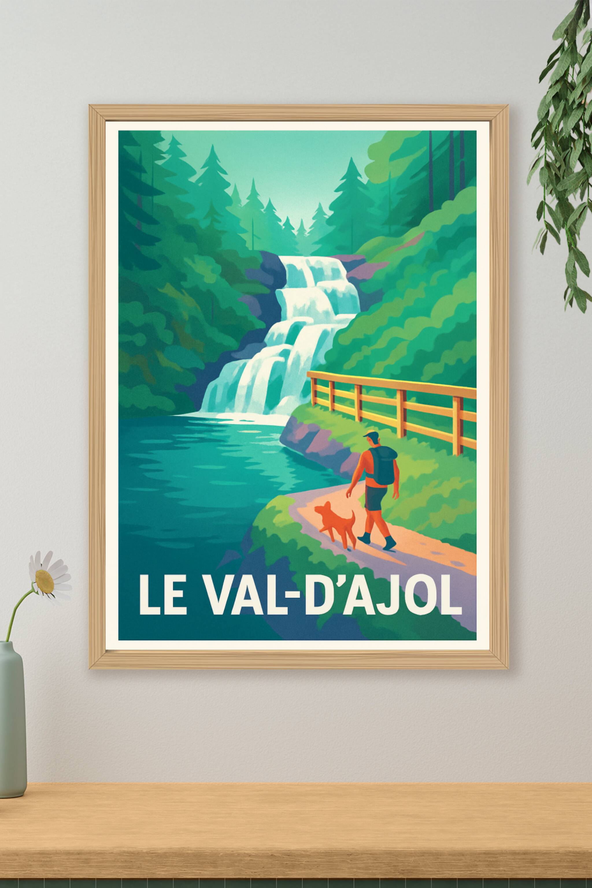 Découvrez la beauté naturelle du Val-d'Ajol avec cette affiche illustrée mettant en scène un paysage enchanteur où une cascade majestueuse se déver...