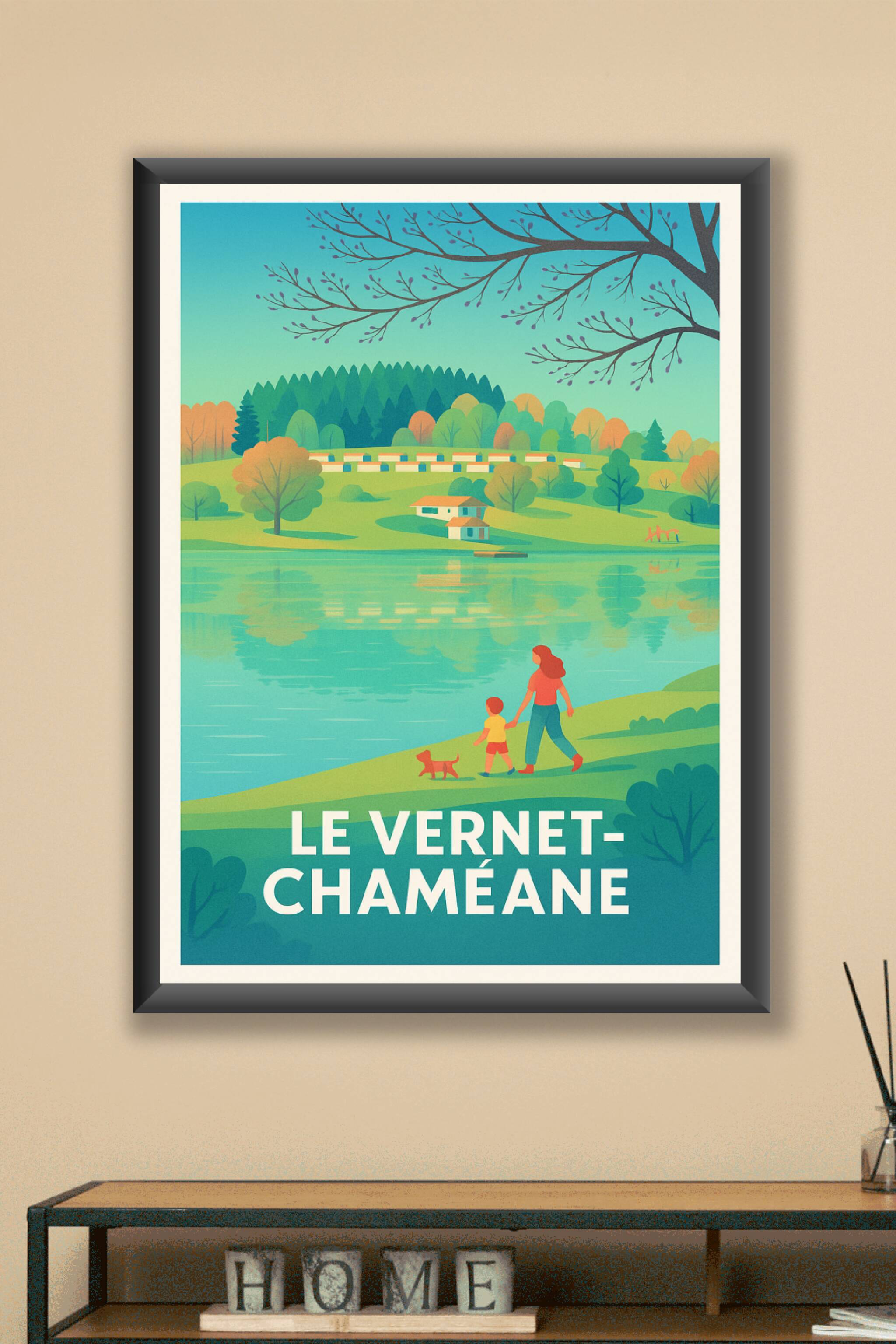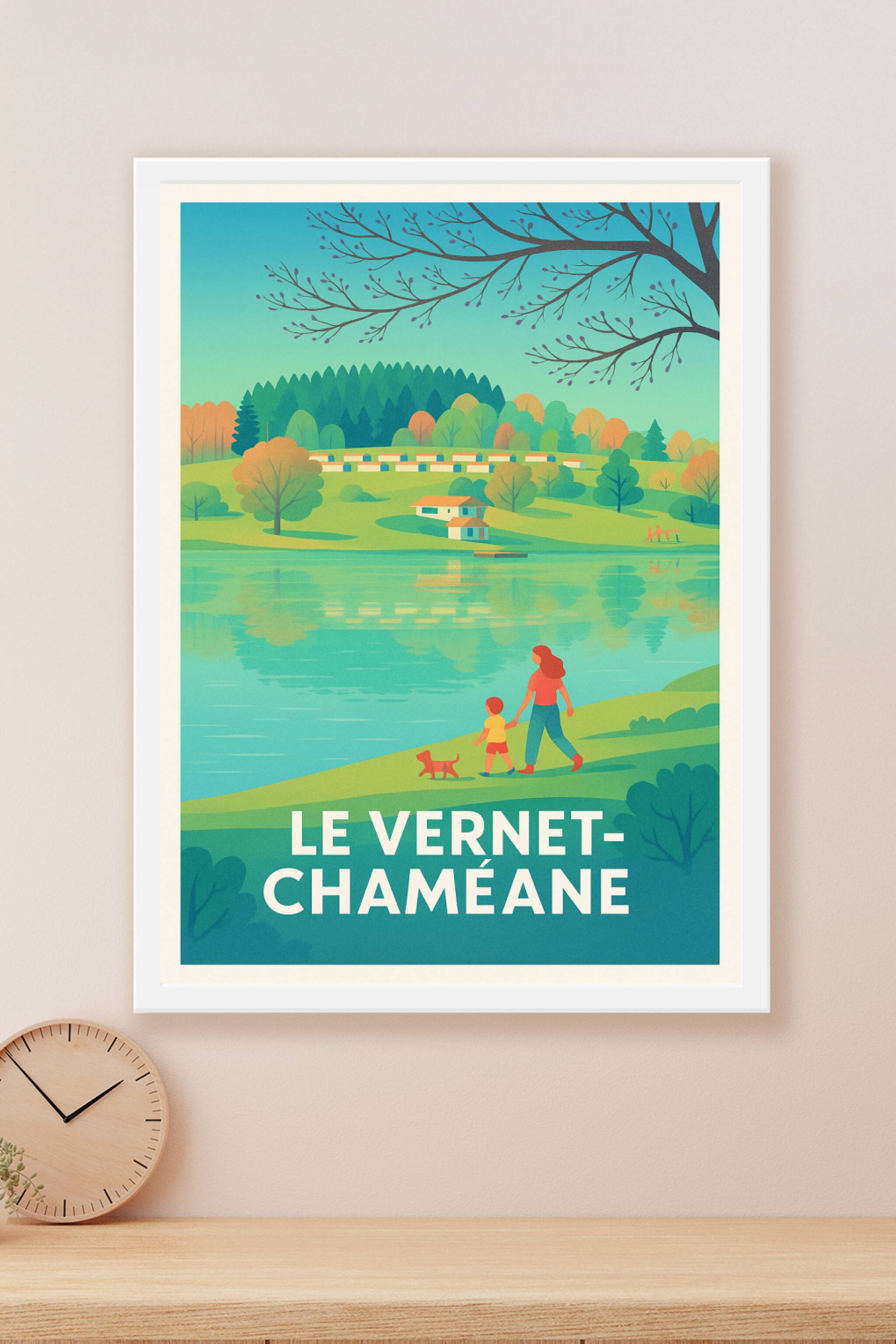 Découvrez la sérénité de Le Vernet-Chaméane à travers cette affiche au style doux et apaisant, qui met en scène une promenade en famille au bord d'...