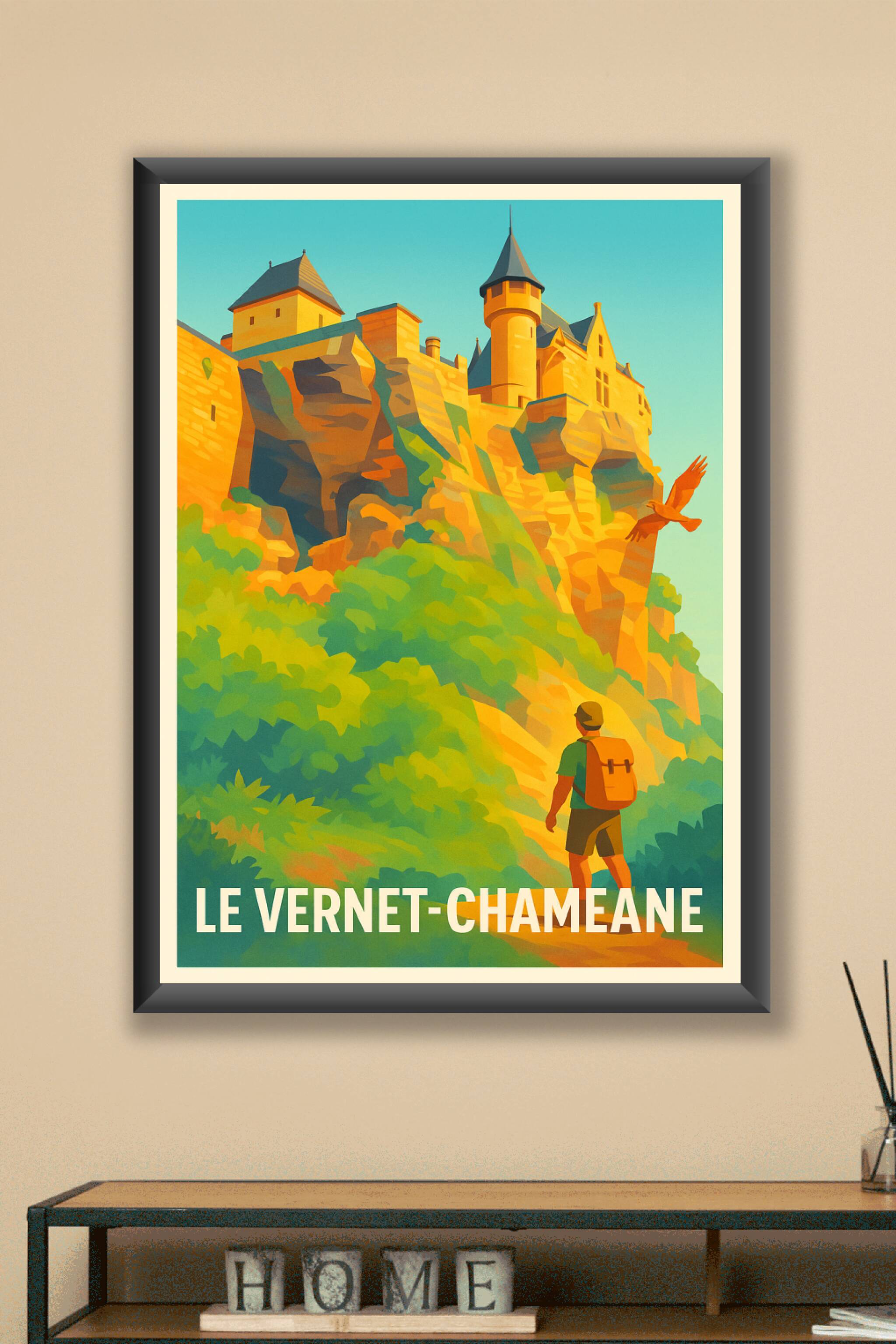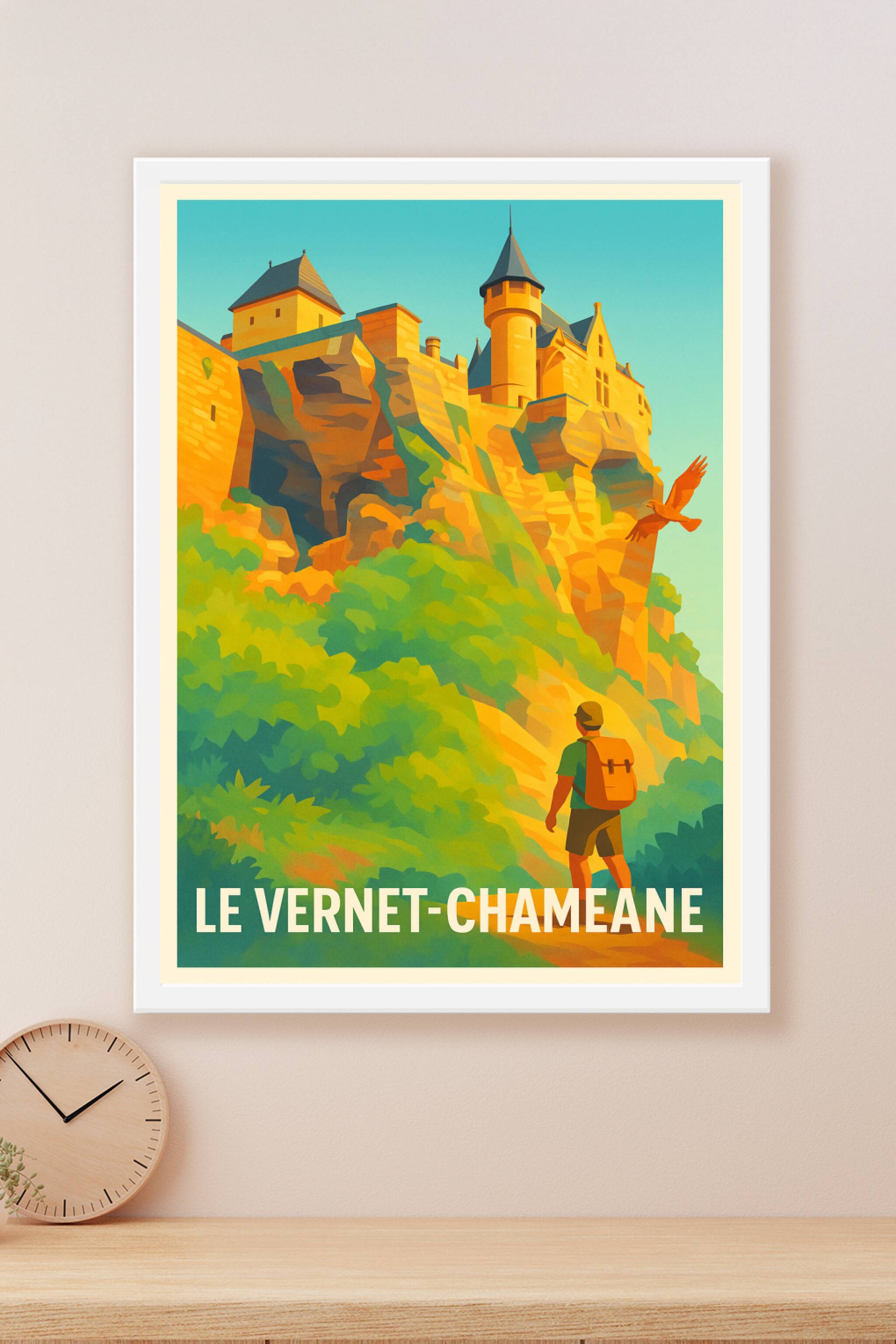 Découvrez la majesté du château du Vernet-Chaméane avec cette affiche illustrée à l'atmosphère lumineuse et vibrante. Ce poster évoque la beauté na...