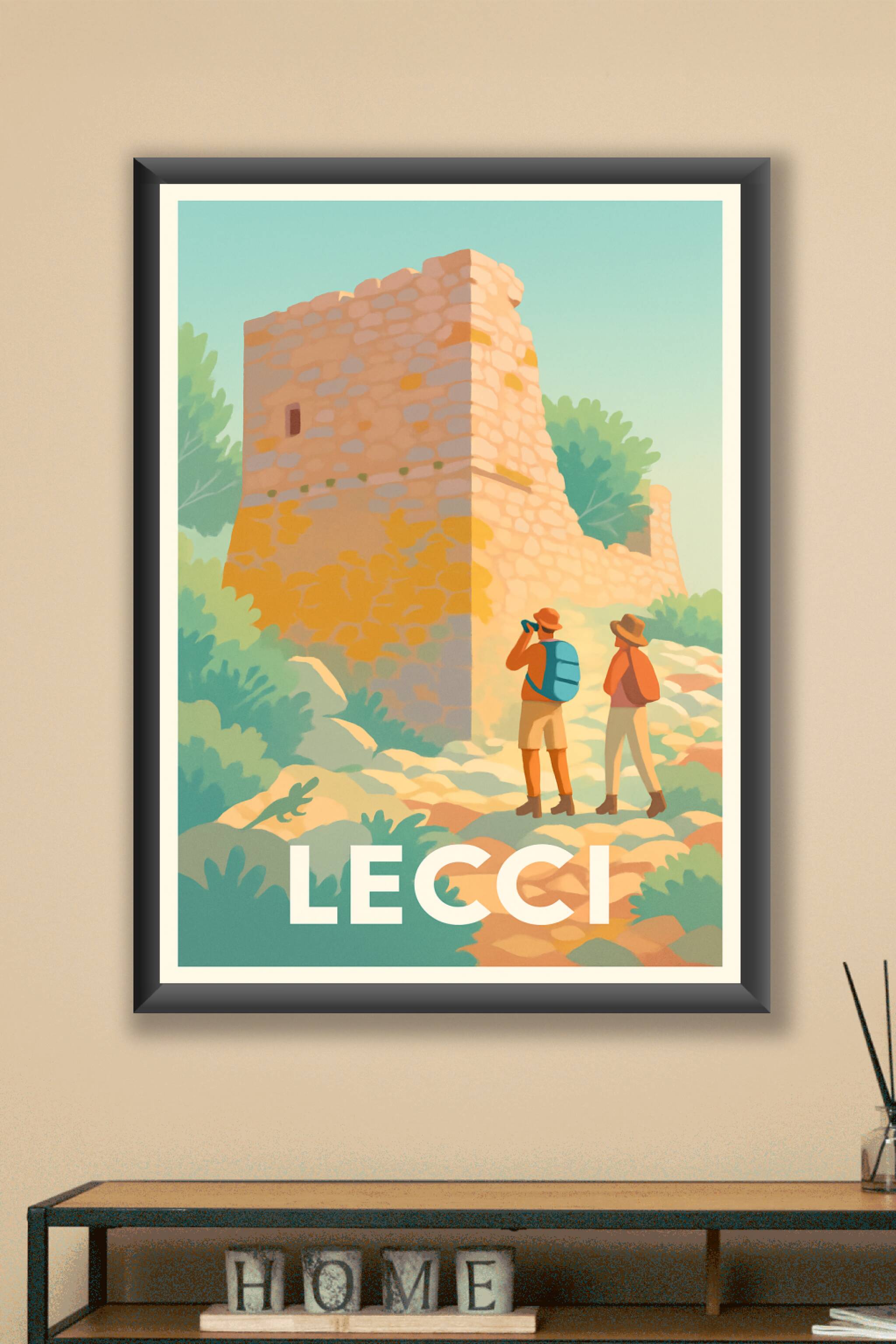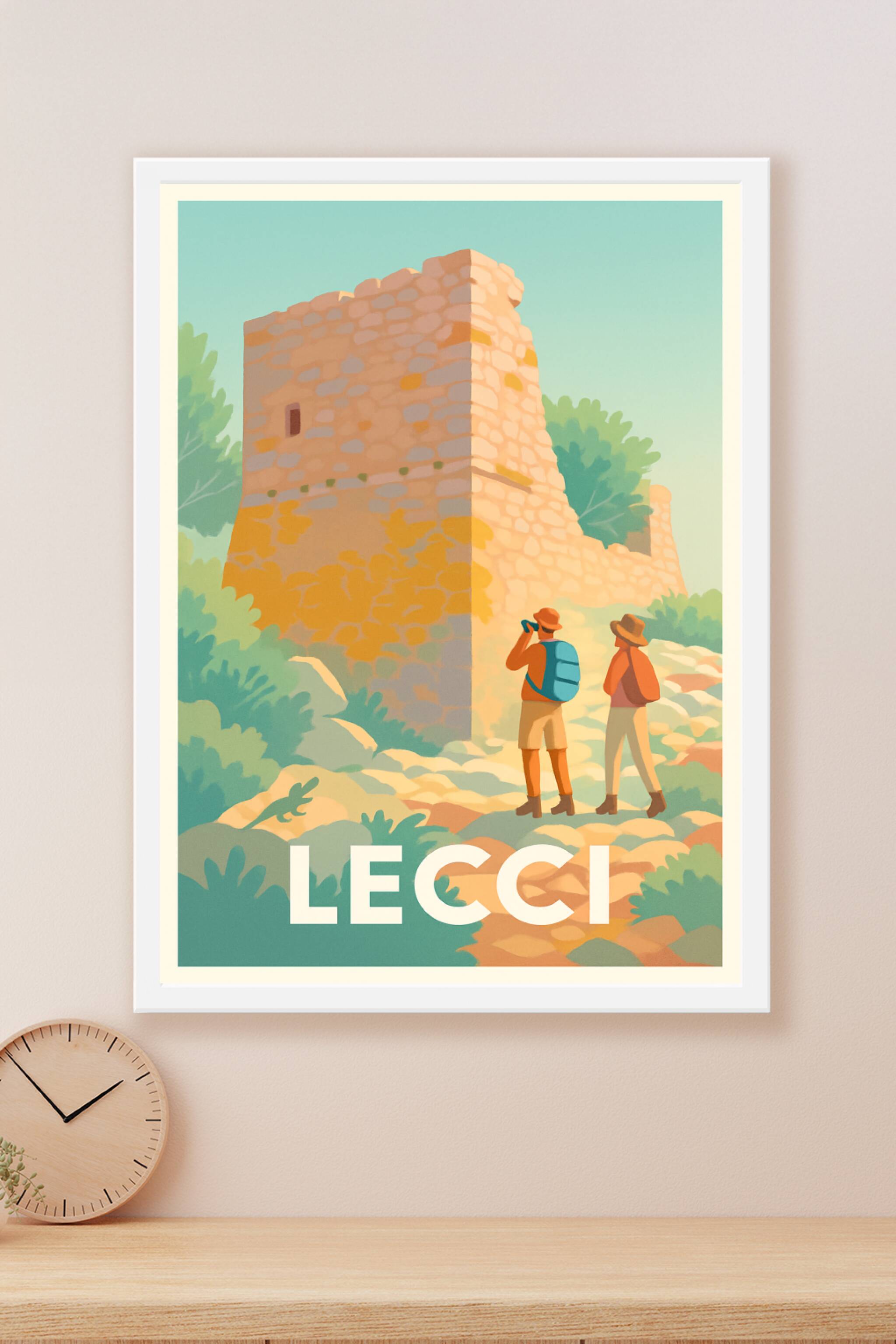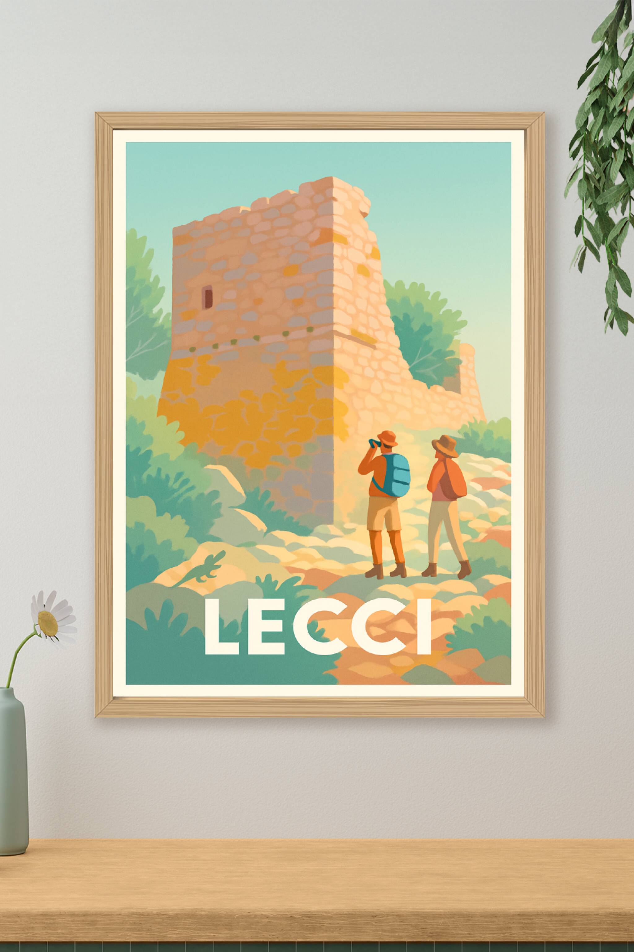 Découvrez la charmante commune de Lecci à travers cette affiche illustrée, mettant en avant une ancienne tour en pierre entourée d'une nature luxur...