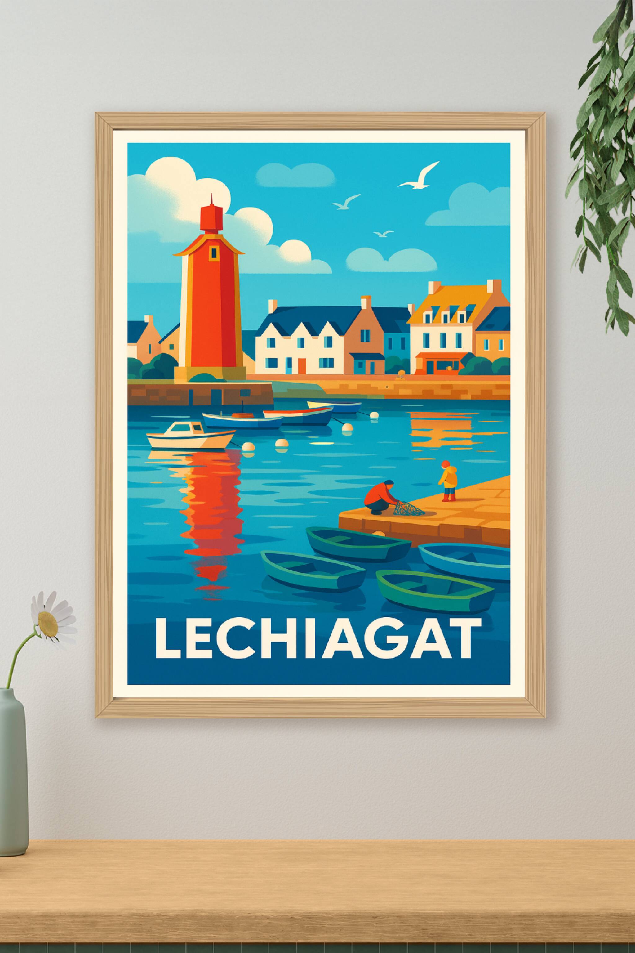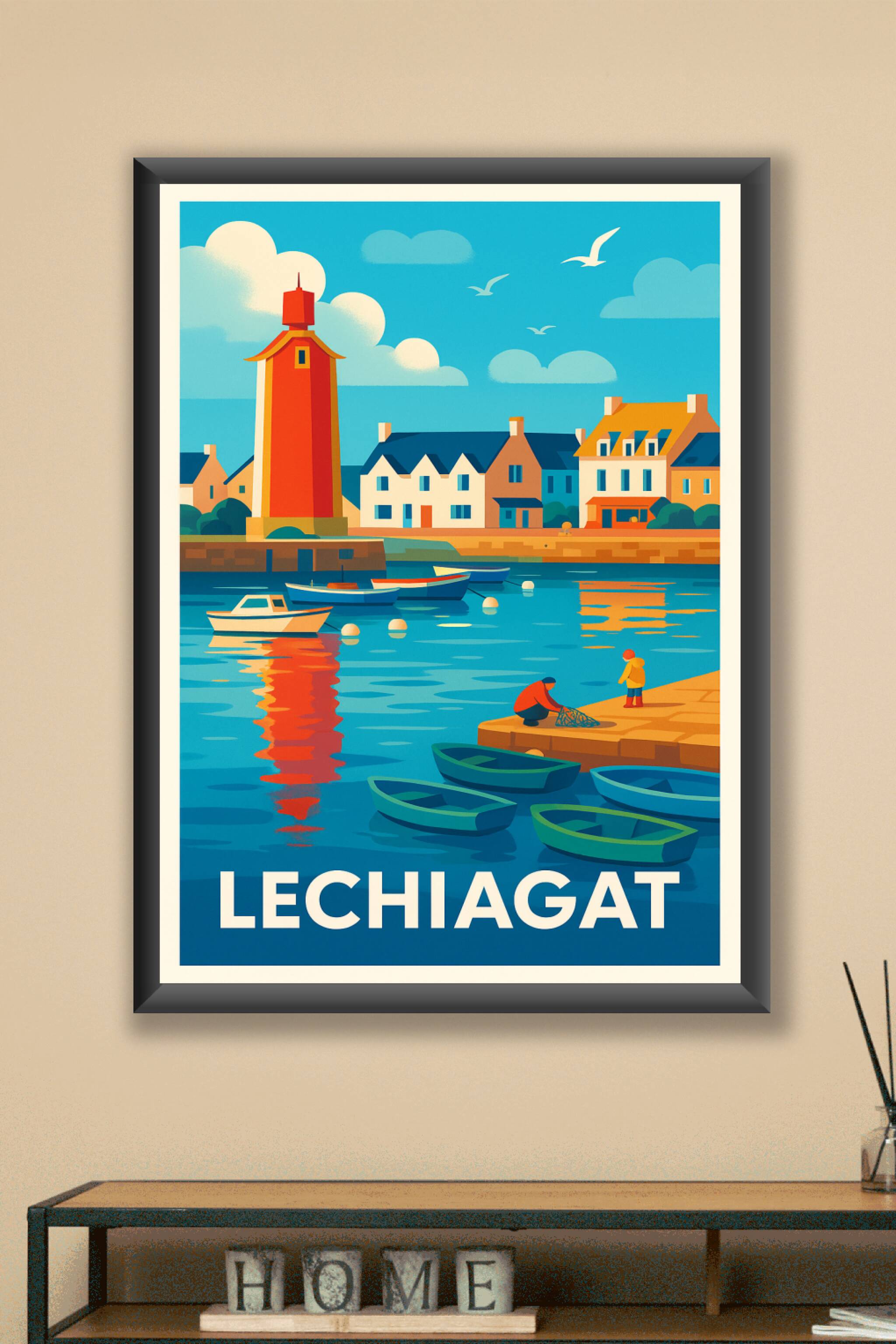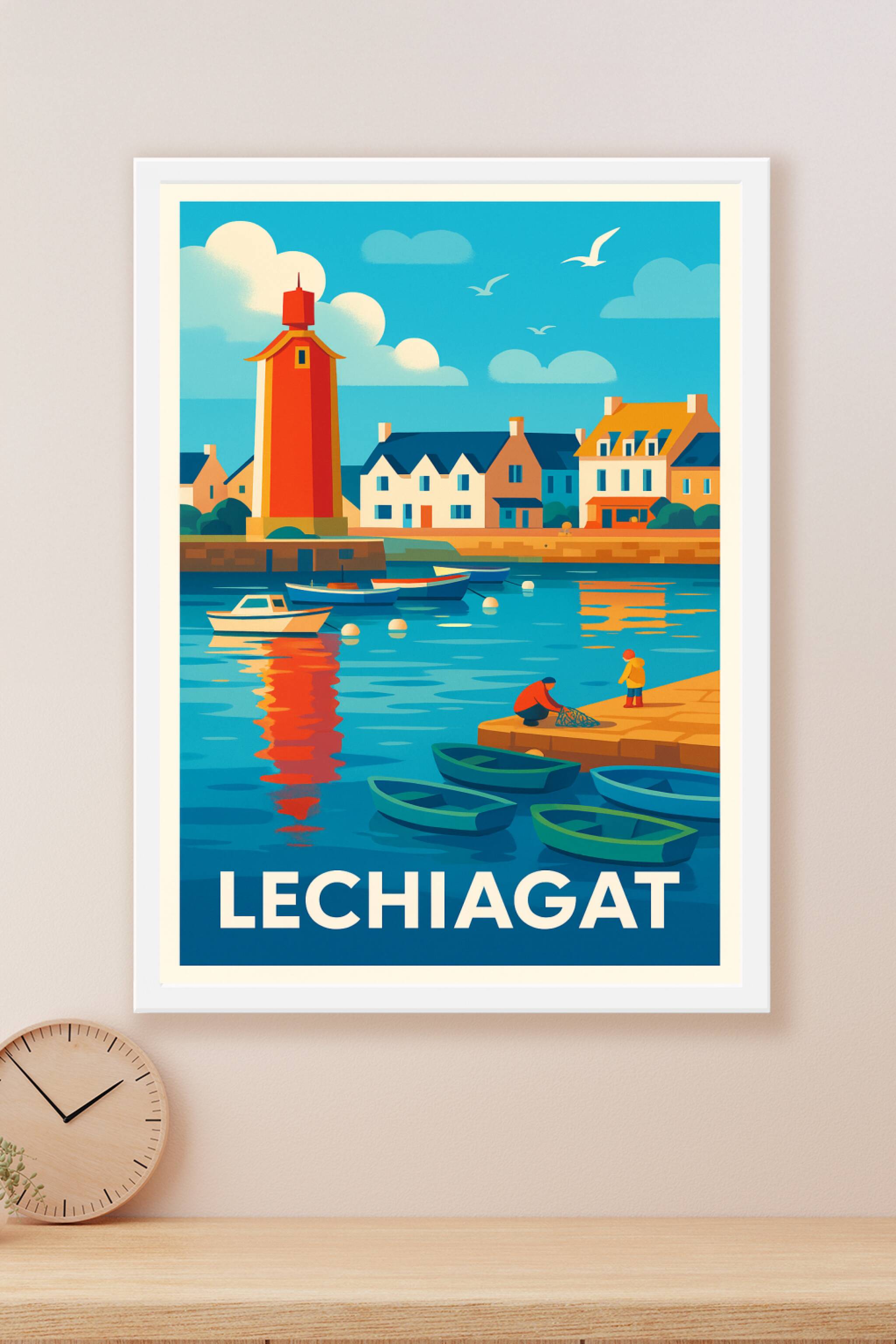 Découvrez l'ambiance paisible et colorée du port de Lechiagat à travers cette affiche illustrée au style vintage. Ce poster évoque la douceur de vi...
