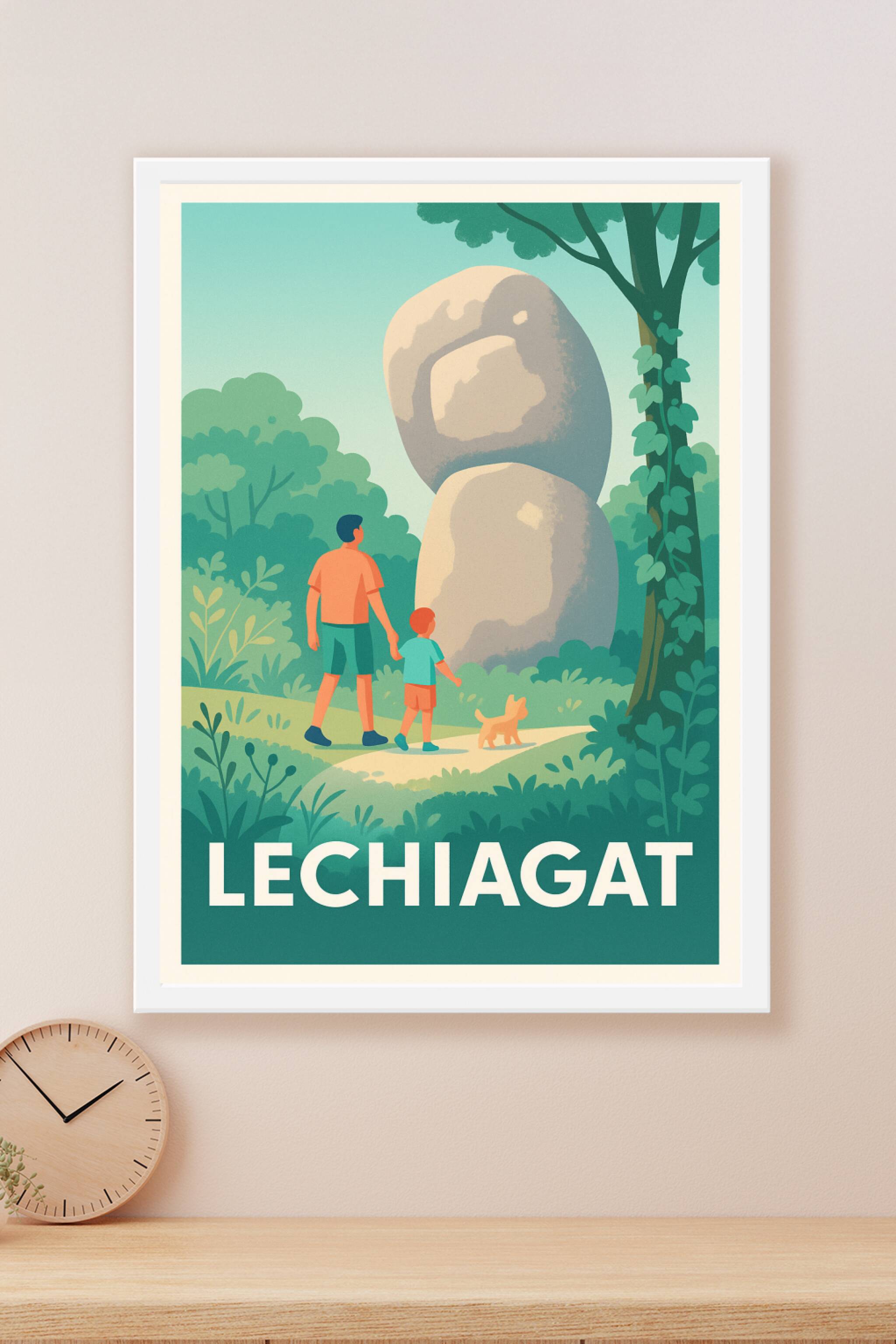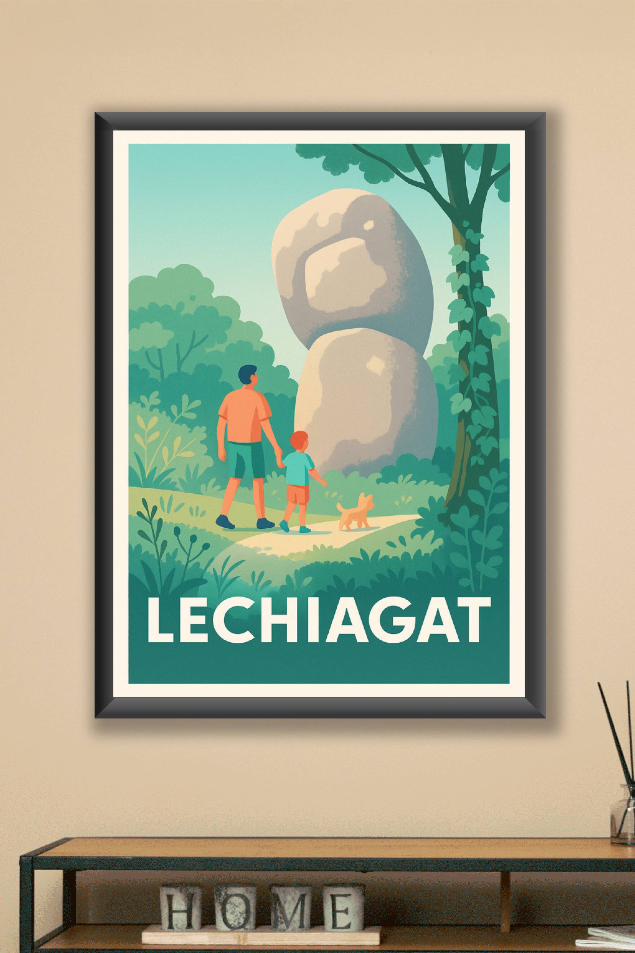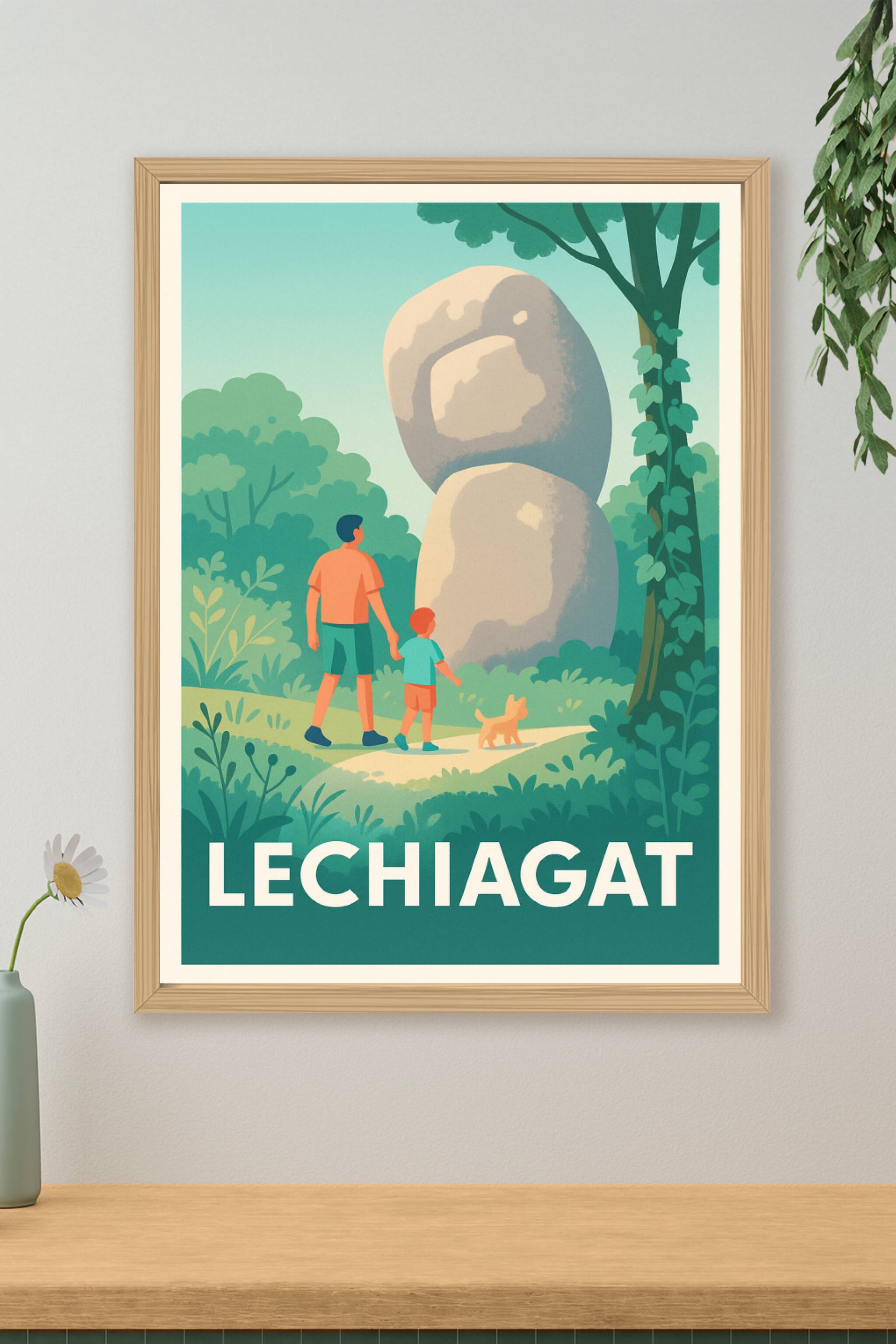 Cette affiche au style vintage illustre une scène paisible à Lechiagat, où se mêlent nature verdoyante et patrimoine mystérieux représenté par un g...
