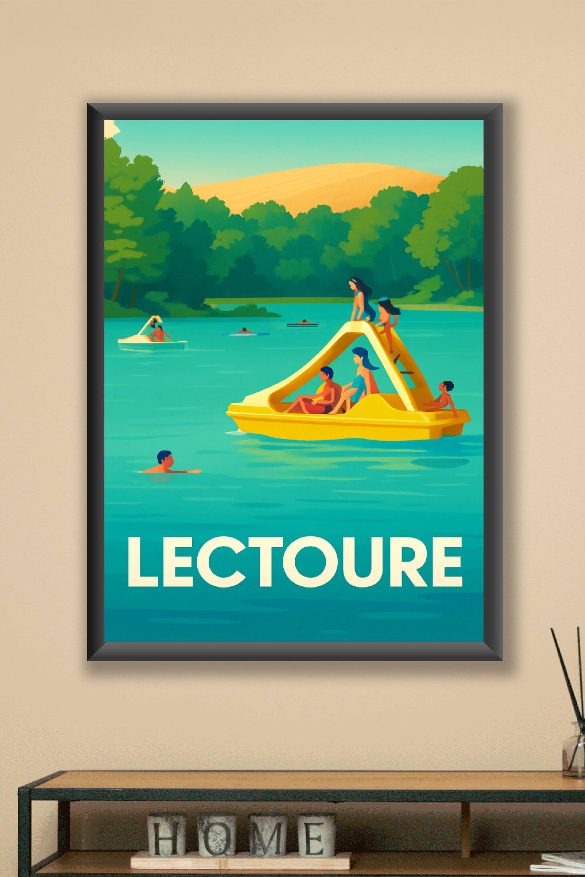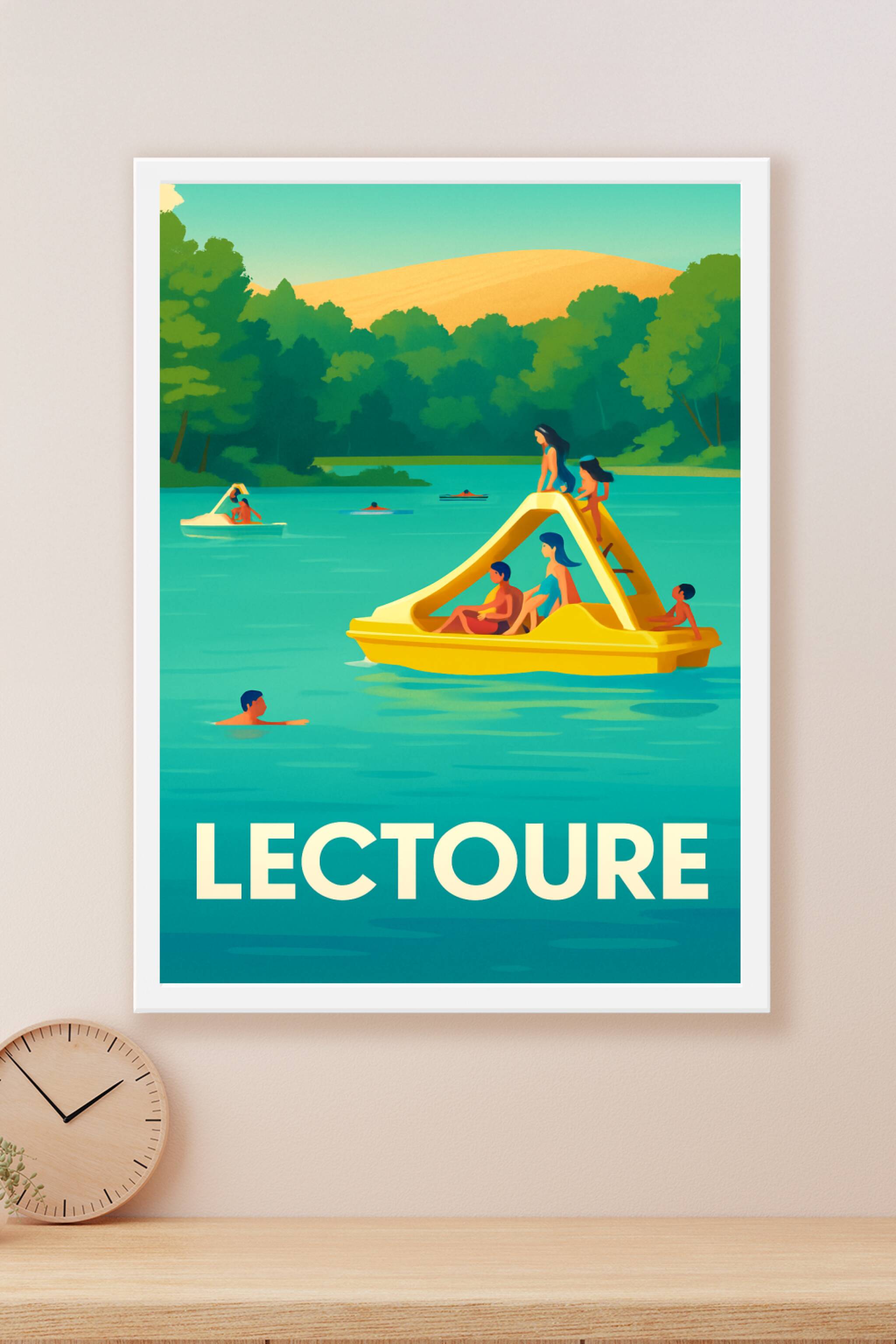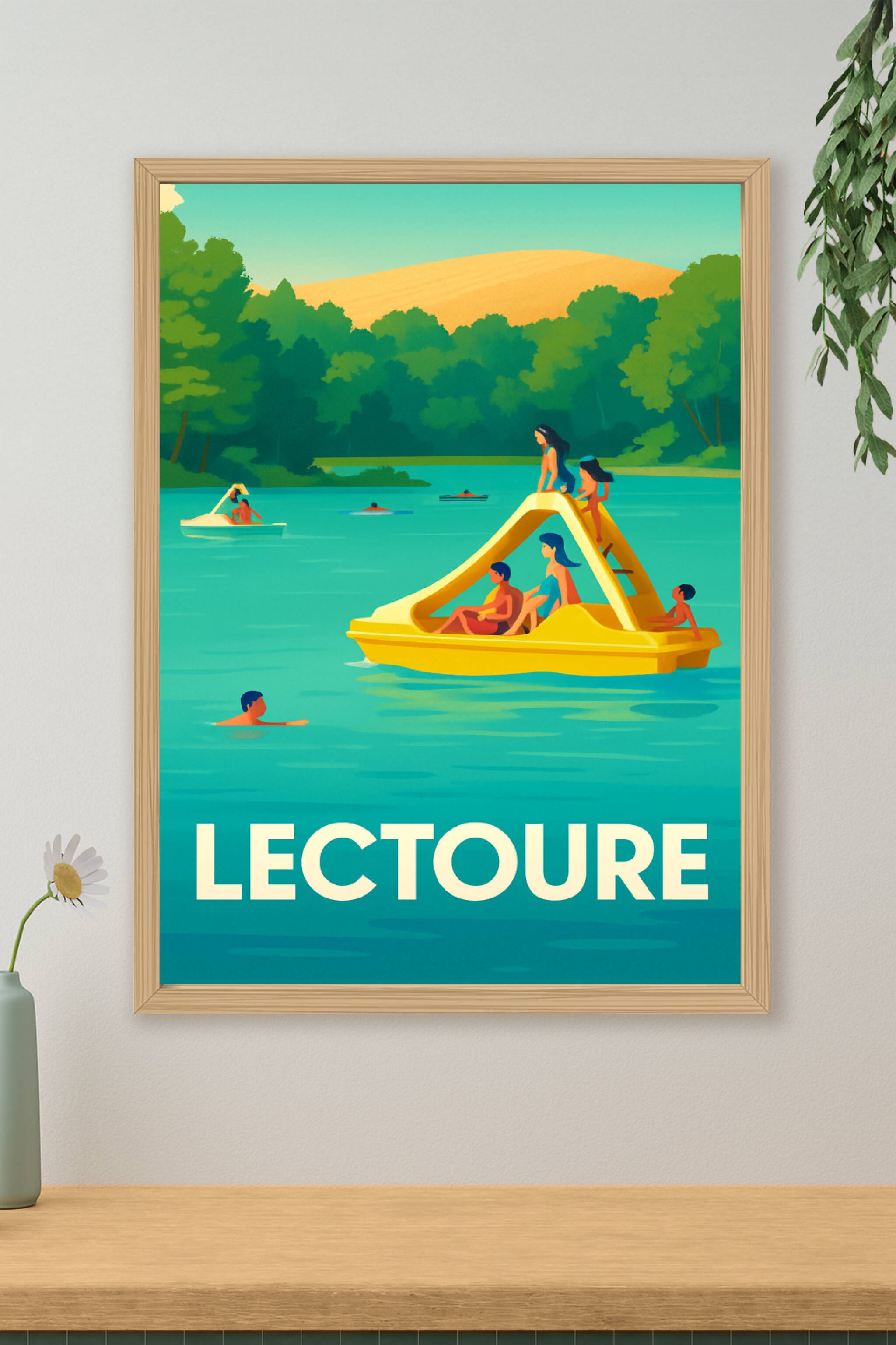 Découvrez l'ambiance paisible et rafraîchissante de Lectoure avec cette affiche illustrée mettant en scène une baignade conviviale au cœur d'un lac...