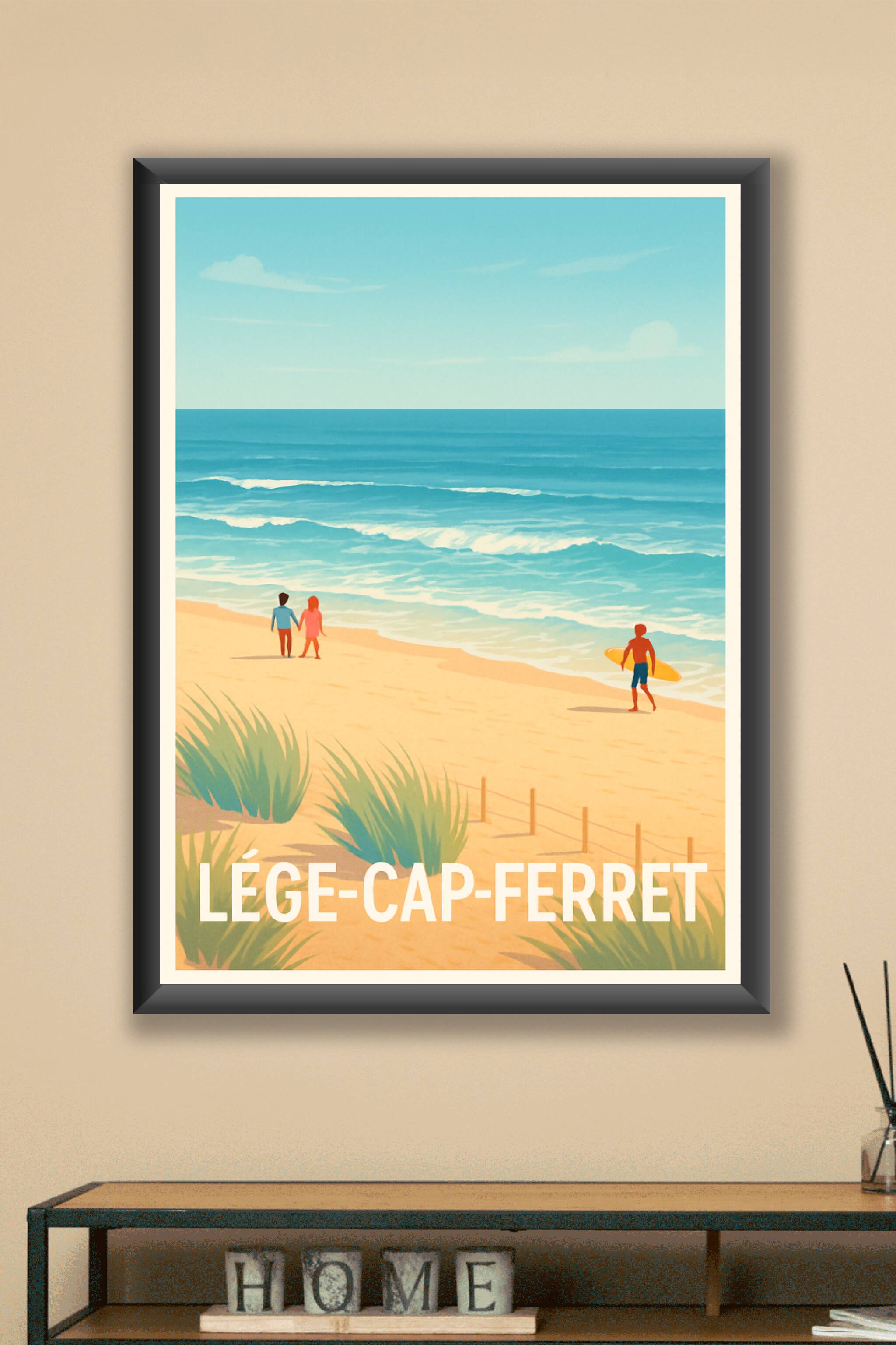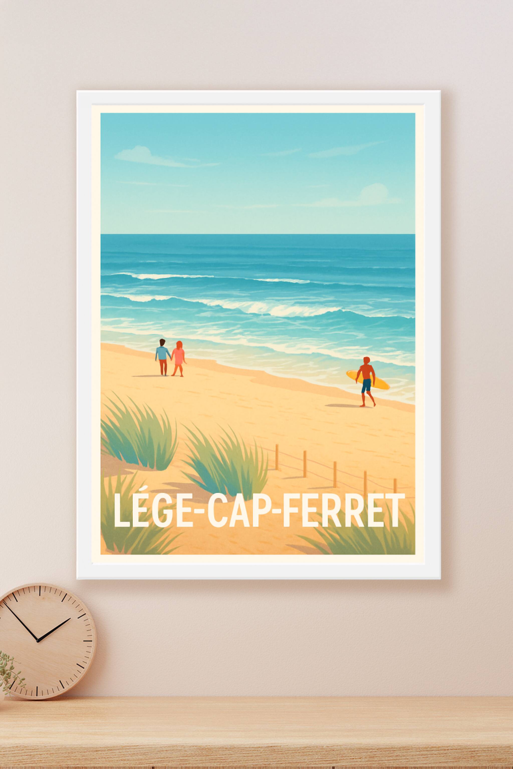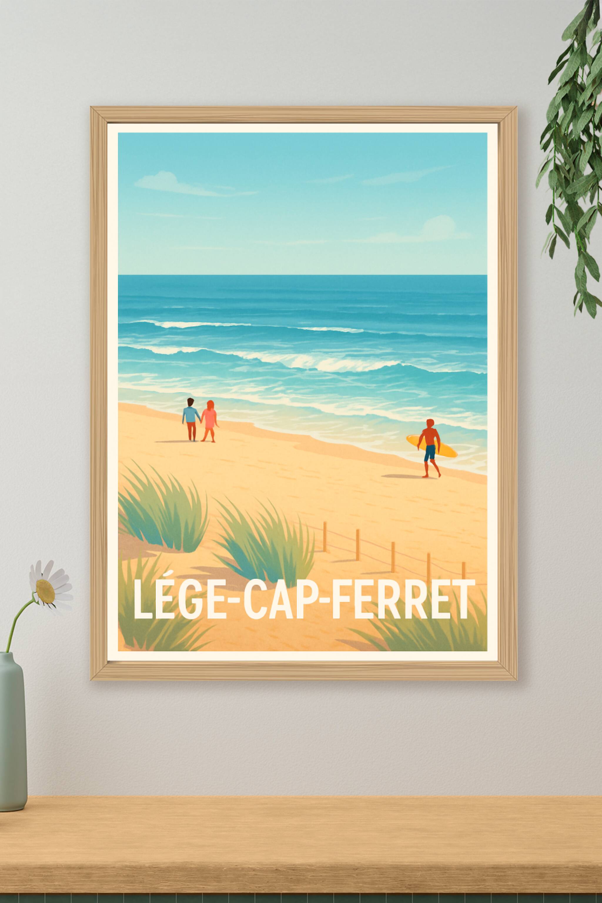 Découvrez la sérénité de Lège-Cap-Ferret à travers cette magnifique affiche illustrée, qui capture la quiétude d'une plage bordée par l'océan Atlan...