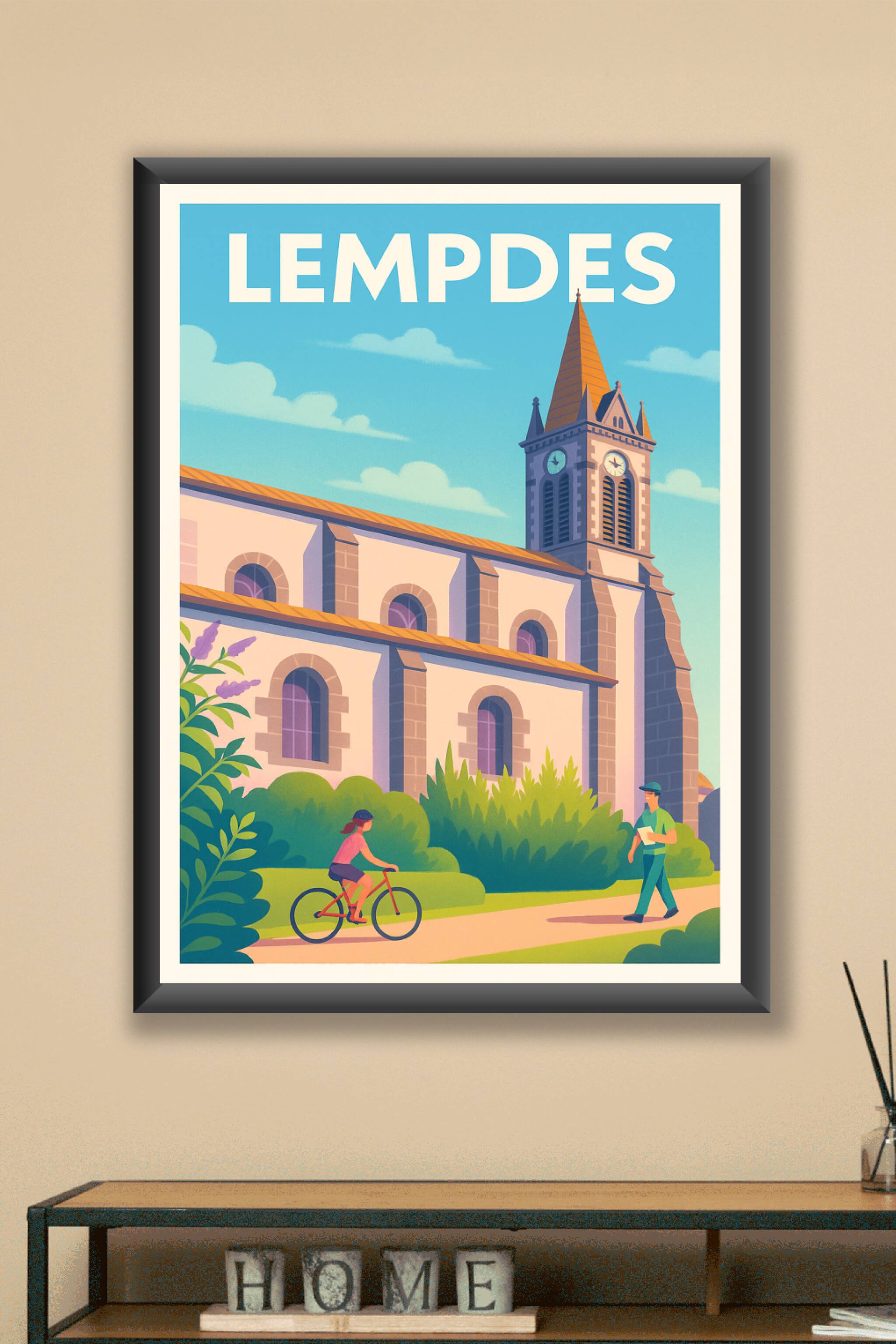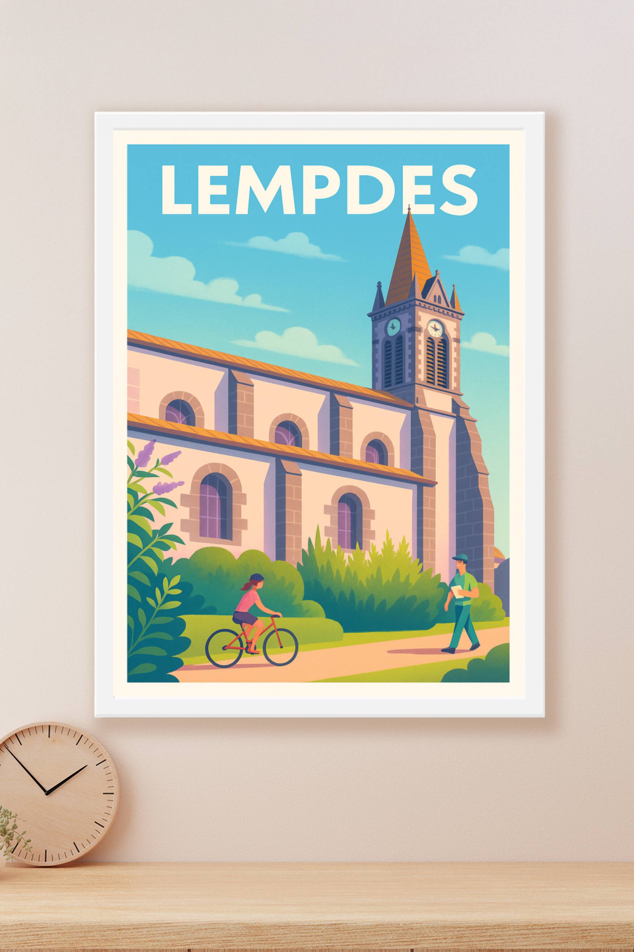 Découvrez la douceur de vivre à Lempdes avec cette affiche illustrée mettant en scène l'église emblématique de la ville sous un ciel dégagé et apai...