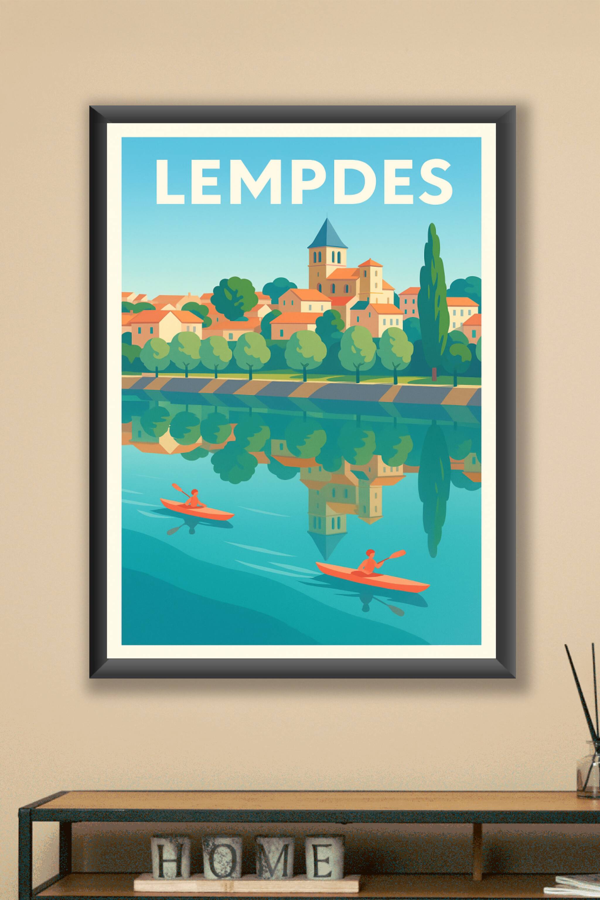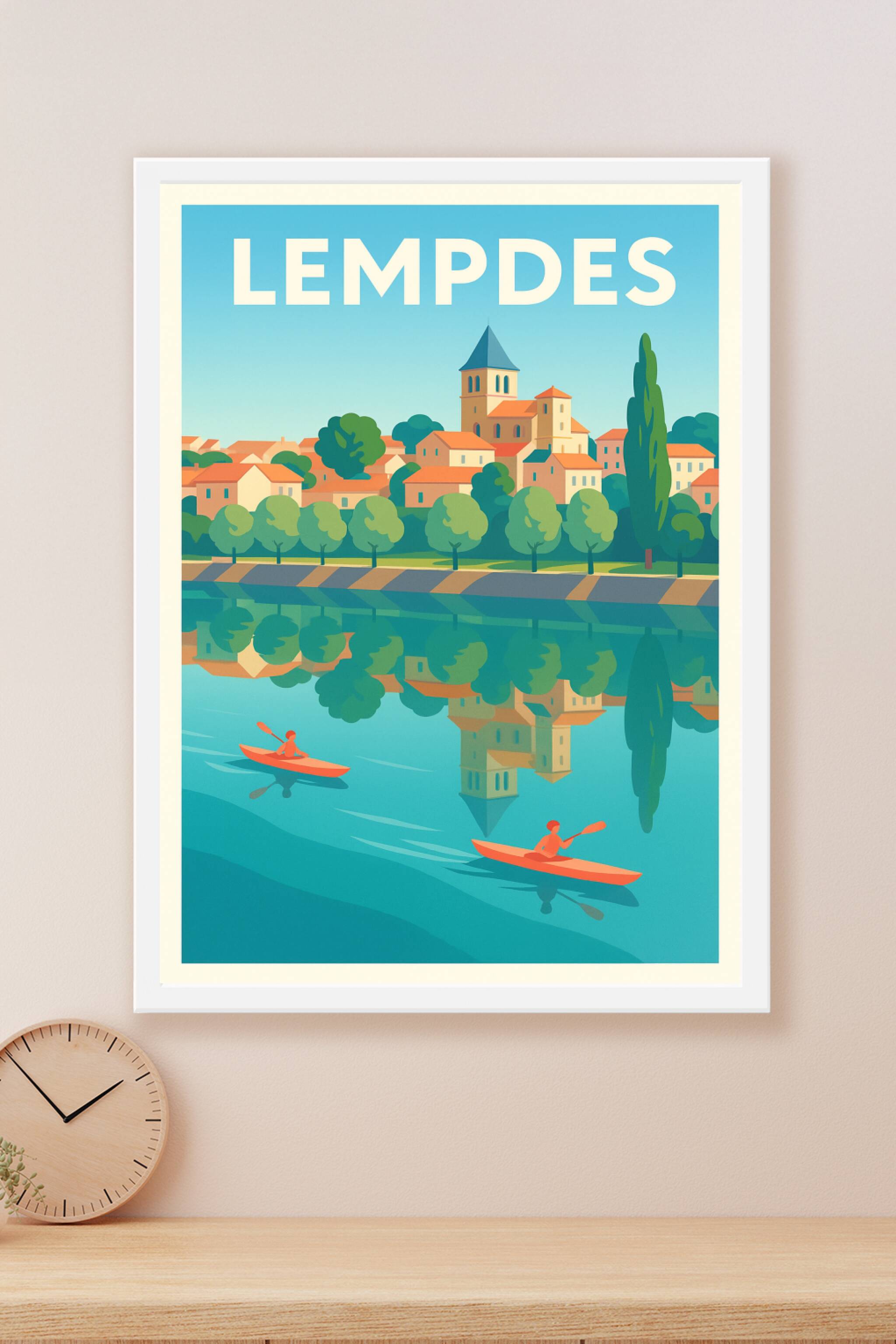 Découvrez la douceur de vivre à Lempdes avec cette superbe affiche illustrée mettant en scène les eaux calmes reflétant les maisons et l'église du ...