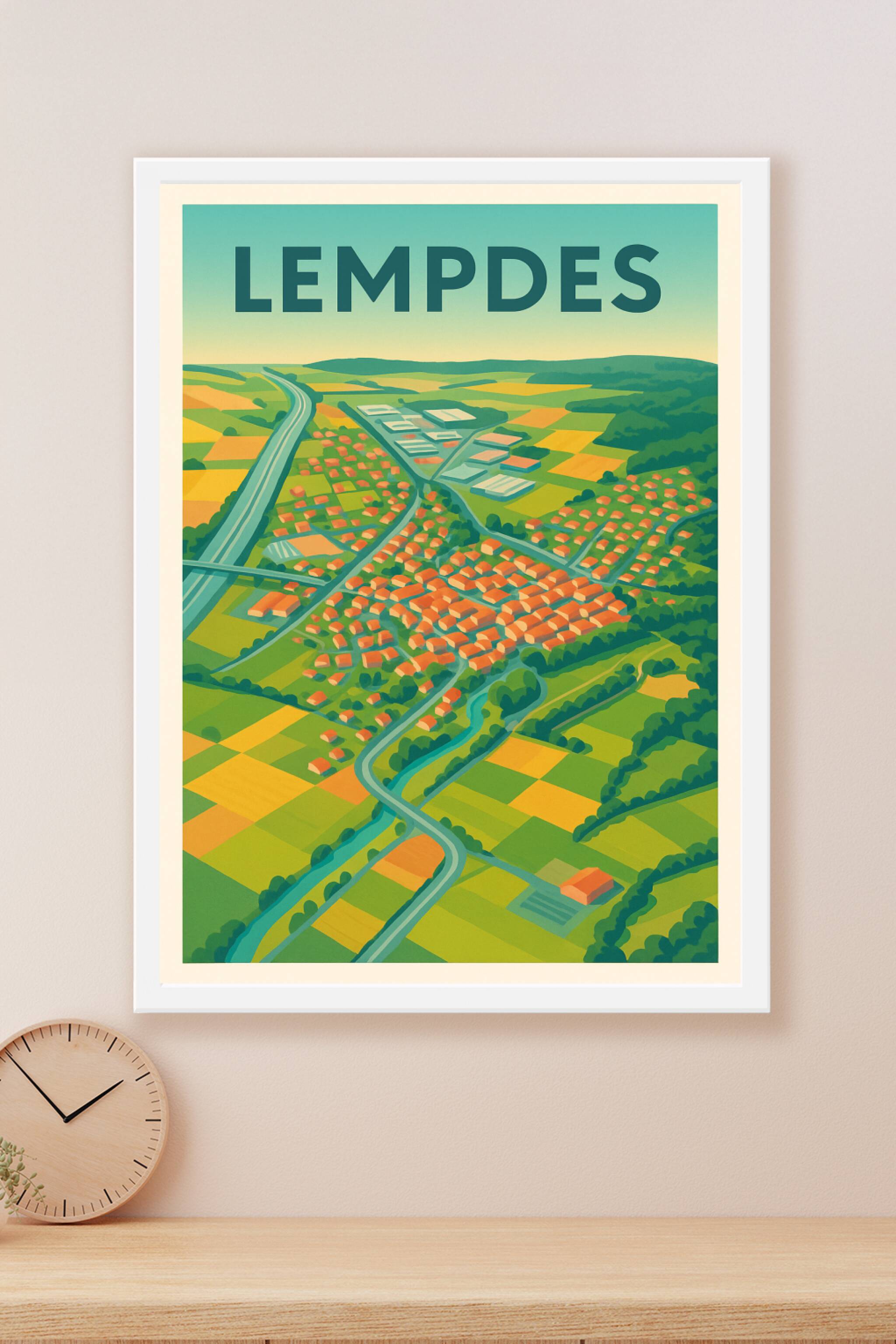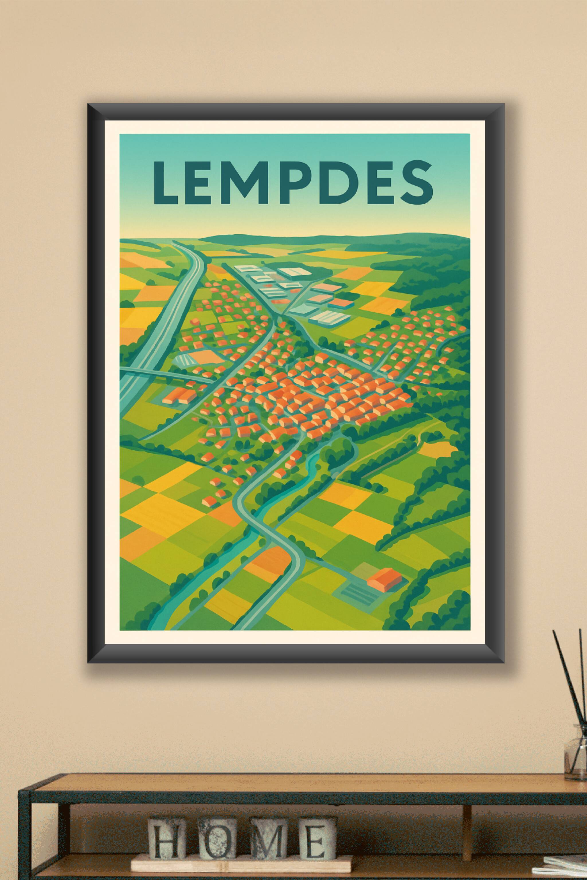 Découvrez l'affiche illustrée de Lempdes, une charmante représentation aérienne qui capture l'harmonie entre urbanisme et nature environnante. Ce p...