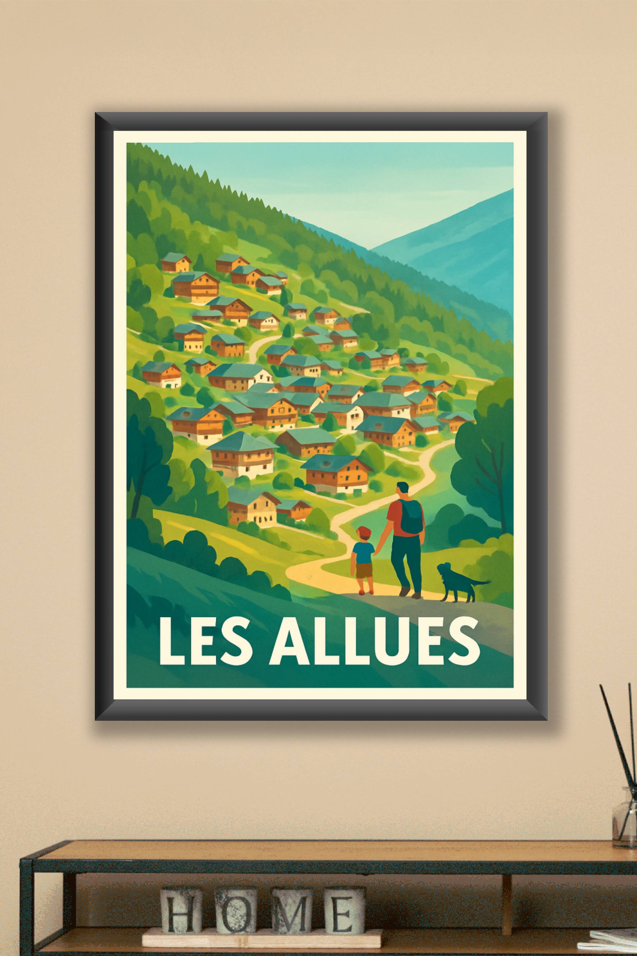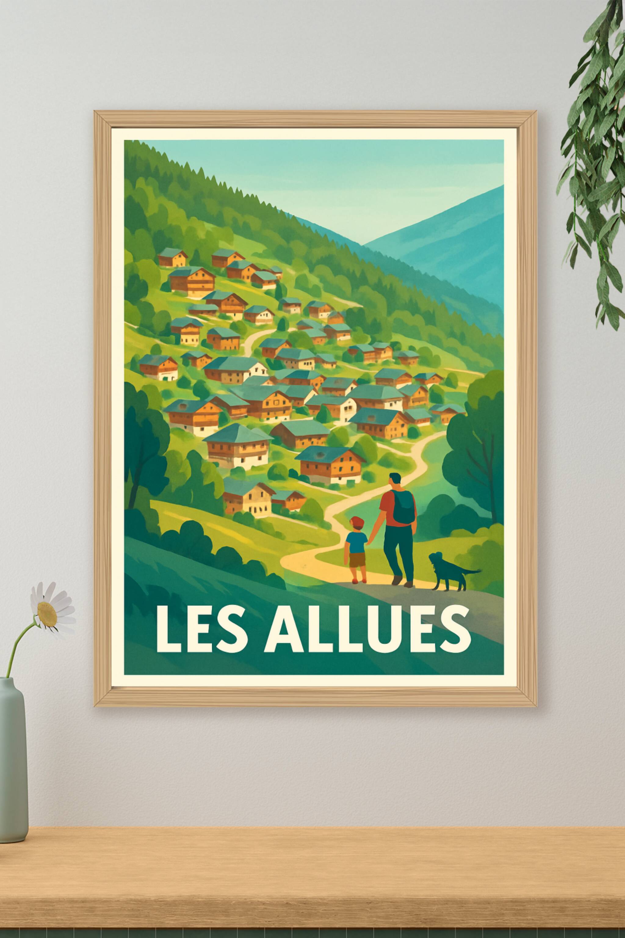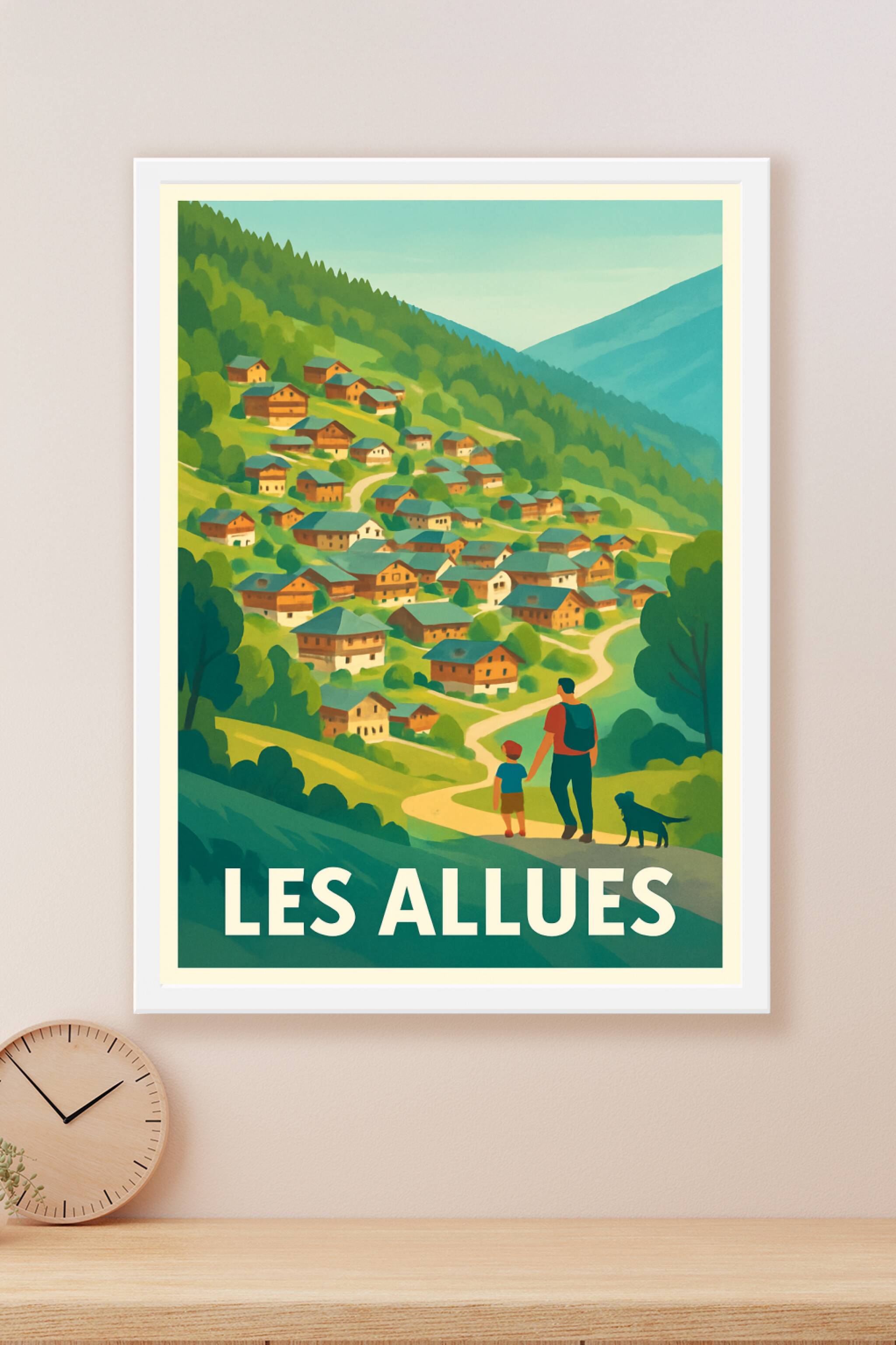 Découvrez le charme authentique du village des Allues à travers cette affiche illustrée au style vintage, évoquant un paysage harmonieux de montagn...
