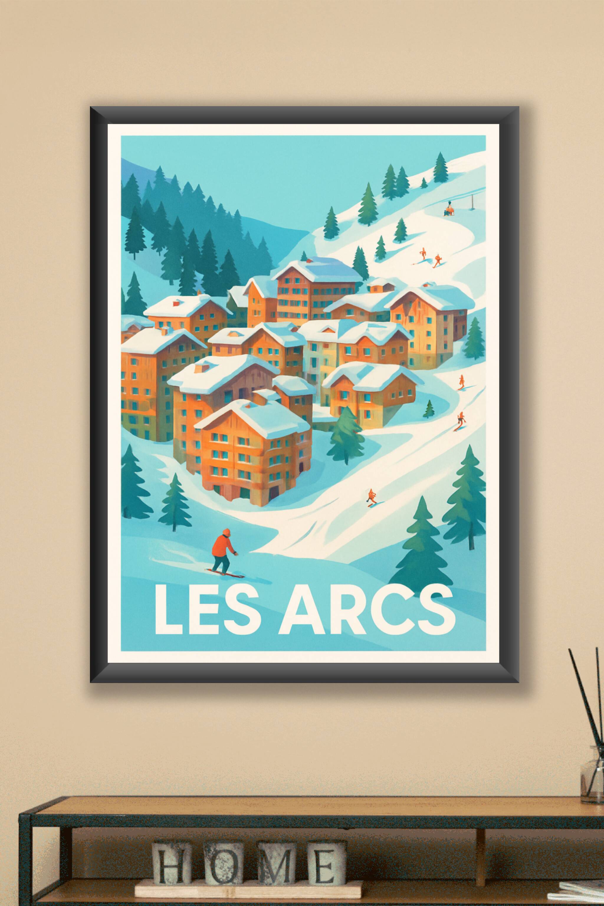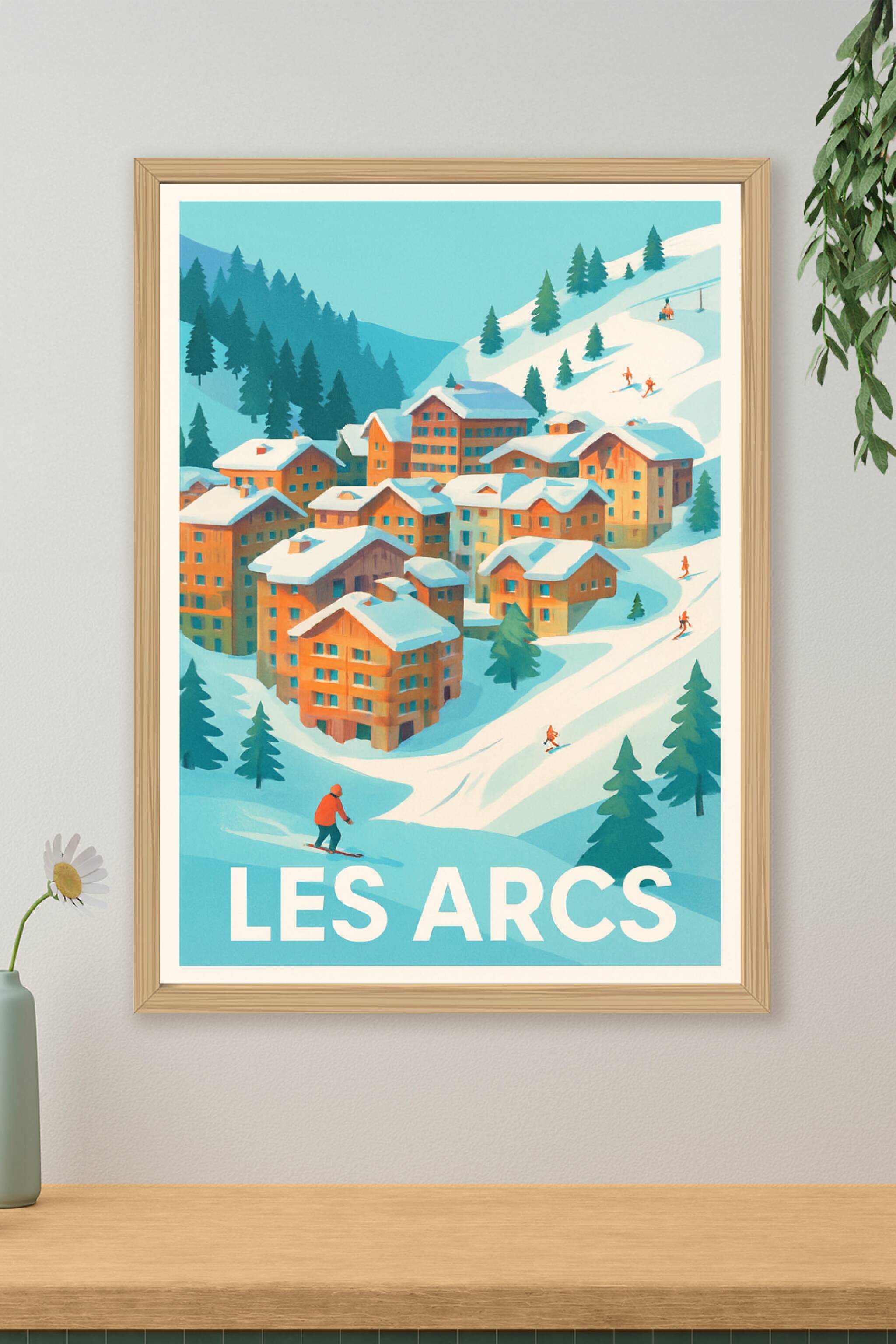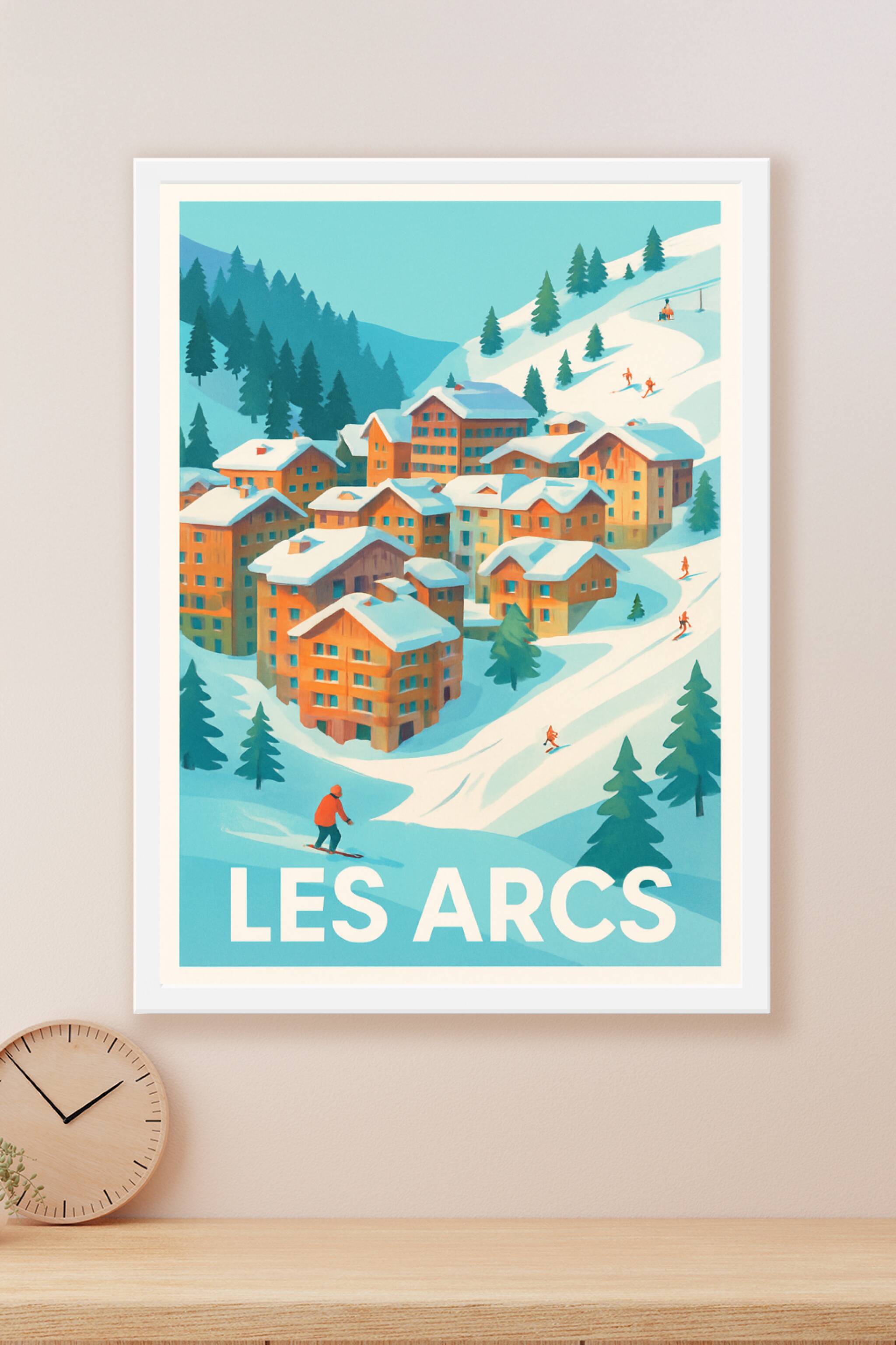 Découvrez l'allure charmante et paisible de la station de ski Les Arcs avec cette affiche illustrée aux couleurs douces et apaisantes. L'ambiance m...