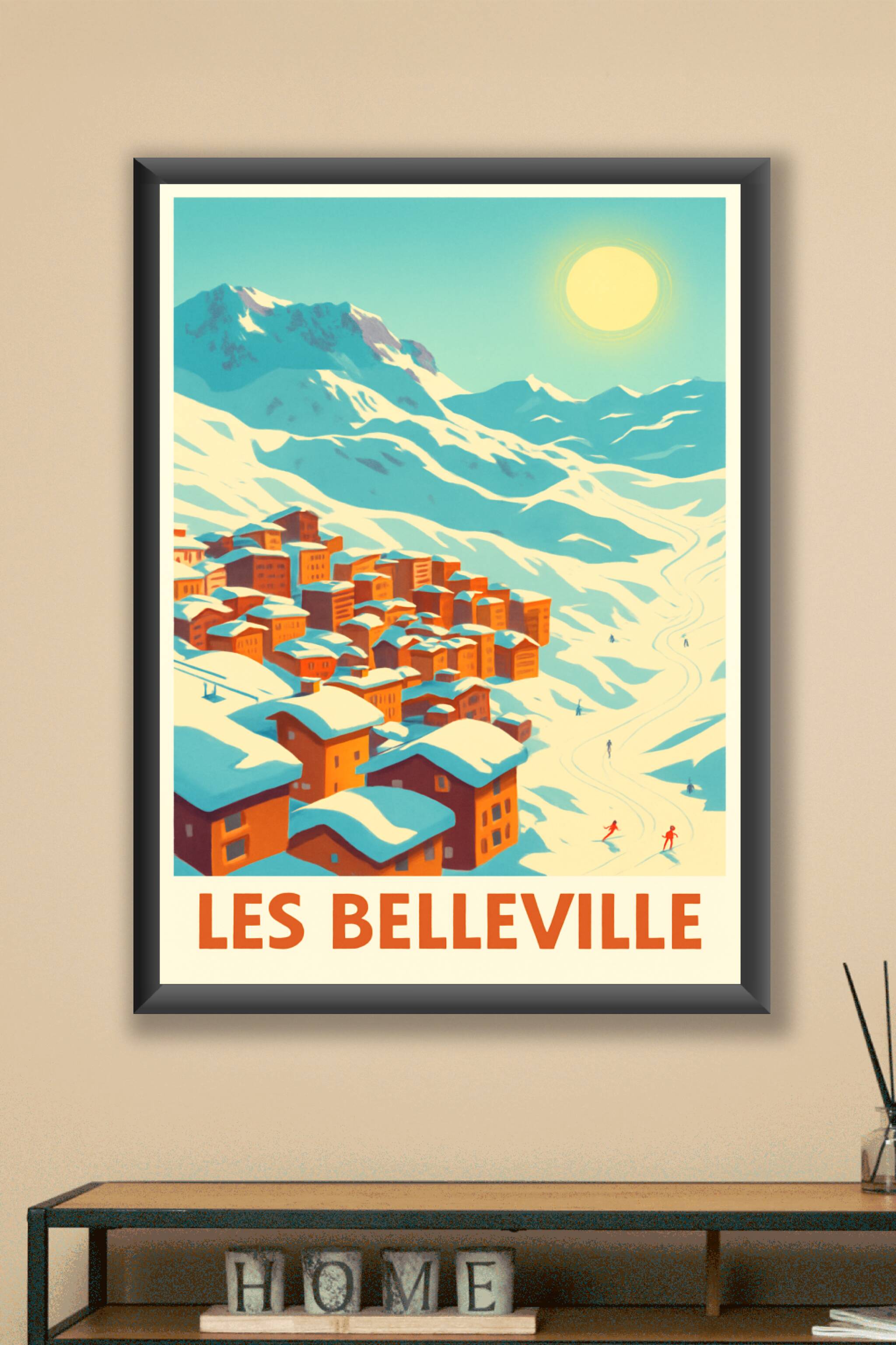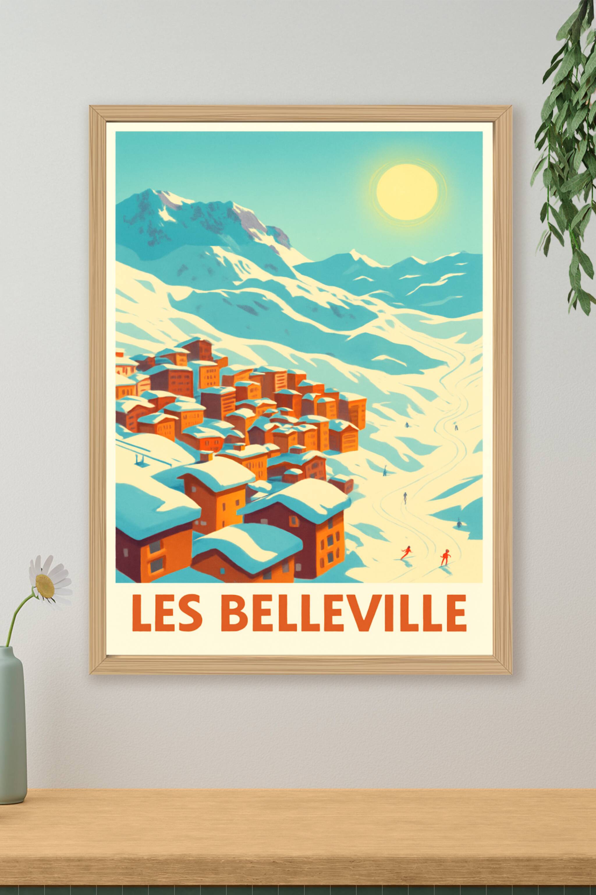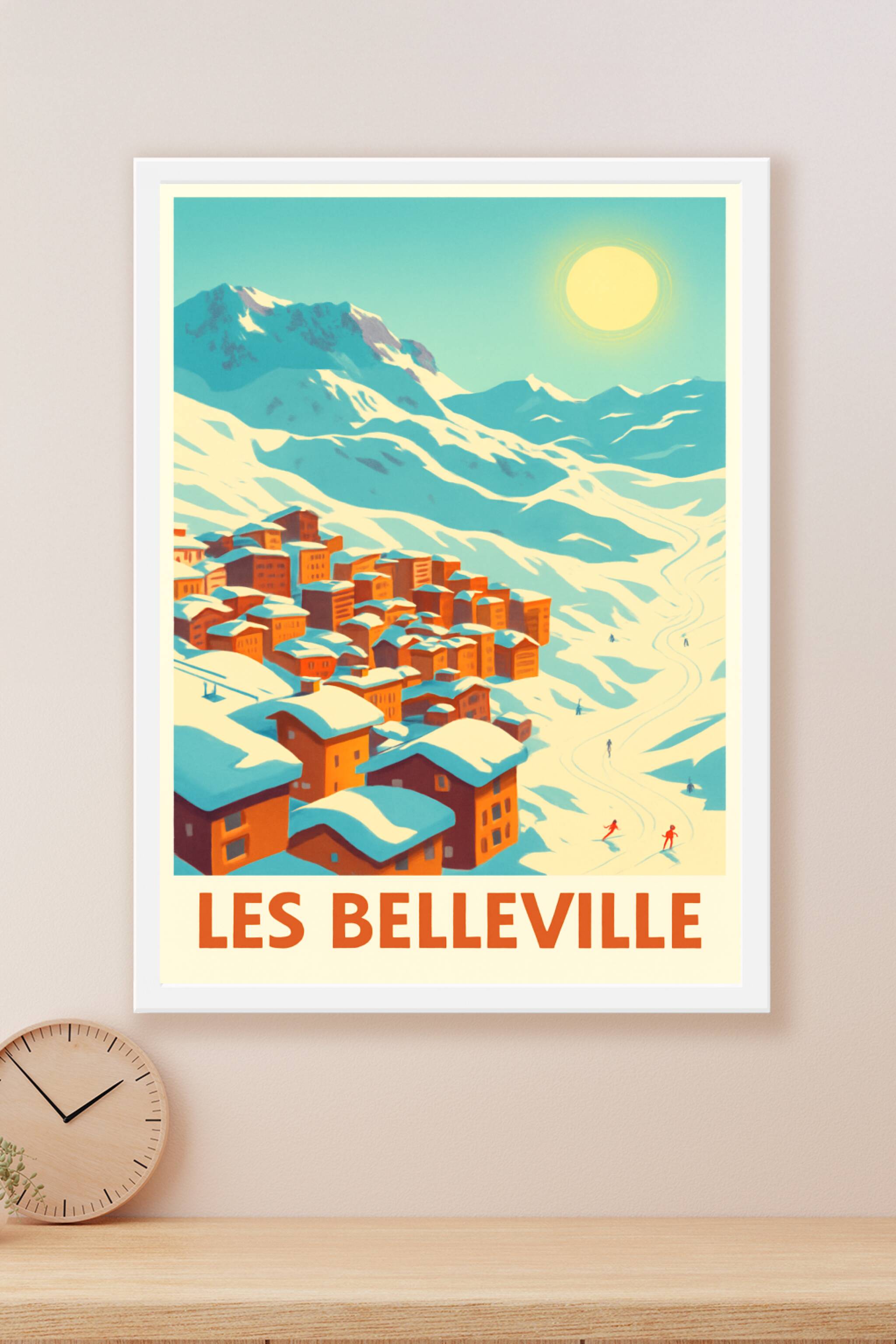 Découvrez la beauté hivernale des Belleville avec cette affiche au style vintage, mettant en scène un village enneigé niché au cœur des montagnes. ...