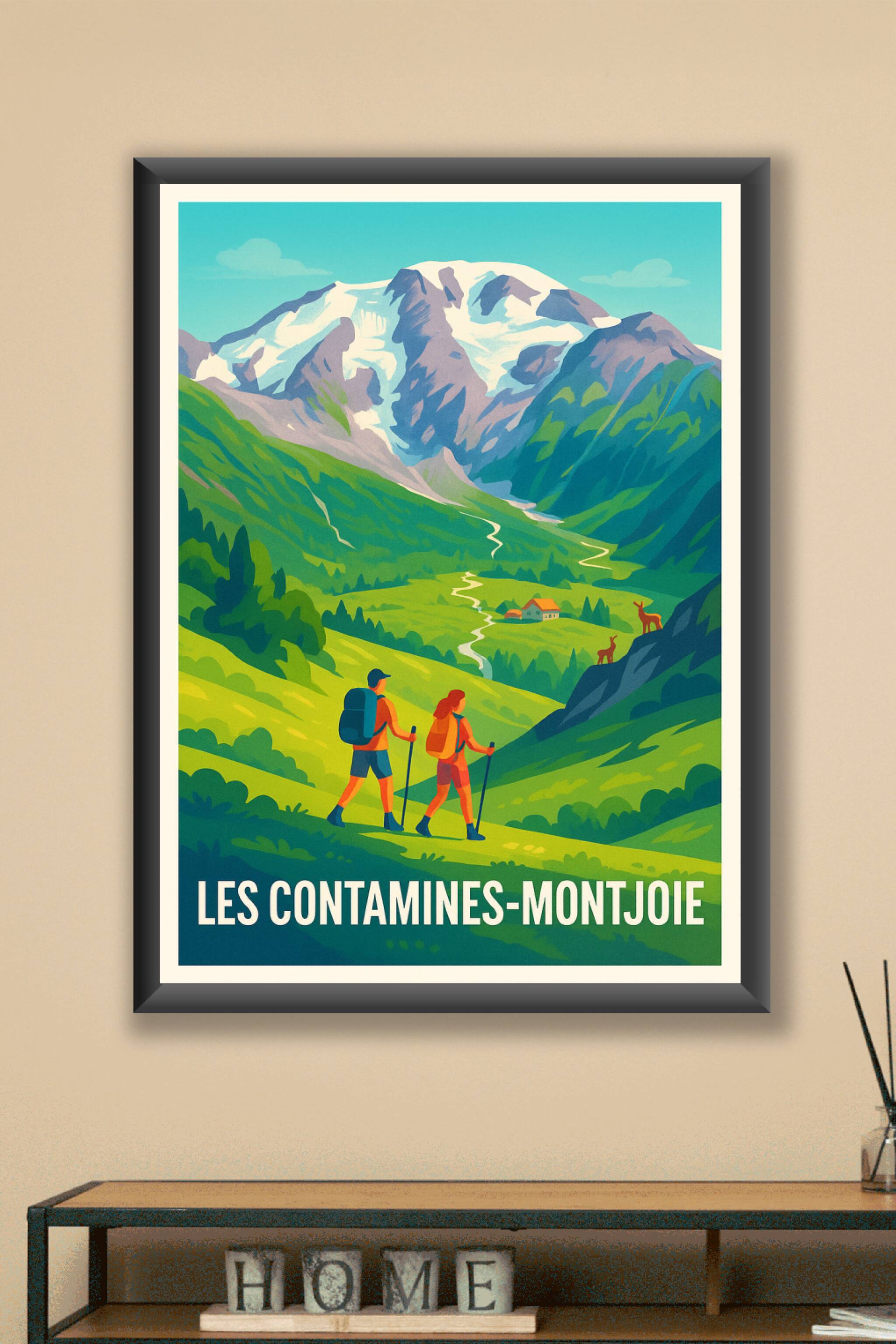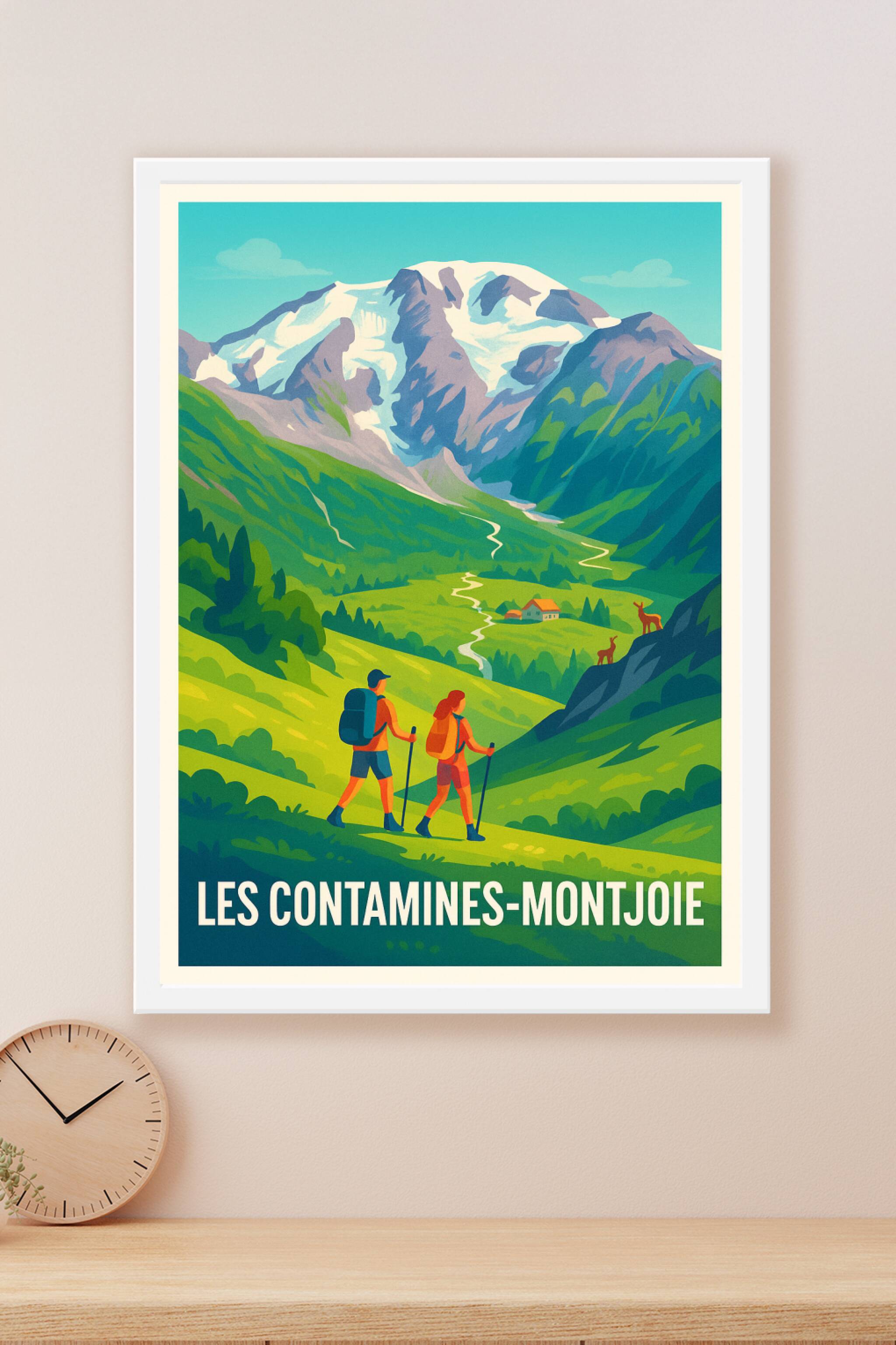 Découvrez la beauté époustouflante des Alpes avec cette affiche vibrante illustrant une randonnée au cœur des paysages majestueux des Contamines-Mo...