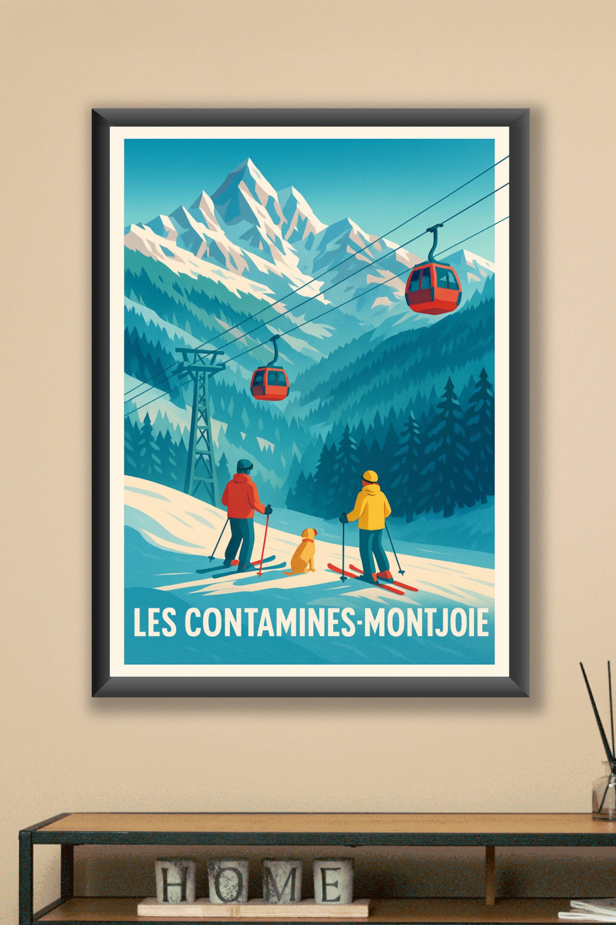 Découvrez la magie des Alpes avec cette affiche vintage représentant Les Contamines-Montjoie, une destination prisée des amateurs de ski et de natu...